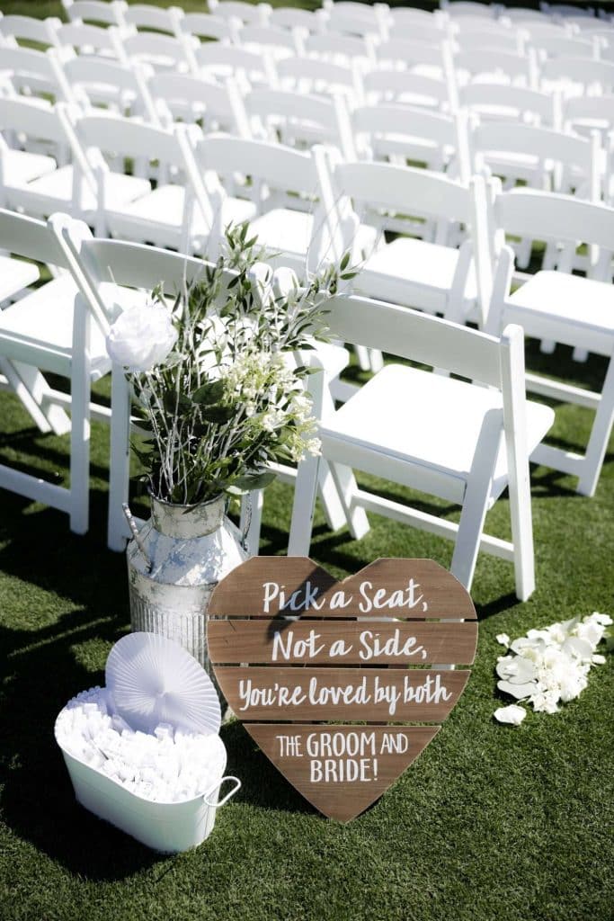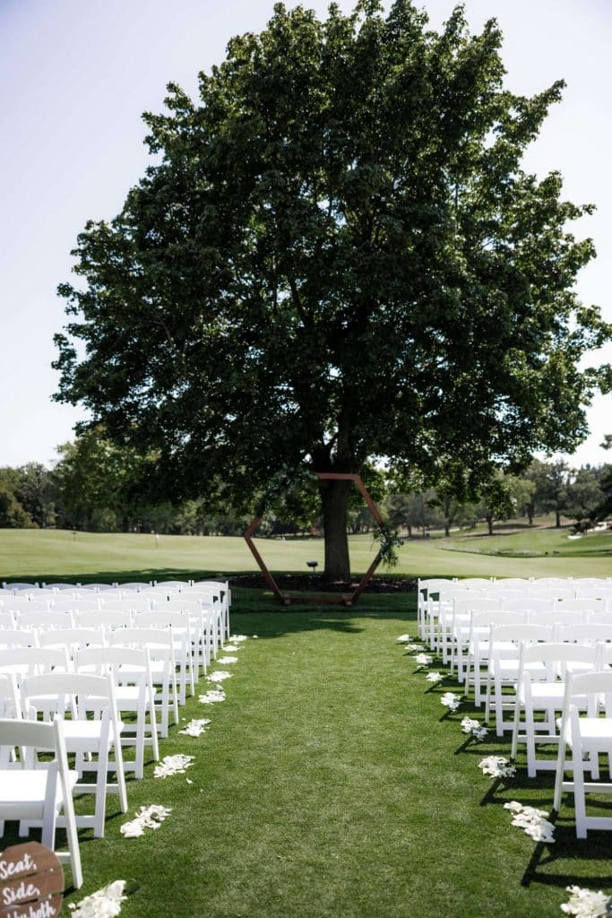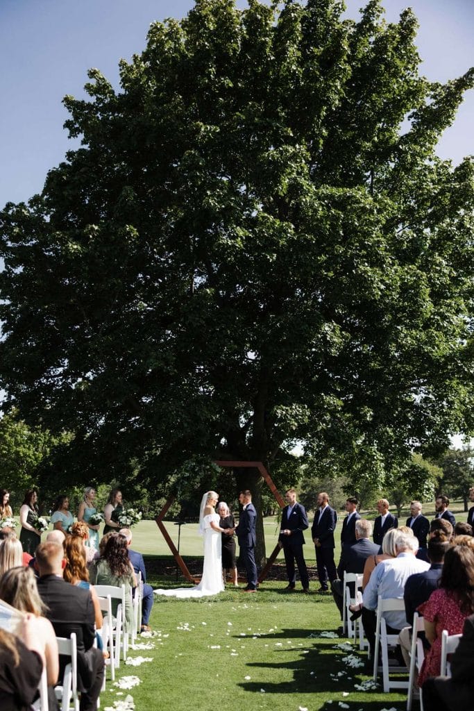 Jordan shared that “Our ceremony took place outside on the patio of our venue. There is a putting green in front of a ginormous, beautiful tree. My favorite part was walking up to the glass patio doors with my Dad before walking down the aisle and looking at everyone standing at their seats. It looked like every single seat was taken and that just made my heart so full to know we were surround by all our loved ones!”