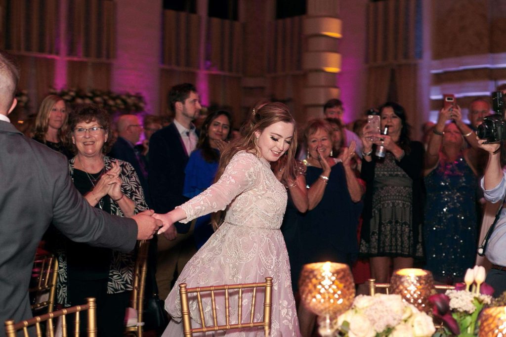 All food and drink came courtesy of Bartolotta Catering. In fact, Vanessa and Sean even chose a Bartolotta restaurant for their rehearsal dinner: Bacchus. “The food was amazing and the atrium room is beautiful!” At the wedding, hors d’oeuvres were passed and dinner began with a Caesar salad. Next came the guests’s choice of filet mignon, Tuscan chicken, or salmon. Late-night food included sliders, pulled pork sandwiches, and fries.