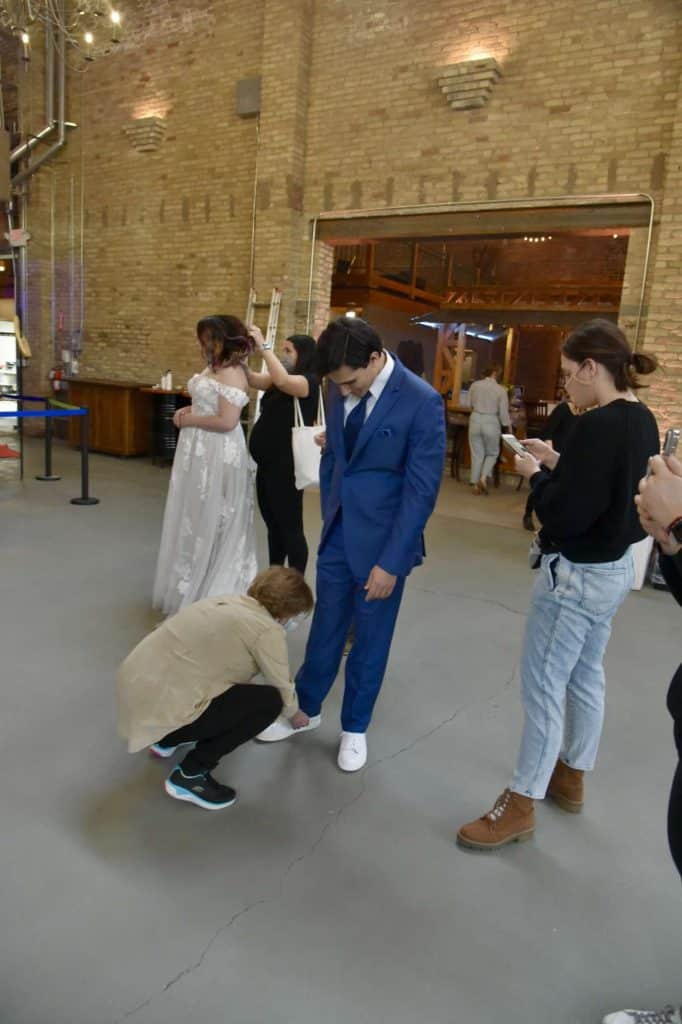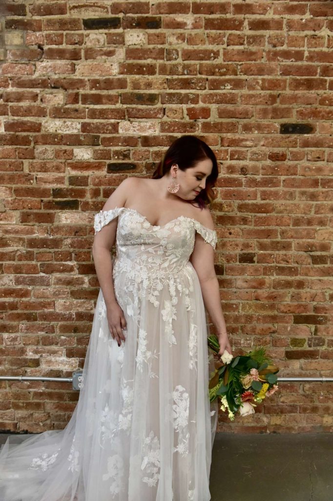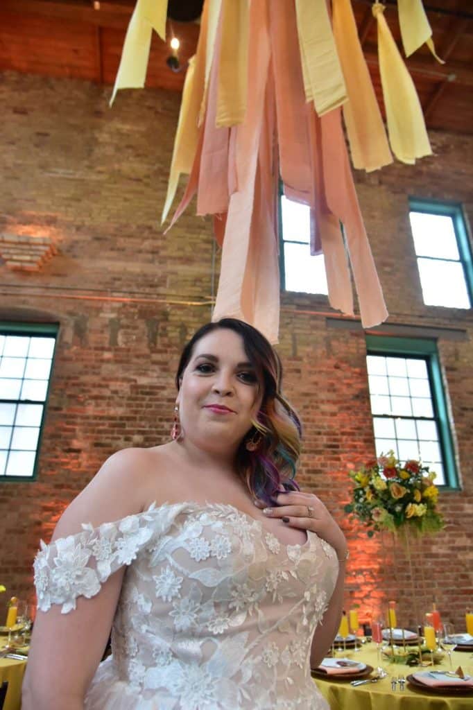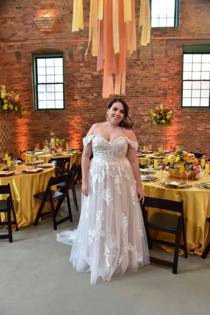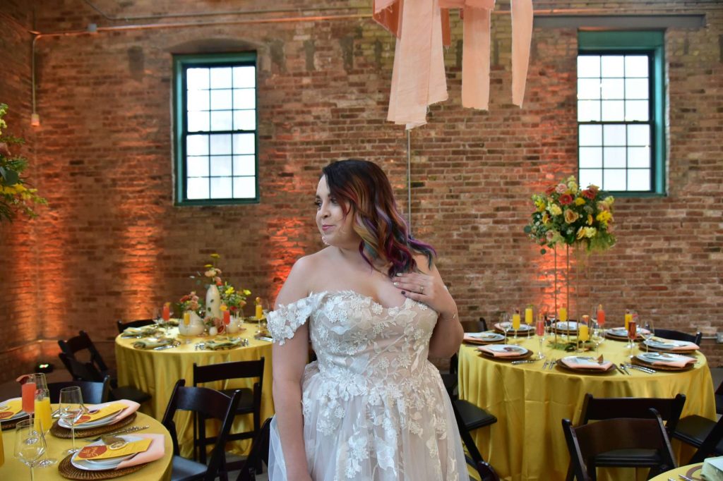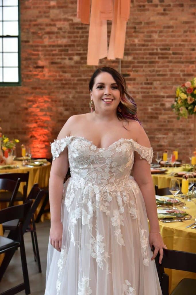 The second dress I put on was the whimsical wedding dress, detailed with off-the-shoulder lace straps, and floral appliques. The moment I put on the dress, it felt like it was made for me! Not only was it comfortable, but the cut and shade looked breathtaking! I did need some help carrying the dress as I walked down the stairs and to the reception area. Again, I was able to take some photos with the bride. Once we were done posing together, I was given the opportunity to do some shots with the tables in the reception area, as well as in front of the beautiful brick that surrounded the venue.