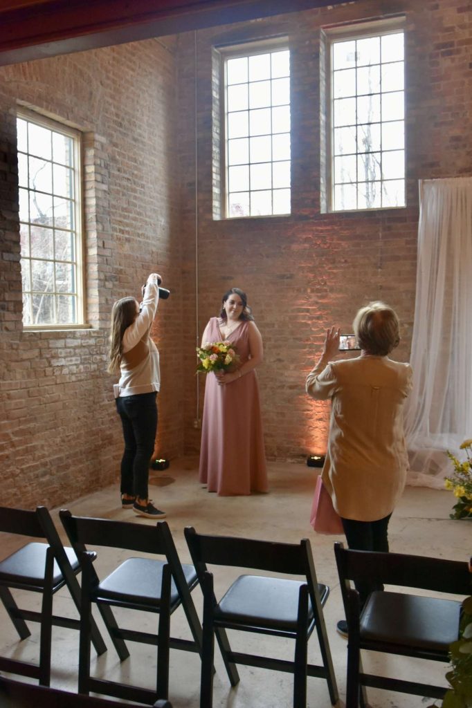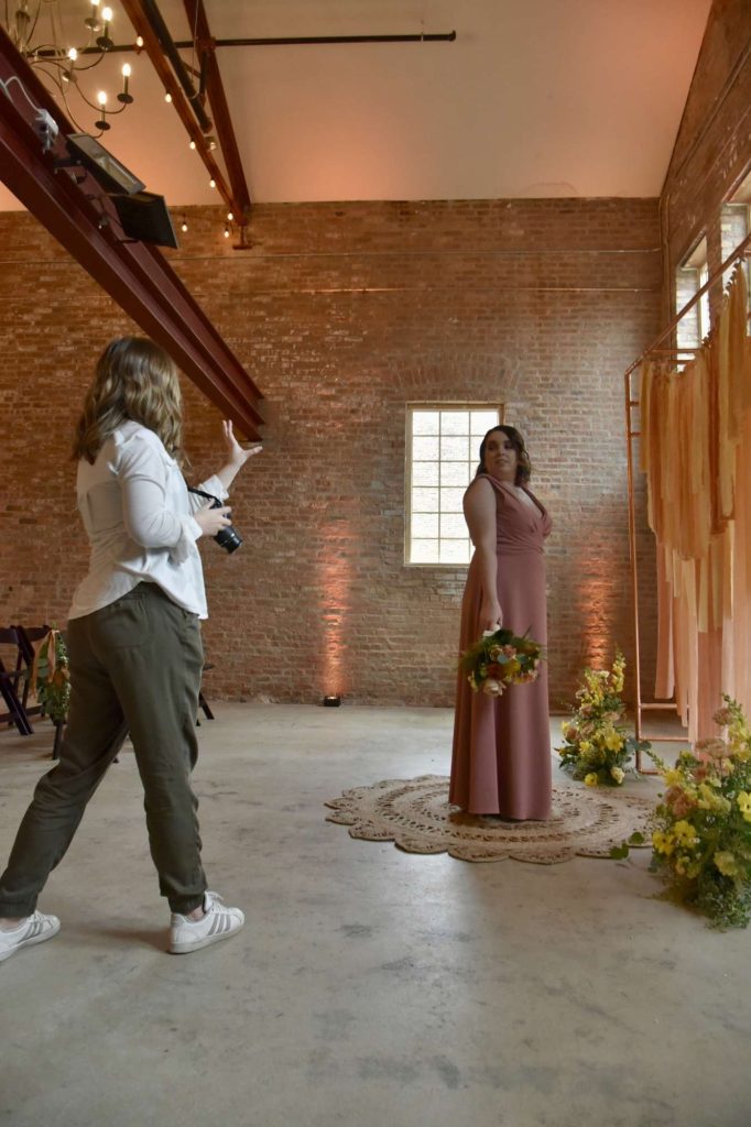 The first setting for the photoshoot took place in the ceremony space. I was able to pose with the bride, as well as for some individual photos. The guidance I was given by the photographer, and videographer paired well with watching the poses that the model was giving. Although I had never had modeling experience before, it was fairly easy to catch on. After many laughs, beaming grins, and bouquet and dress swings, it was time to switch to the next location.