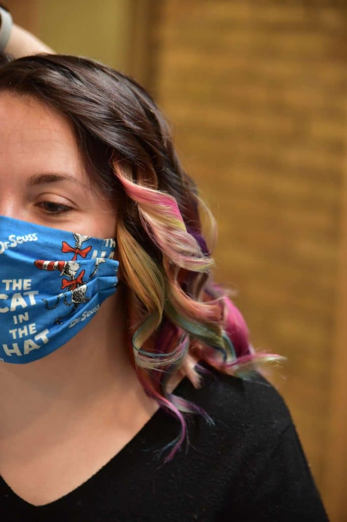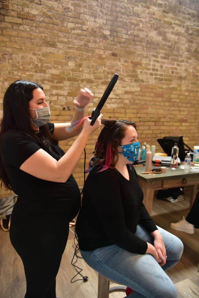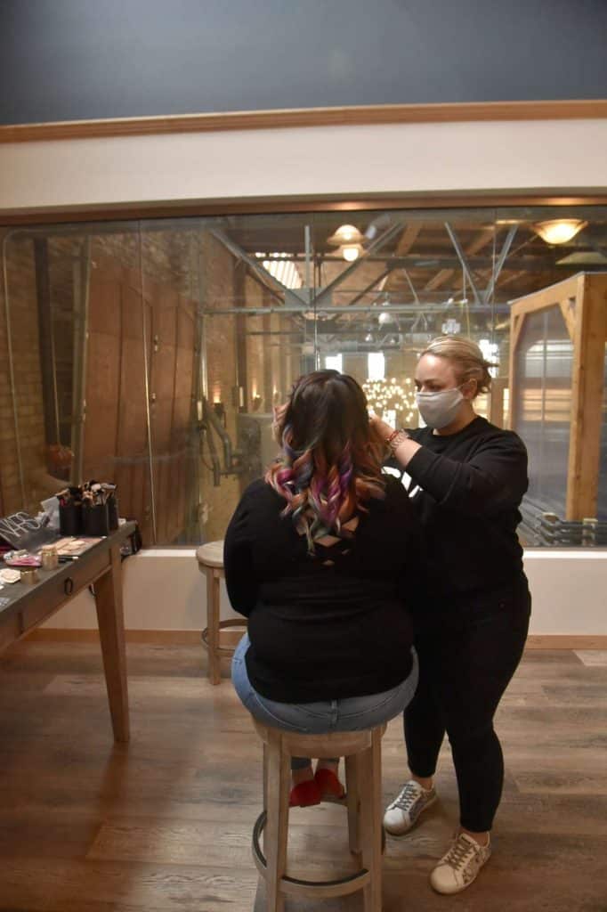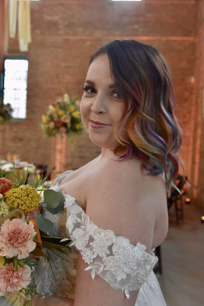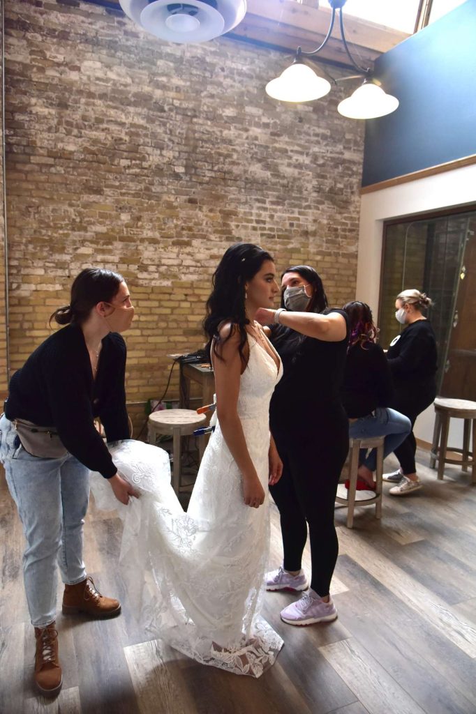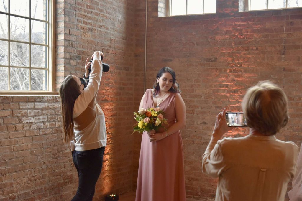 After taking in the sights of the photoshoot, Deb officially introduced herself and we took a brief tour of the different areas that would be photographed before reaching the bridal suite. I was introduced to both models, as well as the stylist and hair/makeup artists. Everyone was very welcoming and made me feel like I had done this before. I was shown the different gowns that I would be modeling as a bridesmaid, as well as a very whimsical bridal gown. I knew that I was modeling a few bridesmaid dresses, but I did not expect to wear a wedding dress. Even though I already had picked out my dream wedding dress, I wasn’t going to turn down the opportunity to wear a beautiful wedding dress and be photographed in it!
