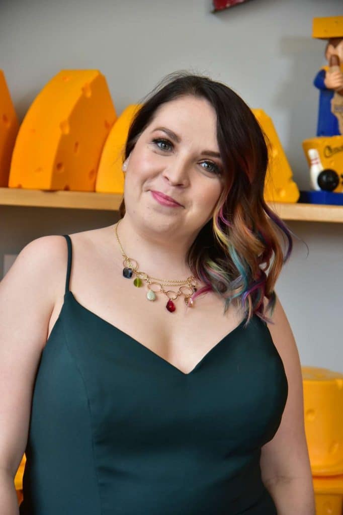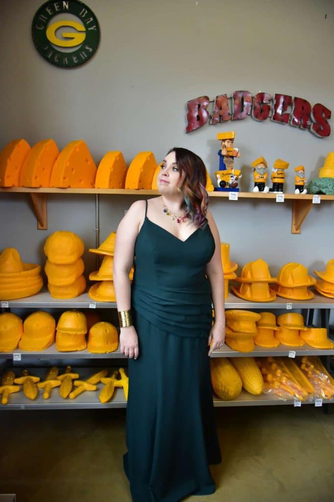 After our time in the Original Cheesehead Factory, I returned back to the Factory and continued with a few more poses before my time was up. It was wonderful to escape the world of teaching for a day and have the opportunity to not only be a part of such a whimsical photoshoot, but also see the behind-the-scenes. The photoshoot made such an impact on me, so much so that I ended up caving — I purchased the multi-jeweled necklace that I had worn with my forest green bridesmaid dress. I felt absolutely stunning during every moment of it, and I am so thankful that I was given this opportunity!