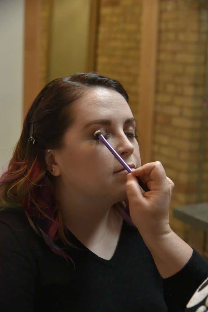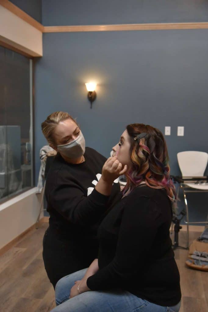 Once I was able to look at the different dresses that would be modeled by both me and the bride, it was time to go into hair and makeup. Prior to sitting down with the hairstylist, I was able to see the beautiful work that the makeup artist had done, and the bride looked stunning! I knew I was in good hands with both artists. Some time passed and it was time to go into the first bridesmaid dress. Before changing into the dress, I just had to get a glimpse at what the artists had achieved. Upon looking in the mirror, I was stunned at the work that the two had done. I felt absolutely gorgeous, and could only imagine how the photos would turn out! The first dress I put on was a mauve colored, floor length dress with a v neckline.