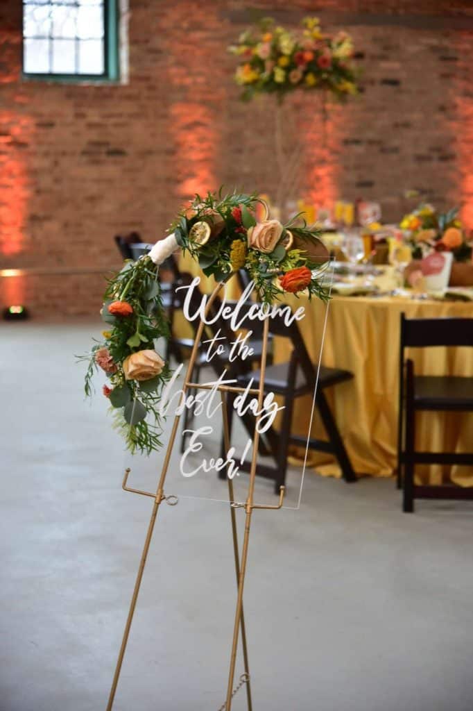 Amidst the industrial setting of the Factory, chandeliers were adorned with shades of peach, coral, and yellow ribbon cascading towards the tables. The tables were draped with mustard color table cloths, which were decorated with a variety of floral arrangements tying in an element of surprise – citrus slices were scattered throughout the centerpieces.