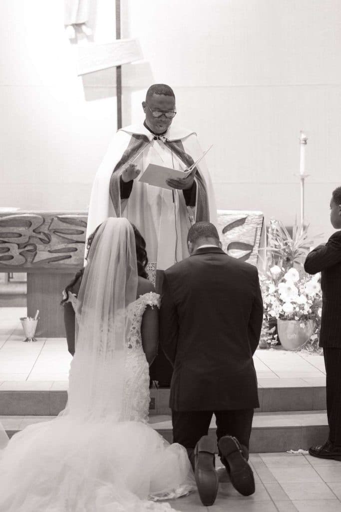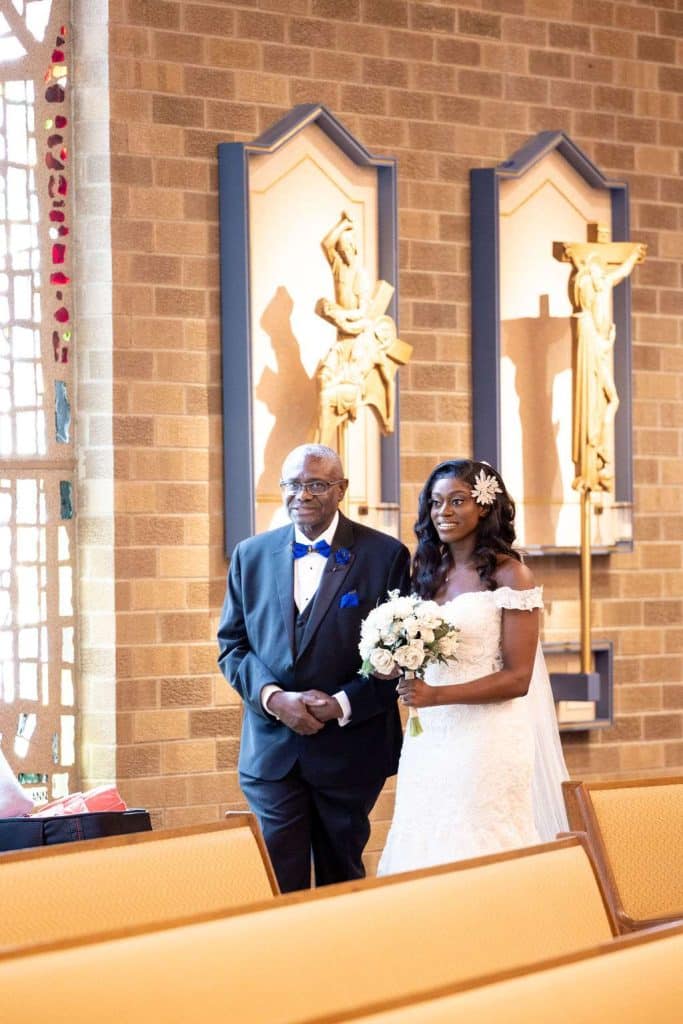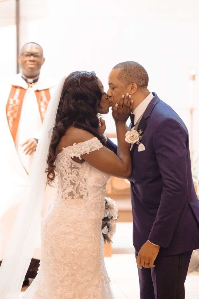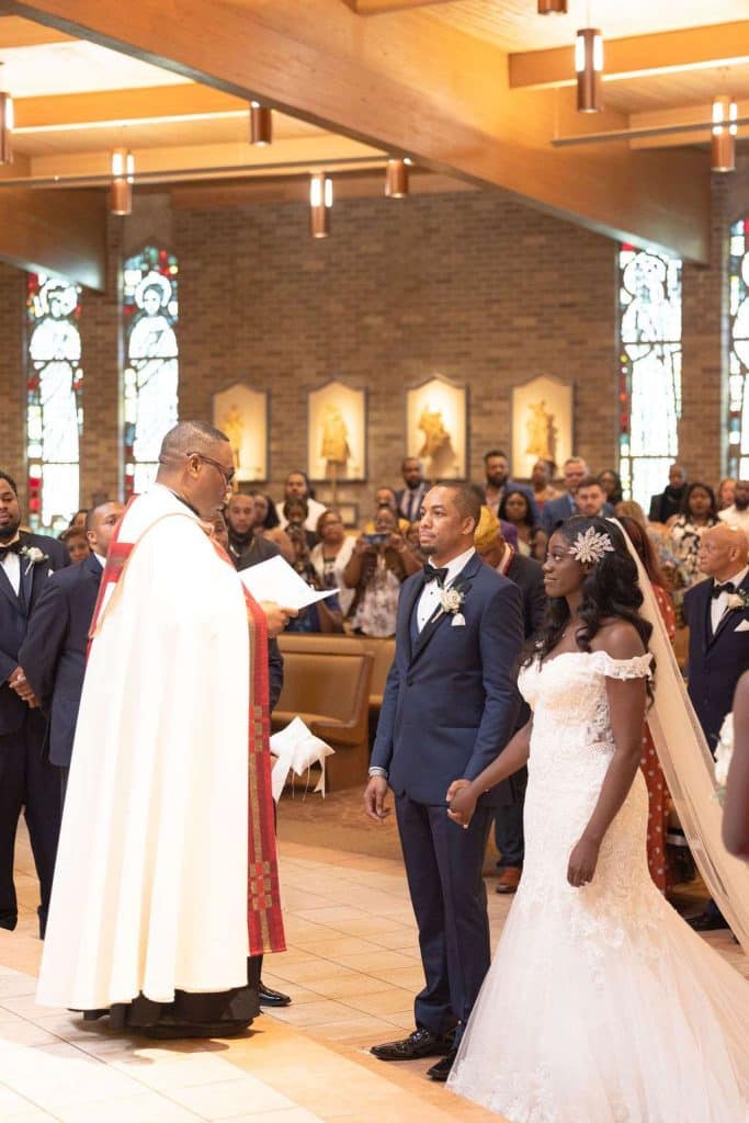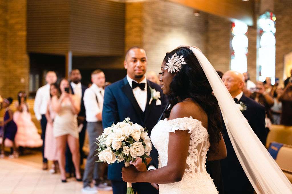 The next day, the American ceremony was held at St. John Vianney Parish in Brookfield, where they had a traditional Catholic wedding. The couple had so many guests show up to the church and felt overwhelmed with love. Terrance’s favorite moment was watching Chidera walk down the aisle with her father. Chidera’s favorite part was making her promises to Terrance at the altar. The way in which Father Alex, who is Nigerian and speaks Ibgo, officiated the wedding and the amount of people in our bridal party were unique. The priest invited guests who were married for at least 20 years to stand up during his homily.