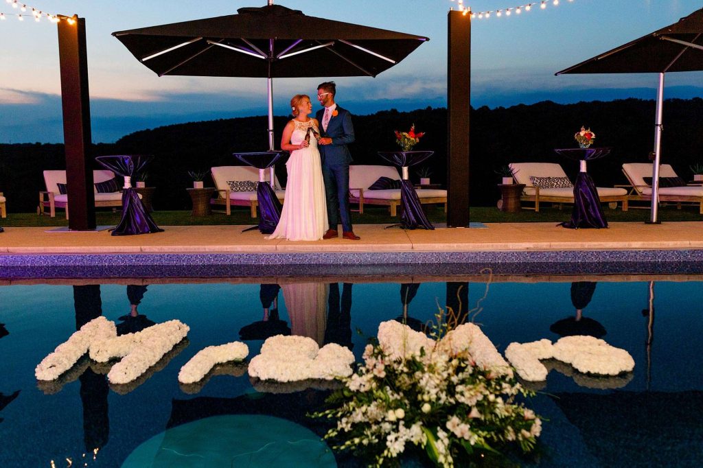 Wedding Consultant: Oscar Sanchez from Ambrosia Events | Ceremony and Reception: Grace’s Parent’s House, Waukesha, WI | Catering: Zilli Hospitality Group | Bartending Services: Bartenders on the Go | Cake Designer/Dessert: Simmas Bakery | Flowers: Ambrosia Events did the floating flowers in the pool along with the greenery on the food table. The flower centerpieces on the high-top tables came from Sendik’s. The bride’s bouquet and the colored flowers in the greenery were wood and came from Southern Blooms Co (online) | Music: Dream City Music | Photographer: Annalise Marie Photography | Linens, Chairs and Candles: Ambrosia Events | Rehearsal Dinner: Mitchell’s Fish Market | Save-the-Dates & Invitations: Zazzle | Officiant: Trevor’s Dad, Jeff | Makeup and Hair: Kory & Ashley from 29ten Salon | Gown: Stella York from Bon Bon Bell | Formalwear: Nick’s Menswear | Rings: Hers – Spence Diamonds His – Etsy shop out of Buenos Aires, Argentina