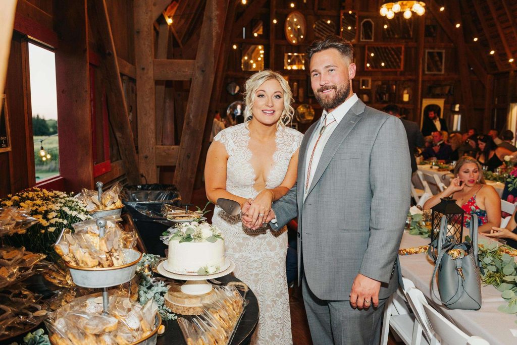 Ceremony & Reception: The Barn at Back Acres Farm | Catering: Gooseberries | Photographer: Jyllianne from Complete Weddings | Music/Entertainment: Complete Weddings & Events |Bartending: Drink Inc | Cake: Family / Grahams 318 Geneva, IL |Flowers: Gooseberries | Invitations: Taylor Slager Designs | Linens: Gooseberries | Rehearsal Dinner: Airbnb – The Downtowner Lake Geneva; ordered from Rigatony’s in Delevan |Makeup Artist: SLT Makeup Artistry |Hair: Courtney Taylor | Officiant: Family Friend | Gown: BHLDN | Formalwear: Von Maur |Rings: Bride: Brilliant Earth, Groom: Ben Claus – Rise Designs for ring; bolo tie: Nick Cooney Tendai designs