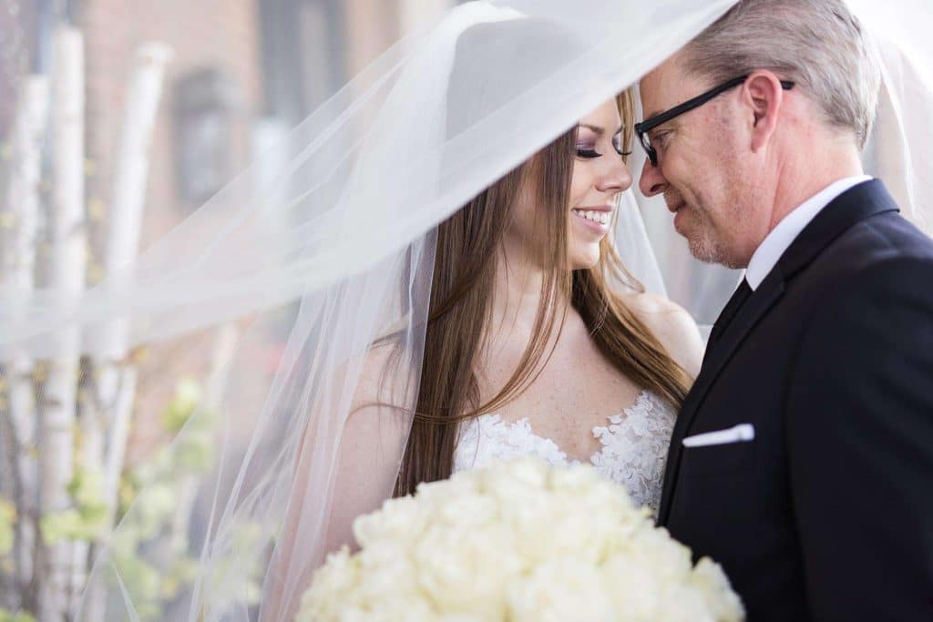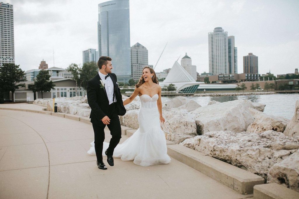 After years of their mom’s scheming to get them together, knowing how compatible they were, Sam and Caroline tied the knot at downtown Milwaukee’s famous Astor Hotel. Their June wedding evoked old Hollywood glamour incorporating colors of champagne, black and white.