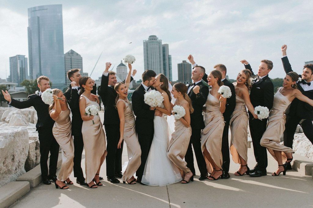 Ceremony, Reception (including Linens and Chairs, Catering): The Cooperage | Bartending: The Cooperage, Boone & Crockett | Photographer: Hannah Toldt Photography | Consultant: Midwestern Bride (Alex) | Invitations: Paper Source | Rehearsal Dinner: Oak Barrel | Cake: Craig’s Cake Shop (Verona, WI) | Chalkboard/Custom Signage: Alyssa Damaschke (sister-in-law) | Flowers: Atmospheric Floral | Music/Entertainment: Kidron Music | Photobooth: Kidron Music | Officiant: Marcus Hawkins (friend) | Makeup Artist: Glam Gals Hair & Makeup | Hair Stylist: Impressions (Molly @mollydoeshair.mke) and @glamgalswi | Gown: Sarah Seven from Strike Bridal Bar | Bridesmaids’ Gowns: Revelry (x2), Reformation, Lulu’s, and Show Me Your Mumu). The Bride sent the bridesmaids a color palate and they got to pick the dress (including style and fabric) from where they wanted. | Formalwear: Bjorn’s Clothing | Rings: Kesslers Diamonds | Jewelry: Cival Collective (bracelets) Olive & Piper (earrings and hairpiece)