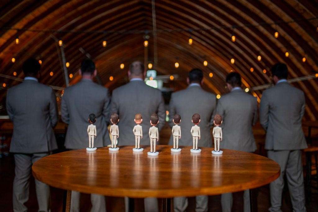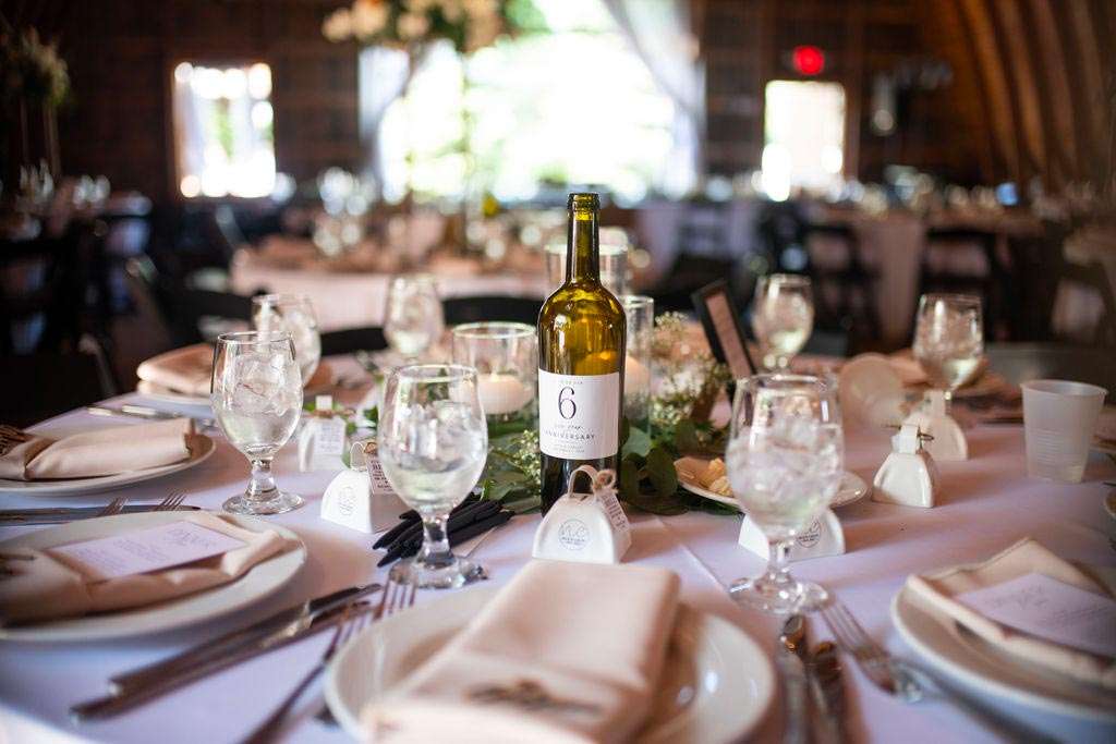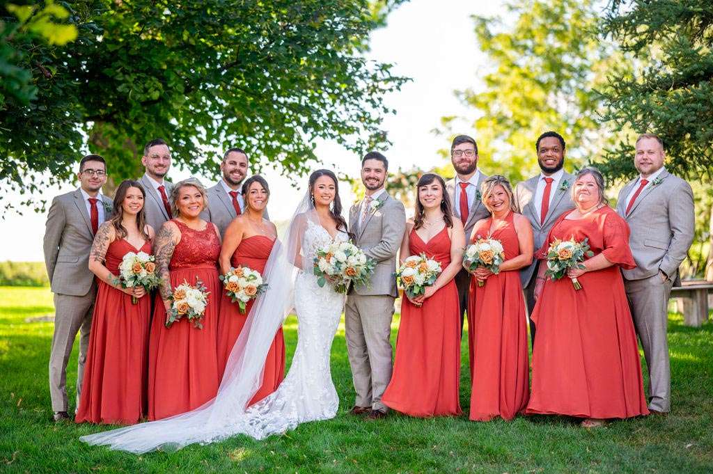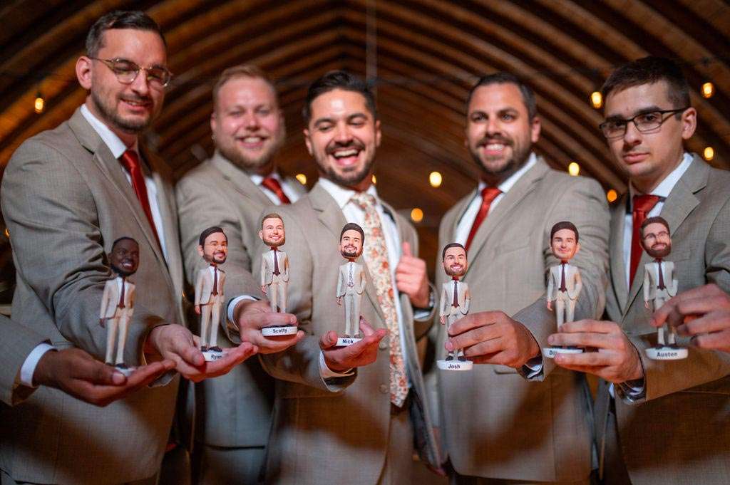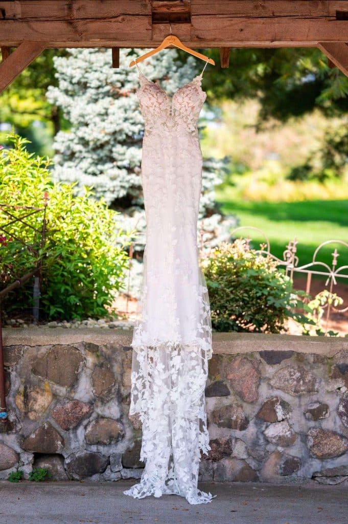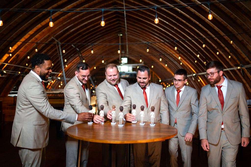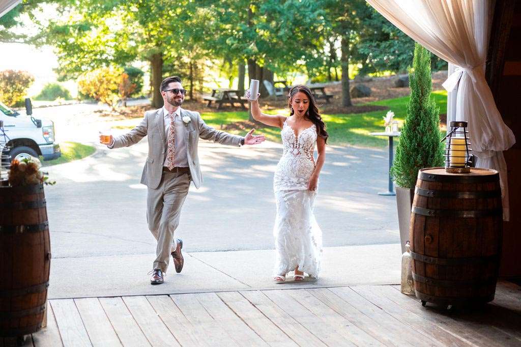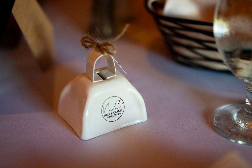“The reception started with the grand march. Our wedding party had some unique and creative entrances! Nick’s dad then gave a wonderful welcome speech. While everyone was eating, Nick and I went around and took a picture with each table. Nick’s sister, Danielle, and my best friend, Carly, gave speeches. A unique touch was that we had customized cow bells at each place setting as our favors. We chose cow bells because Nick works for a hockey team and because we were in a barn. We instructed everyone to ring the cow bells if they wanted us to kiss, instead of clinking a glass. We did our first dance and then Nick danced with his mom. We also did a bouquet toss and a garter toss. We also had a surprise guest, the Milwaukee Admiral’s mascot Roscoe. He danced with us and took photos with everyone. We then danced the night away!”
