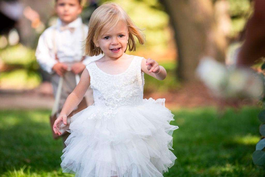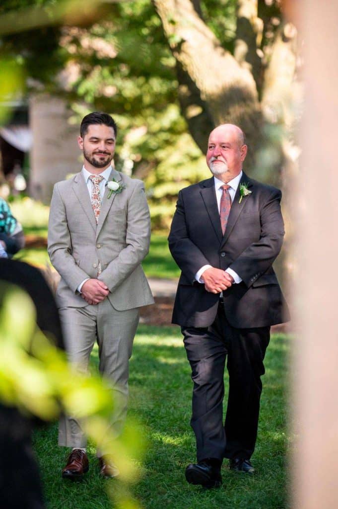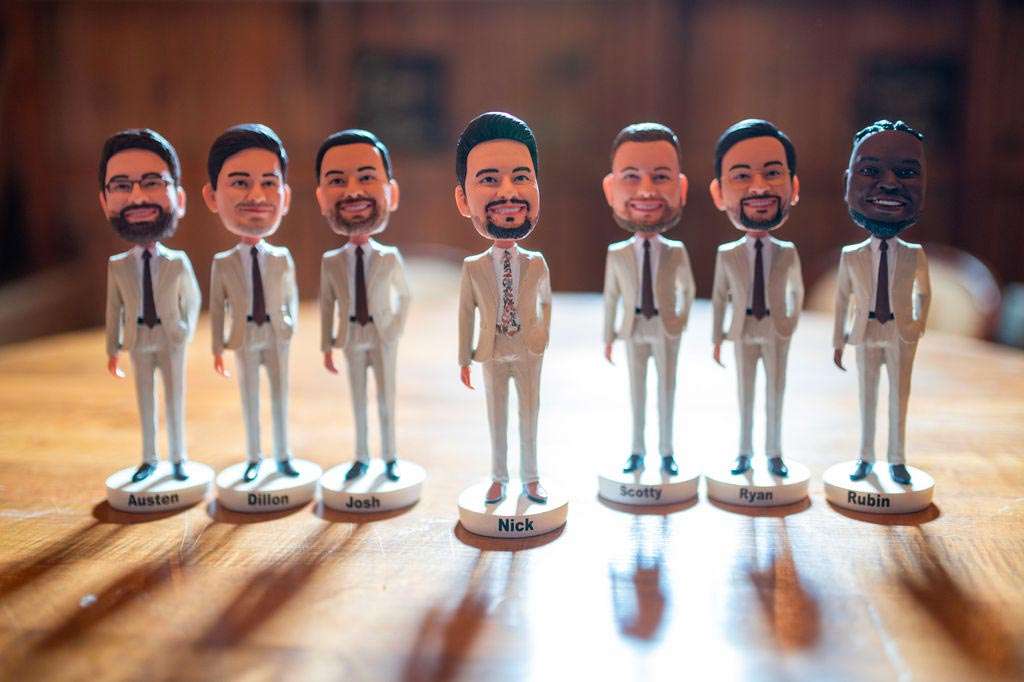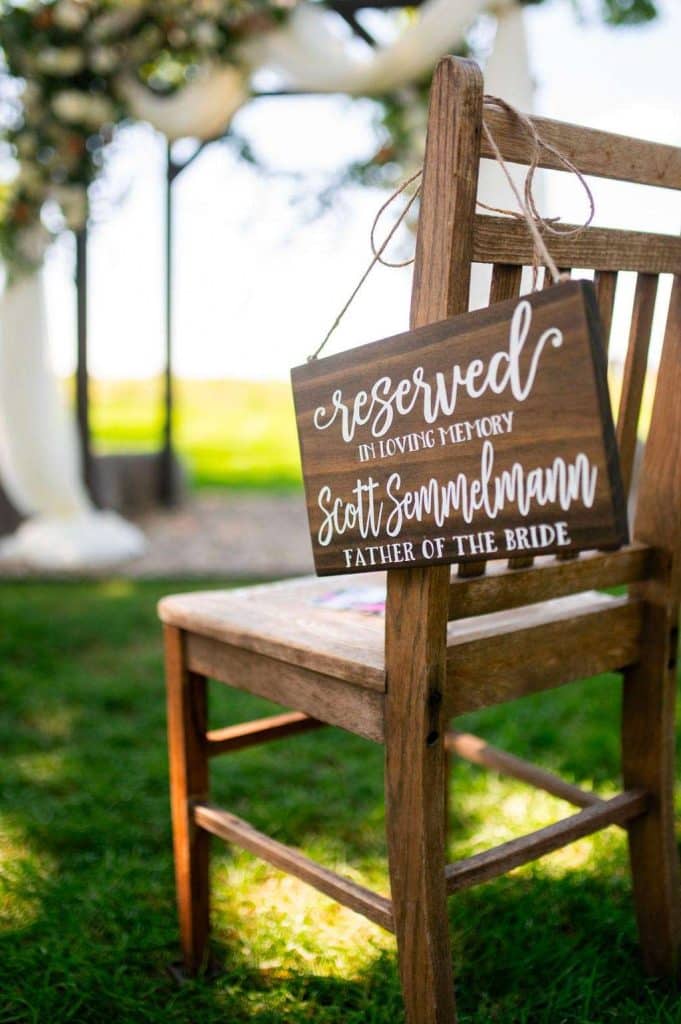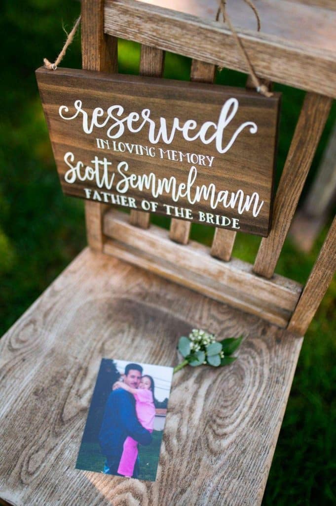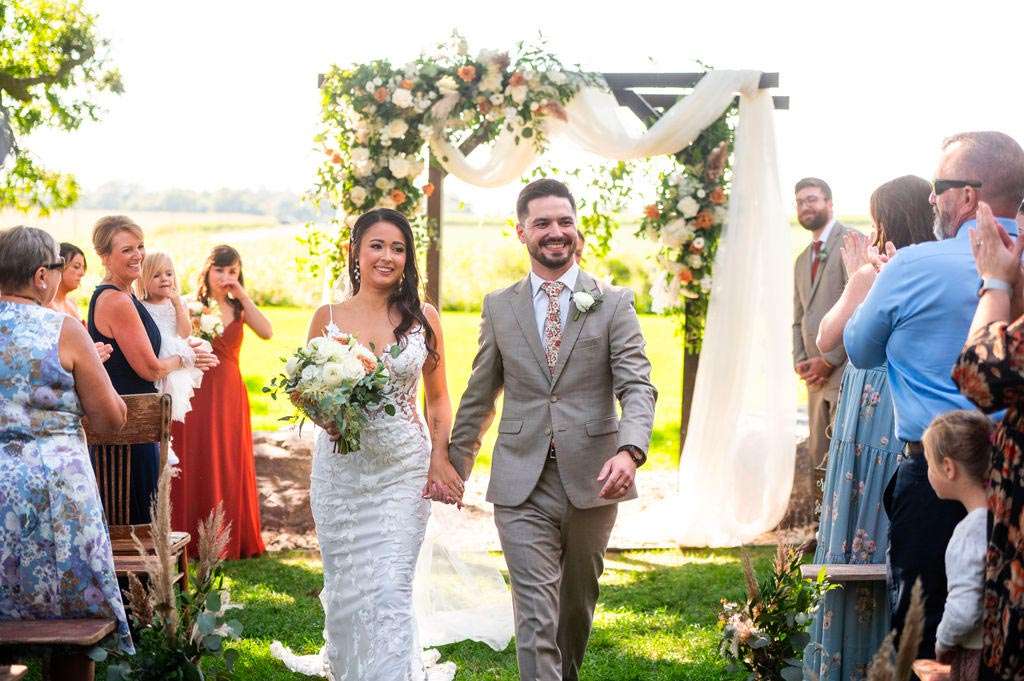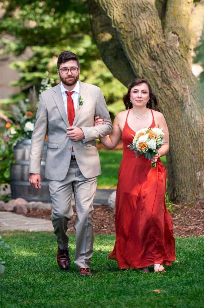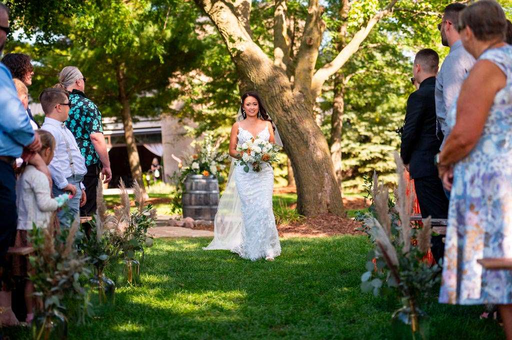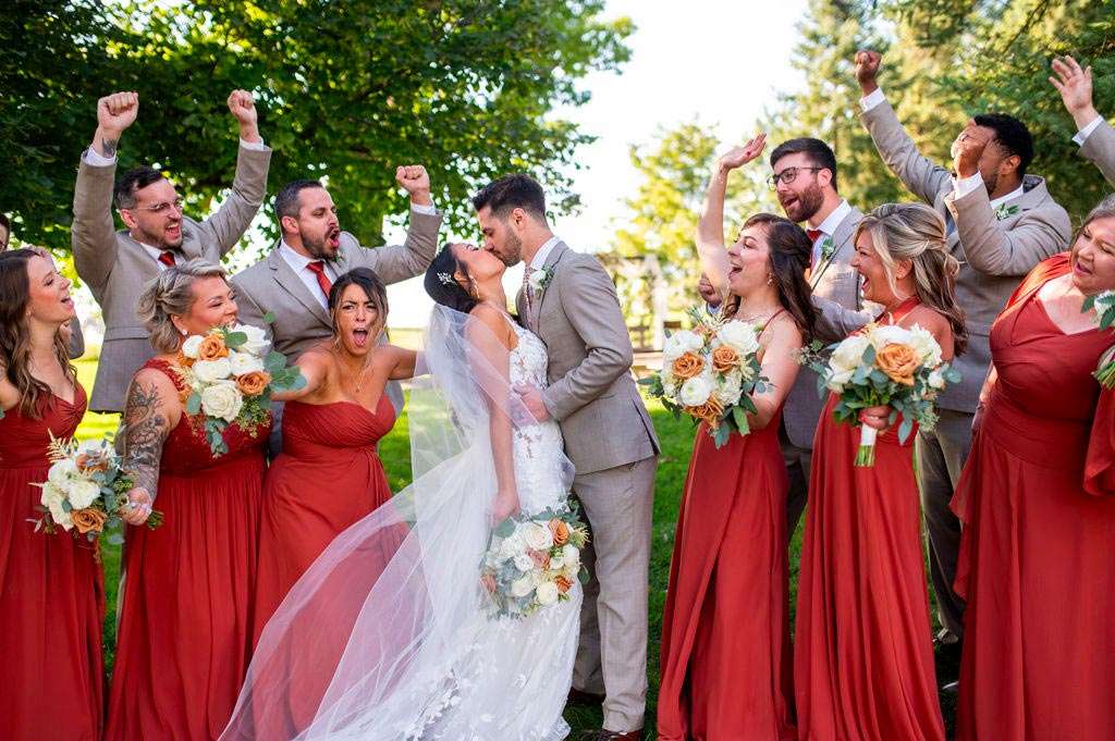 “The reception started with the grand march. Our wedding party had some unique and creative entrances! Nick’s dad then gave a wonderful welcome speech. While everyone was eating, Nick and I went around and took a picture with each table. Nick’s sister, Danielle, and my best friend, Carly, gave speeches. A unique touch was that we had customized cow bells at each place setting as our favors. We chose cow bells because Nick works for a hockey team and because we were in a barn. We instructed everyone to ring the cow bells if they wanted us to kiss, instead of clinking a glass. We did our first dance and then Nick danced with his mom. We also did a bouquet toss and a garter toss. We also had a surprise guest, the Milwaukee Admiral’s mascot Roscoe. He danced with us and took photos with everyone. We then danced the night away!”