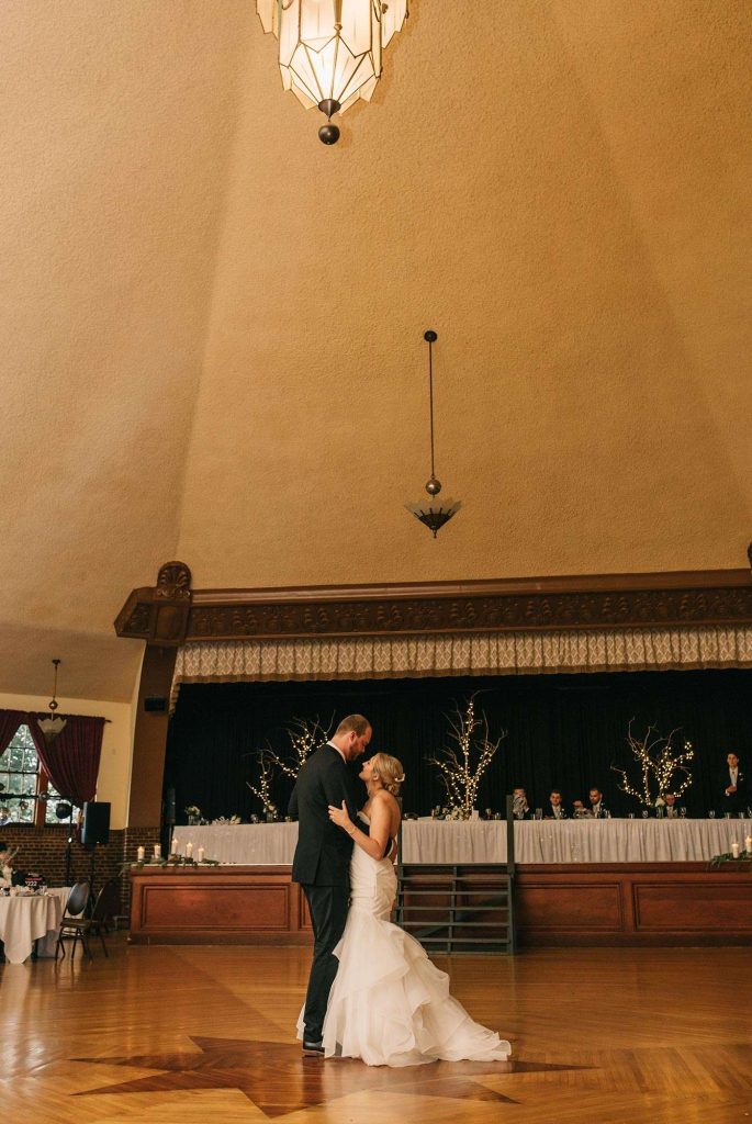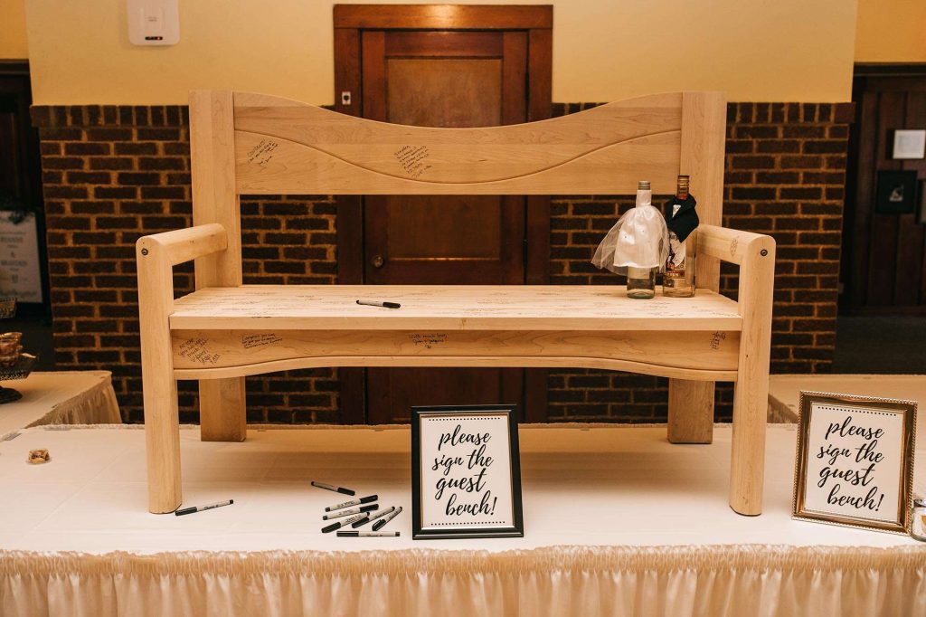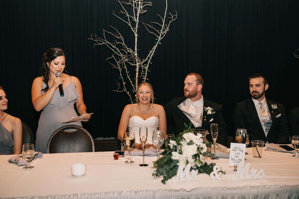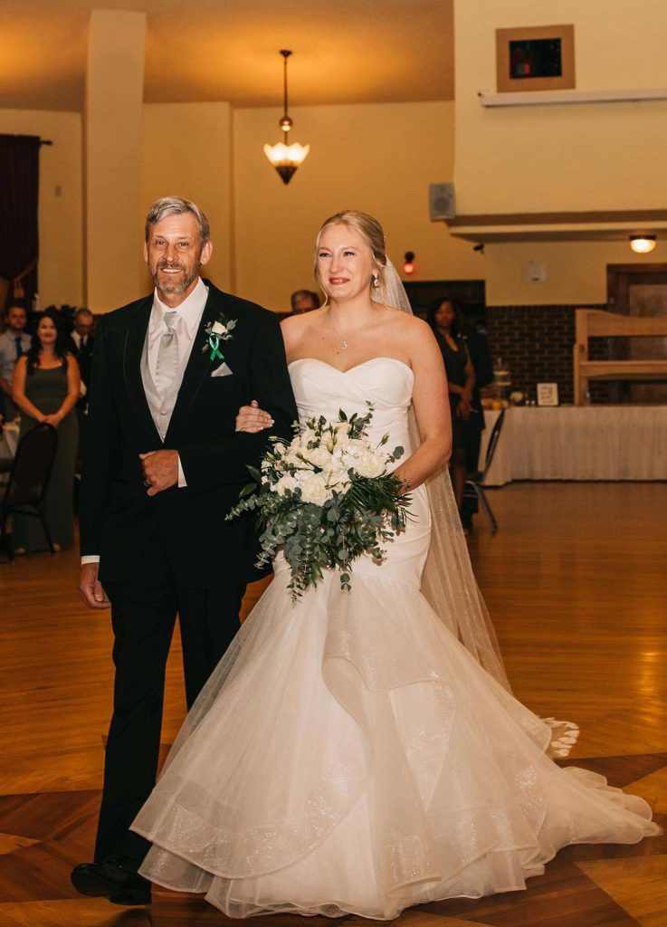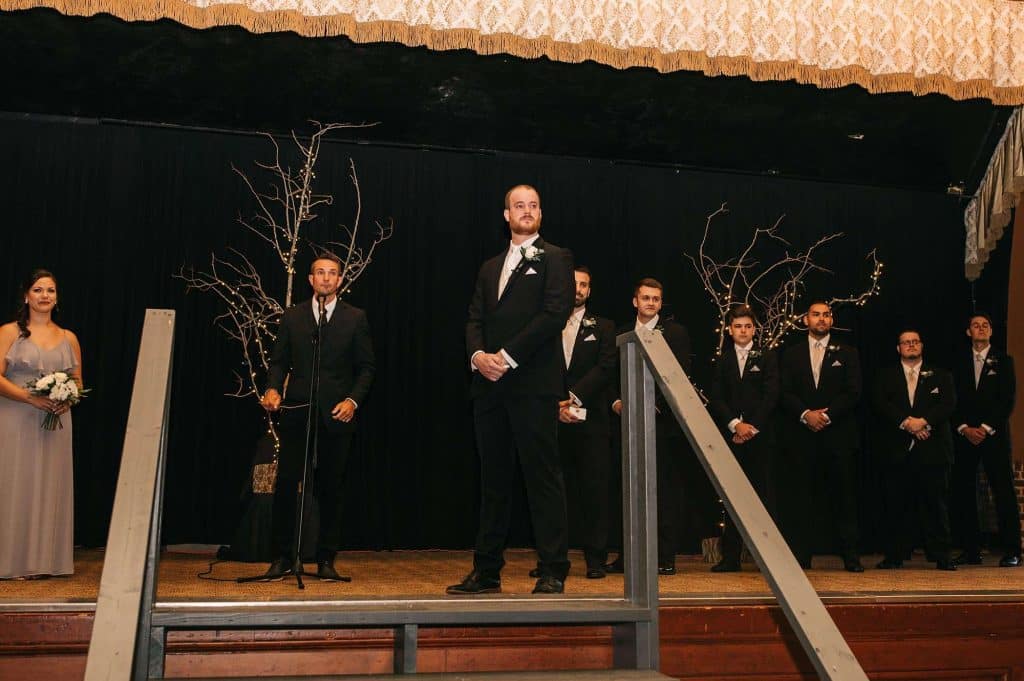 The couple stood on a stage to exchange their vows. Ryanne’s dad built a set of stairs two weeks before the wedding so that she could gracefully walk up the center of the stage, rather than taking the side steps. “The ceremony was centered on ‘love is patient,’ since we had to wait an extra three months for our special day. Our pastor spoke about love being a patient and intentional choice you make each day as a married couple.”
