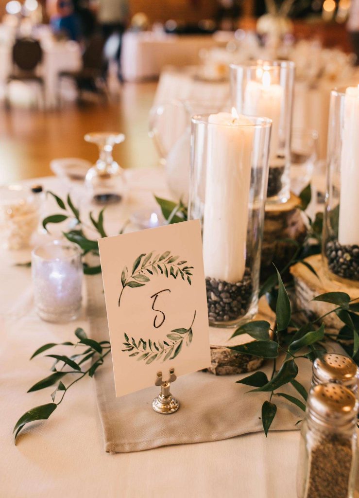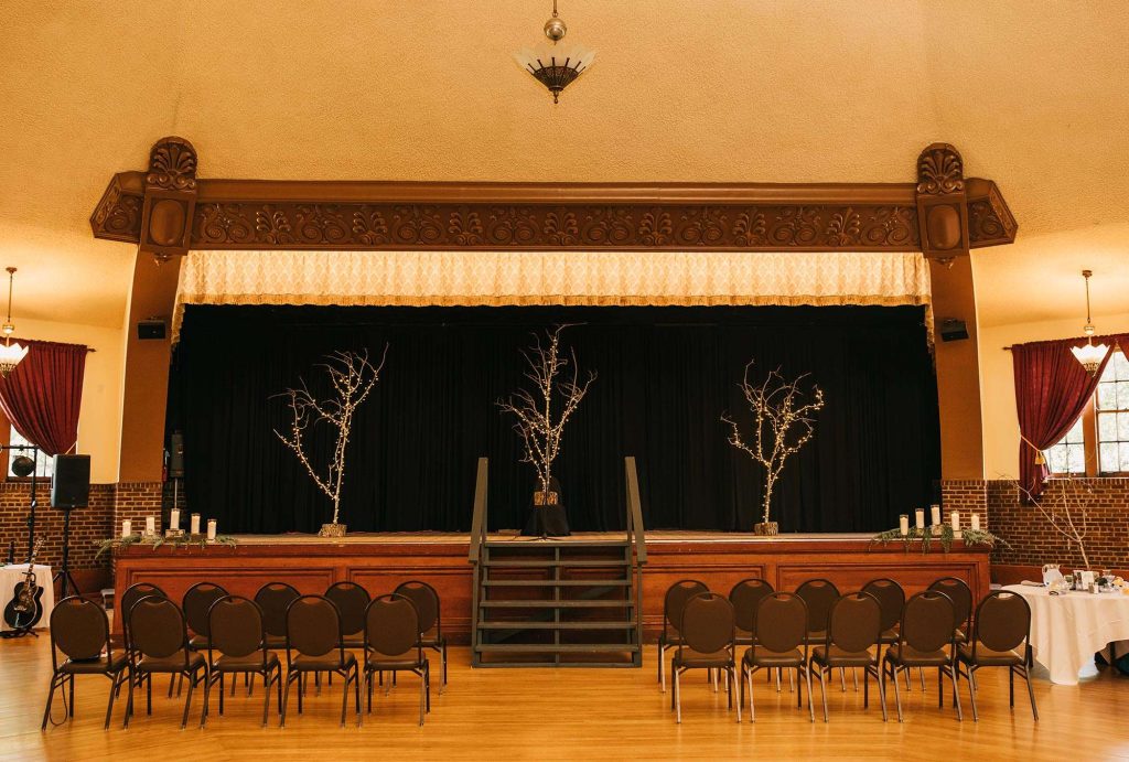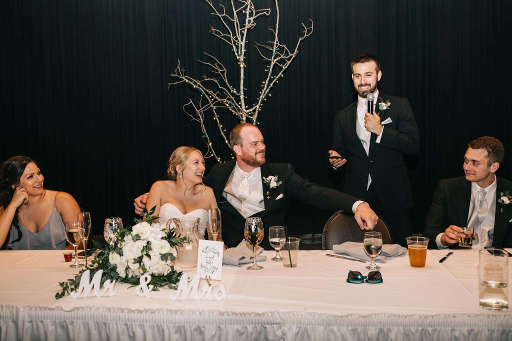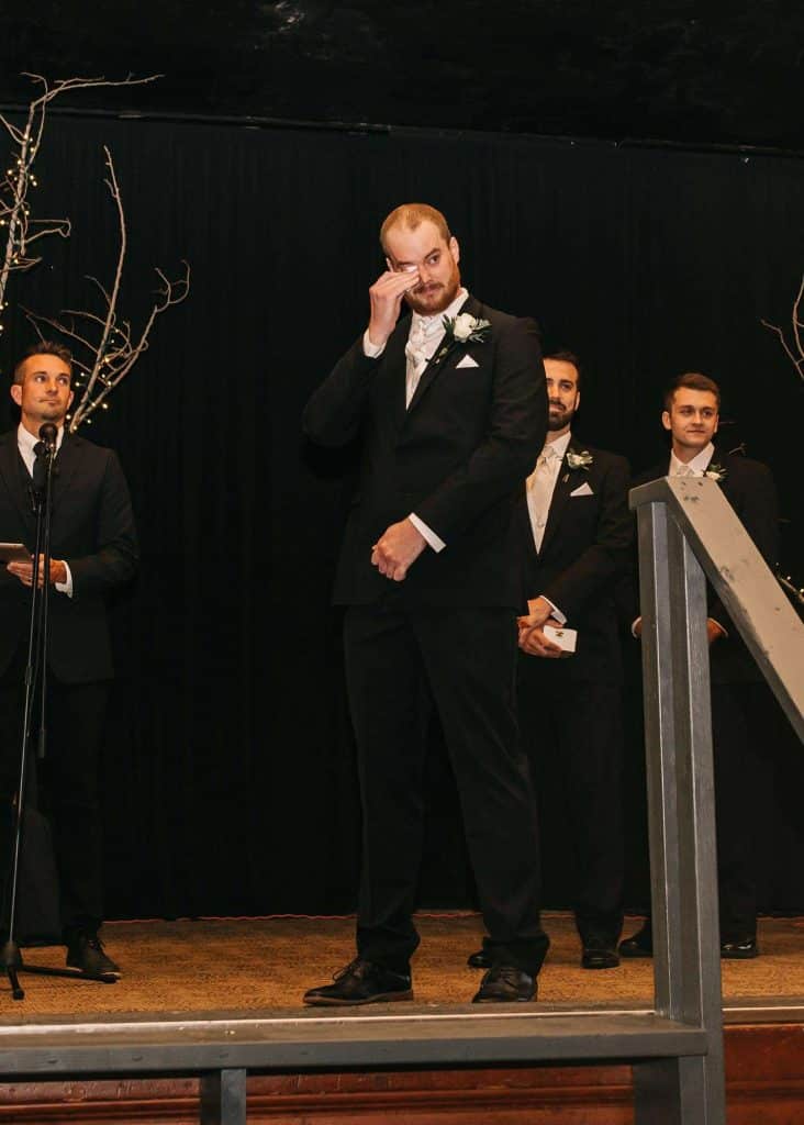 The couple stood on a stage to exchange their vows. Ryanne’s dad built a set of stairs two weeks before the wedding so that she could gracefully walk up the center of the stage, rather than taking the side steps. “The ceremony was centered on ‘love is patient,’ since we had to wait an extra three months for our special day. Our pastor spoke about love being a patient and intentional choice you make each day as a married couple.”