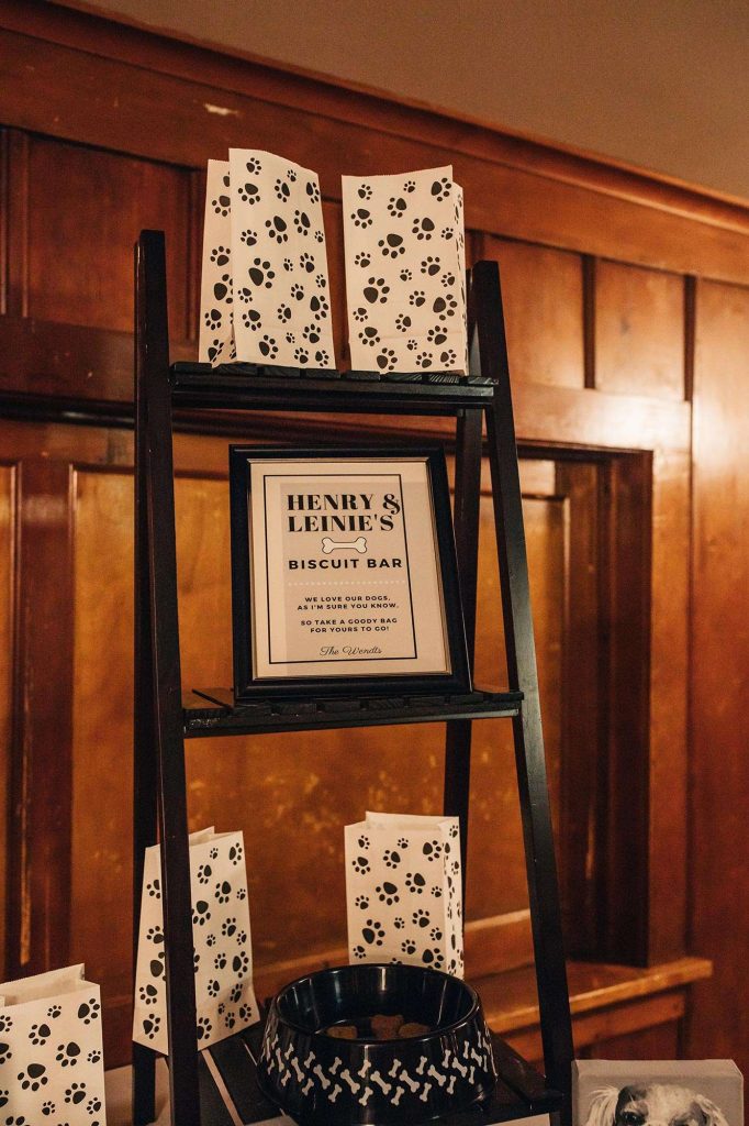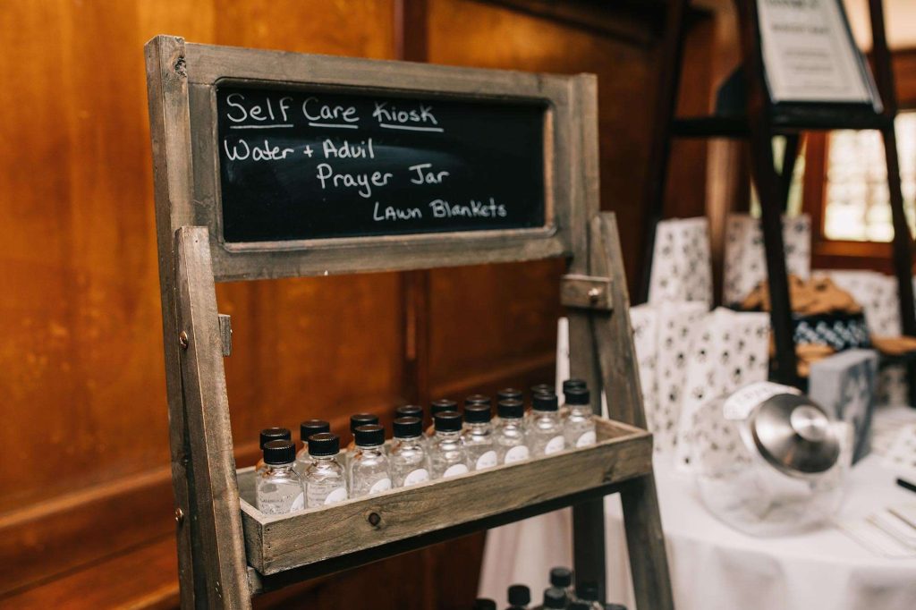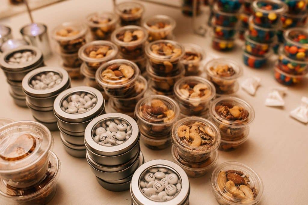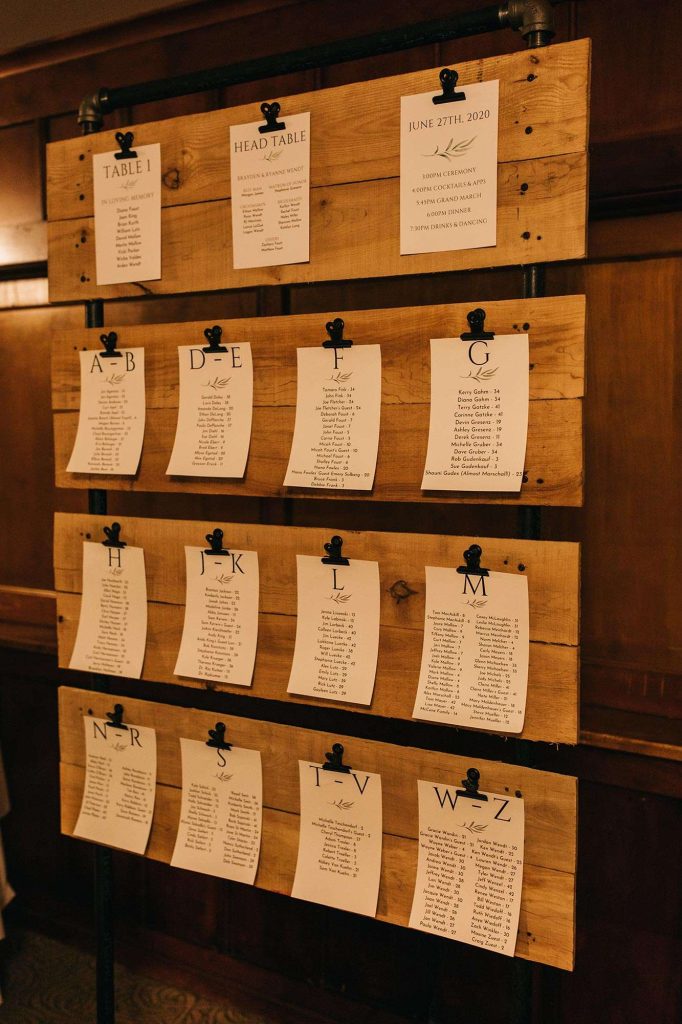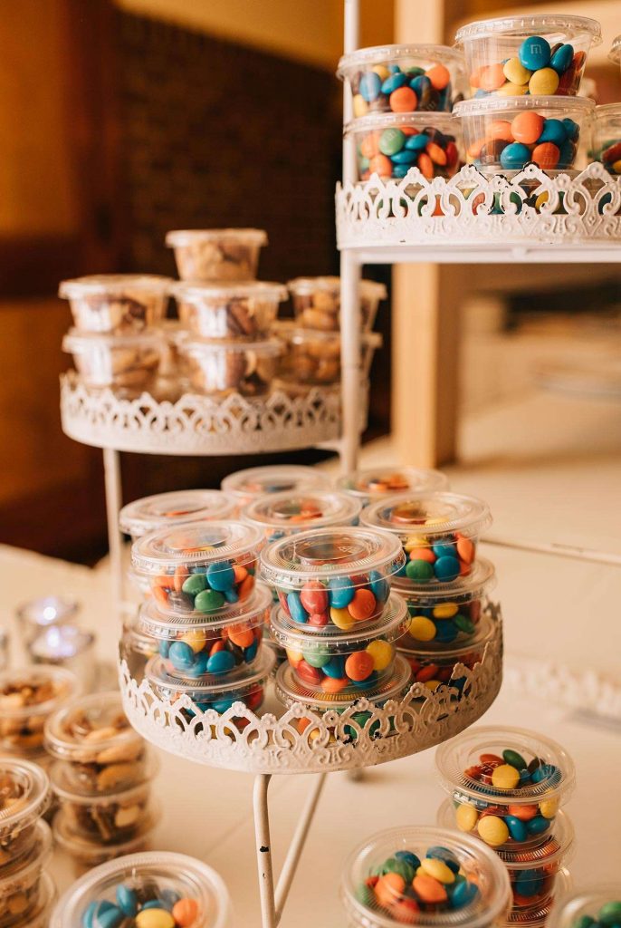 Beyond making their own centerpieces and paper goods, commissioning signage, and Ryanne’s mom making a gorgeous entryway out of crates, frames, and silk flowers, there were a couple pandemic-inspired DIYs as well: “We created green, yellow, and red ribbons with safety pins for guests to wear to show their comfort level with COVID19. Green represented comfort with hugs, handshakes, and high-fives. Yellow represented comfort with talking but not touching. Red represented comfort with keeping their distance.” The planned pub snacks during cocktail hour also had to change. “We prepackaged 600 serving sizes of pub mix, M&Ms, pretzels, and popcorn for guests to snack on during cocktail hour.”