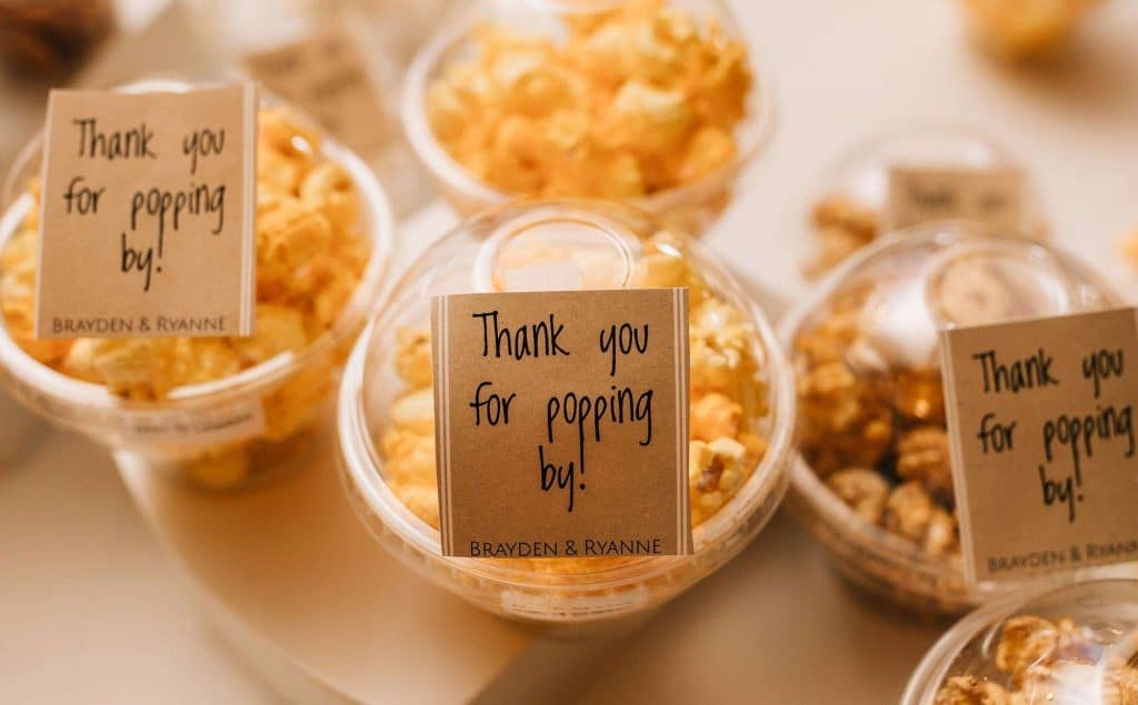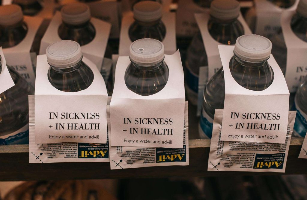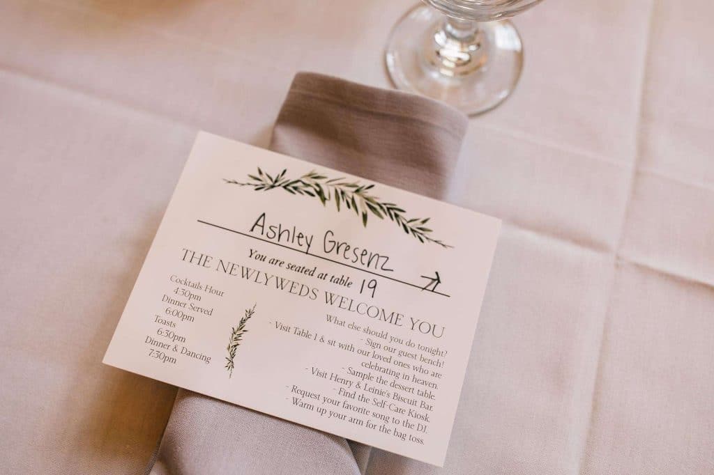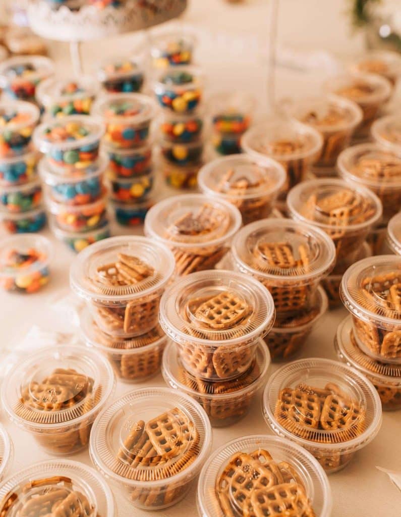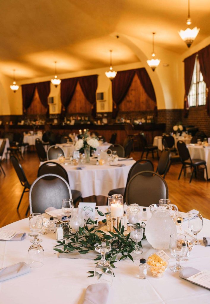 Beyond making their own centerpieces and paper goods, commissioning signage, and Ryanne’s mom making a gorgeous entryway out of crates, frames, and silk flowers, there were a couple pandemic-inspired DIYs as well: “We created green, yellow, and red ribbons with safety pins for guests to wear to show their comfort level with COVID19. Green represented comfort with hugs, handshakes, and high-fives. Yellow represented comfort with talking but not touching. Red represented comfort with keeping their distance.” The planned pub snacks during cocktail hour also had to change. “We prepackaged 600 serving sizes of pub mix, M&Ms, pretzels, and popcorn for guests to snack on during cocktail hour.”