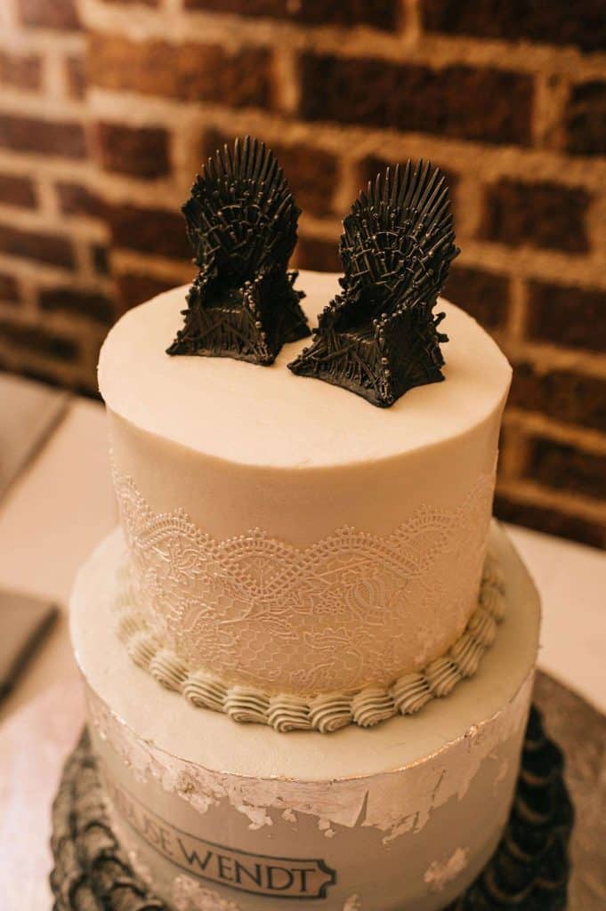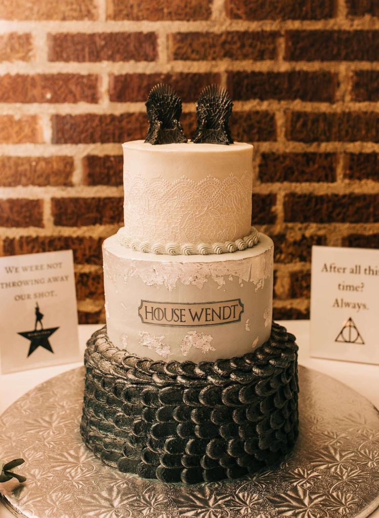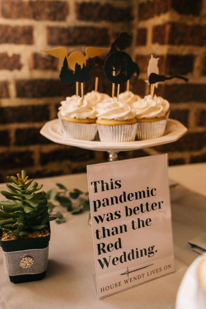 For dessert, Ryanne and Brayden went all out with fun favorites. “We had a Game of Thrones cake with two iron thrones up top—because a pandemic was better than a Red Wedding! We had Harry Potter cupcakes because we made ‘The Unbreakable Vow.’ We also had Hamilton-themed cookies and cheesecake.”