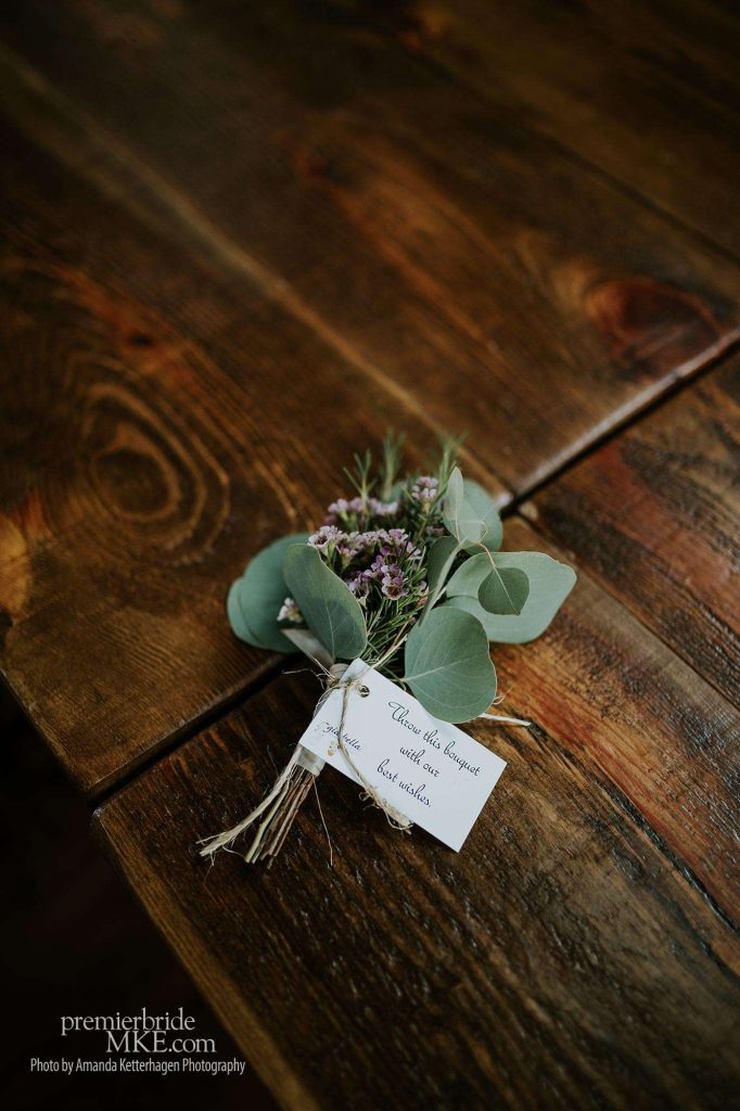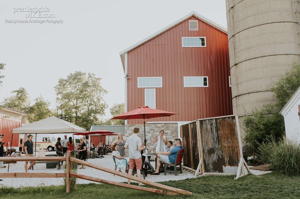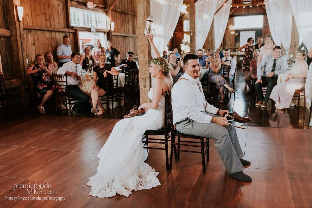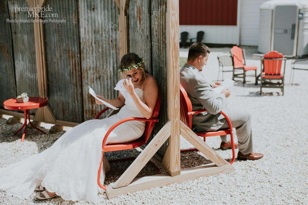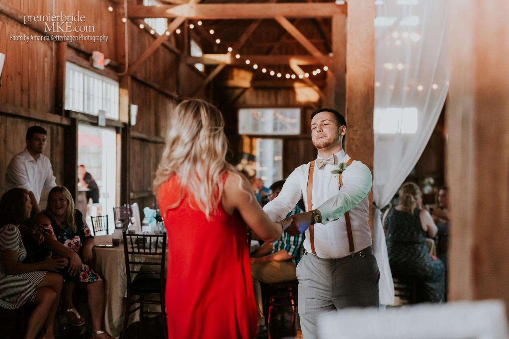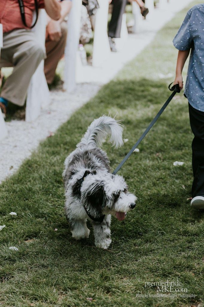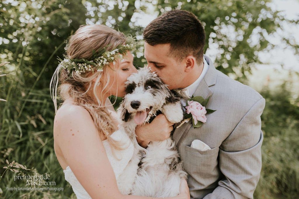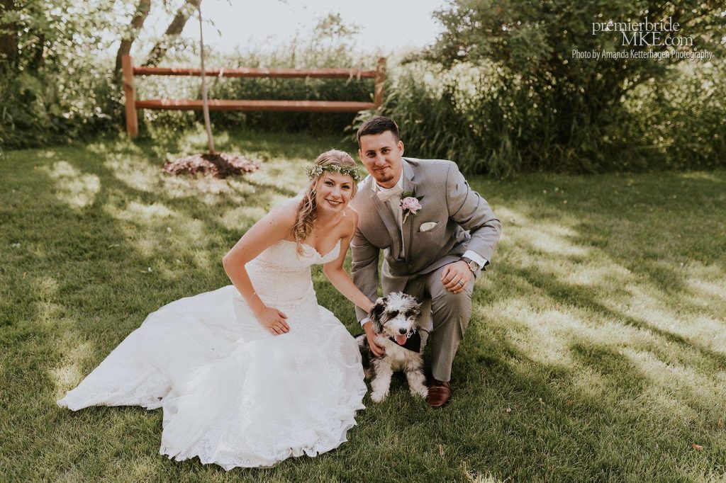 The Cupola Barn ceremony was held outside on a hot, beautiful day. Sam loved seeing Alex tear up as she walked down the aisle, her dad at her side. One thing that made the event unique was their unity ceremony: “We had a special box and asked our closest family and friends to write something special for us ahead of time, then walk up and drop it in the box. Alex and I plan on reading all of these special messages on our anniversary.” Alex and Sam’s puppy, Lambeau, also made an appearance at the ceremony.