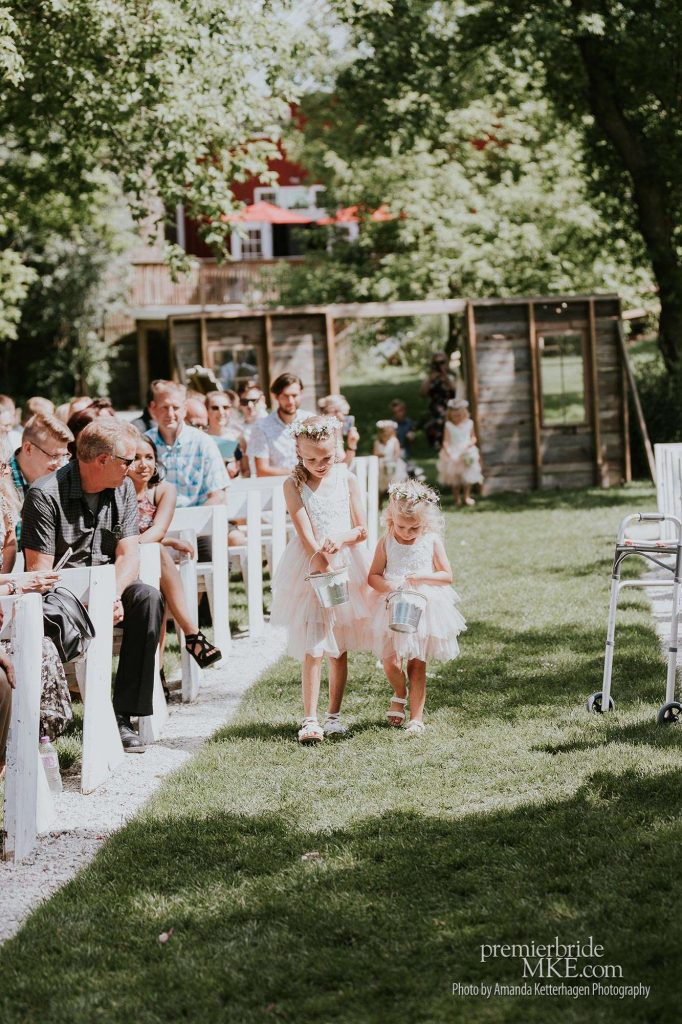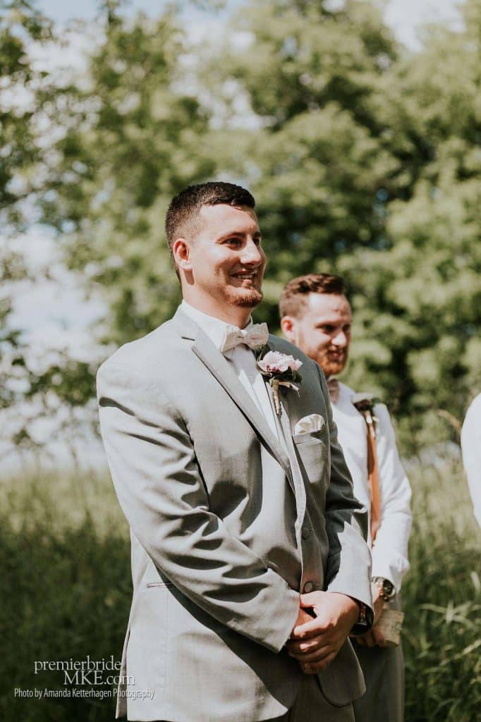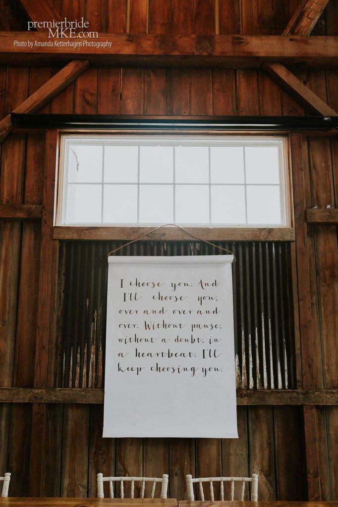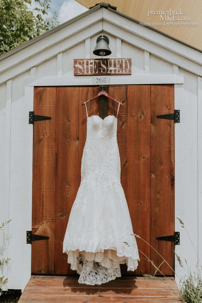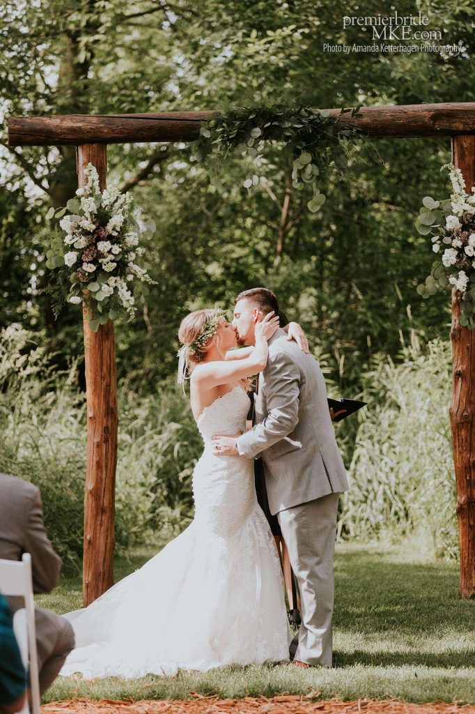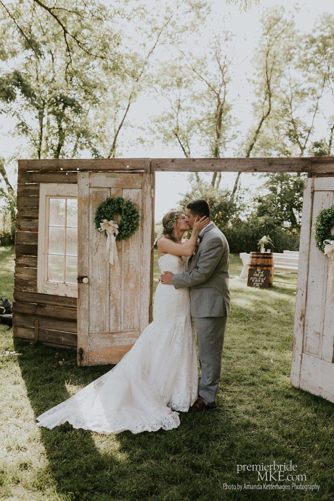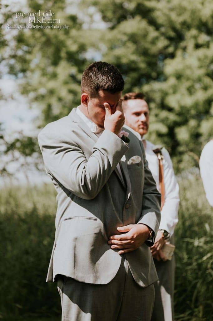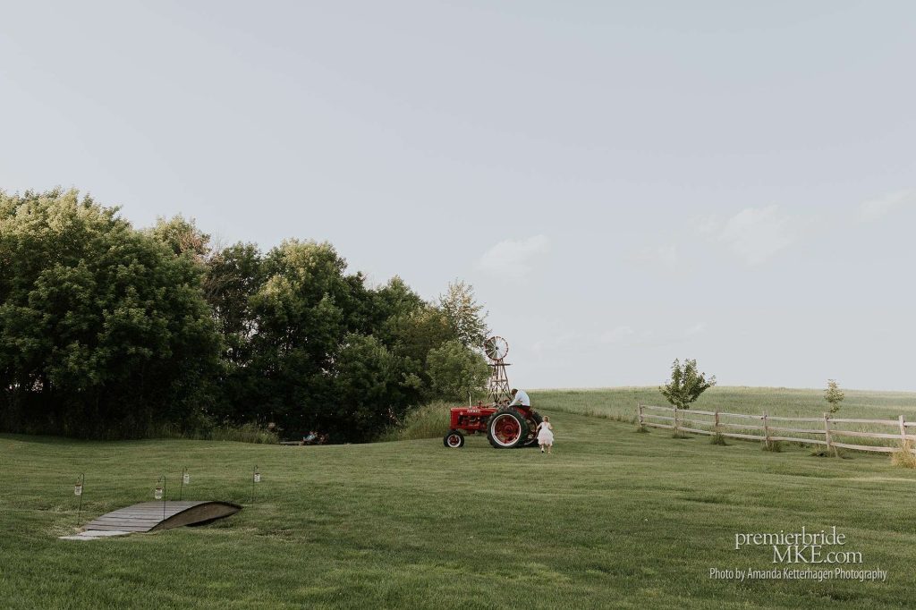 The Cupola Barn ceremony was held outside on a hot, beautiful day. Sam loved seeing Alex tear up as she walked down the aisle, her dad at her side. One thing that made the event unique was their unity ceremony: “We had a special box and asked our closest family and friends to write something special for us ahead of time, then walk up and drop it in the box. Alex and I plan on reading all of these special messages on our anniversary.” Alex and Sam’s puppy, Lambeau, also made an appearance at the ceremony.