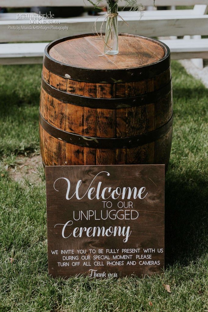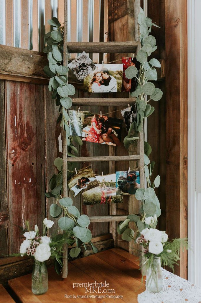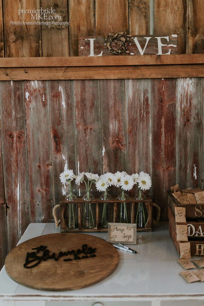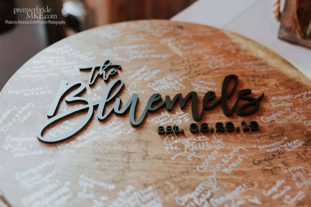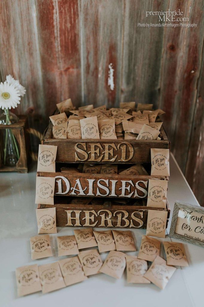 Alex and Sam’s wedding was truly chockfull of DIY goodies. For starters, Sam customized many wooden boards that served as décor and way finding, for example: boards with the order of the day, “all of me loves all of you,” “welcome to our beginning,” and more. Sam also adorned a small wooden ladder with greenery and pictures of herself and Alex. Hand-stamped packets with wildflower seeds were the guest favors, and Sam worked with Alex to hand-paint the wooden boards for some of the games.