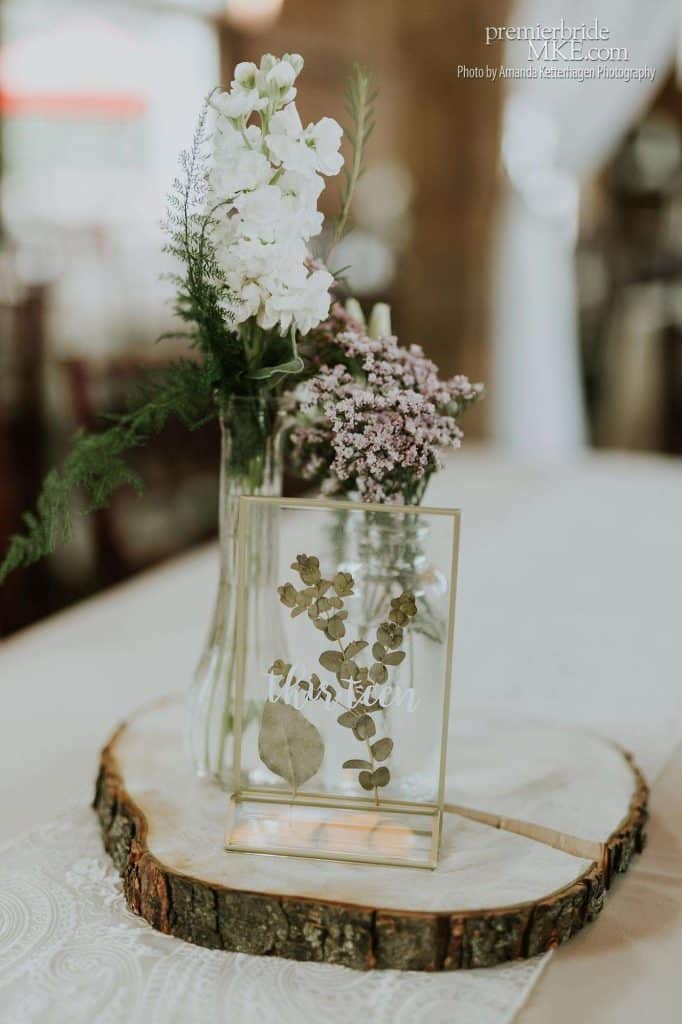 With the help of her maid of honor, Sam crafted the dried floral and greenery centerpieces using glass frames. Last but not least, Sam feels endlessly blessed for her aunt’s help, who works in a printing shop. “She printed all of my invites and save-the-dates.”