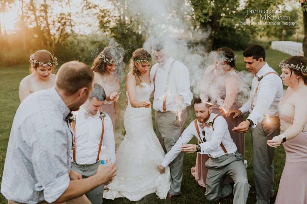 At sunset, the entire bridal party took sparkler photos with photographer Amanda Ketterhagen. “My photographer Amanda was so wonderful at making us feel comfortable and getting the best shots possible, even in hot weather! I was so thankful that she sent me a sheet to fill out that listed everyone I wanted to take pictures with.” As for the sparklers, they made for a brilliant photo op, but Sam cautions brides to be careful with sparklers. “My dress almost set on fire!” Luckily, the bride’s brother was there to avert any real disaster.