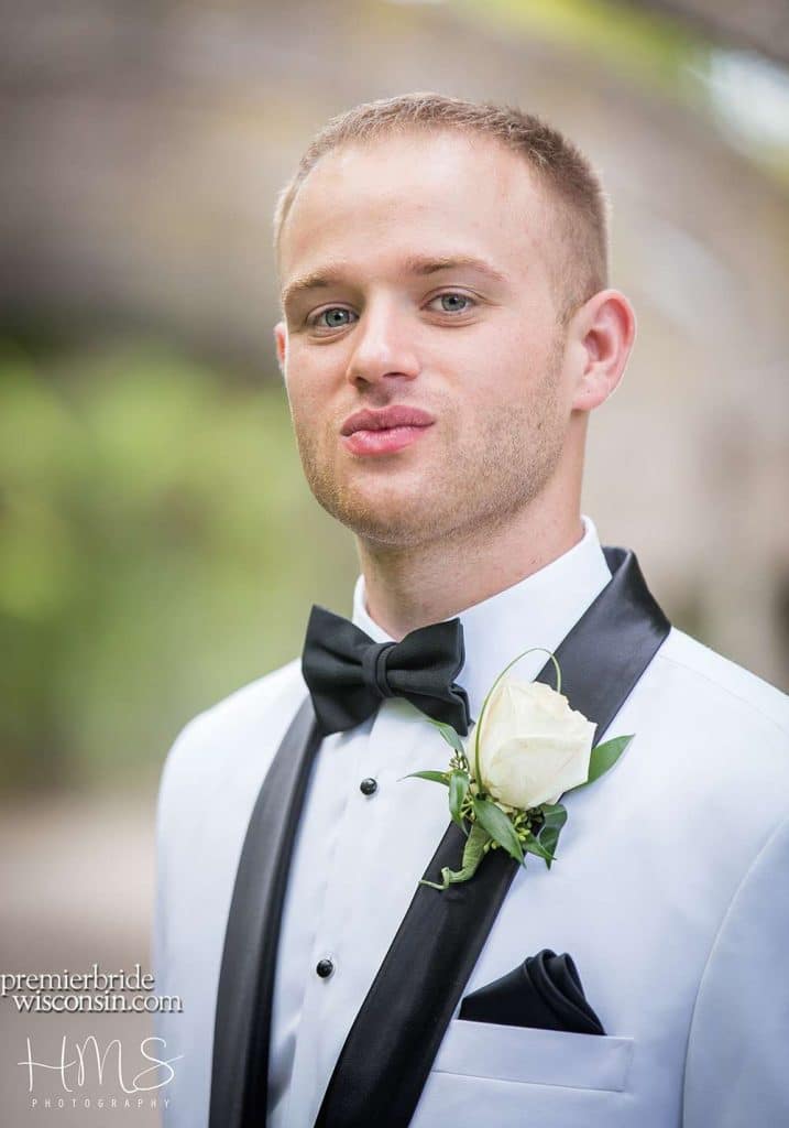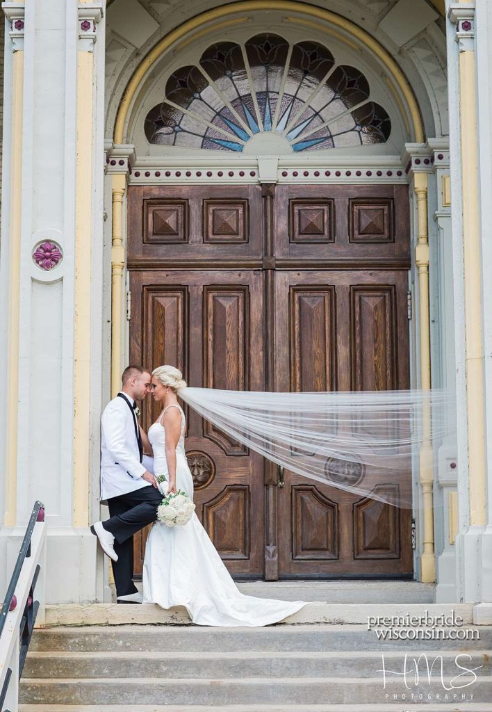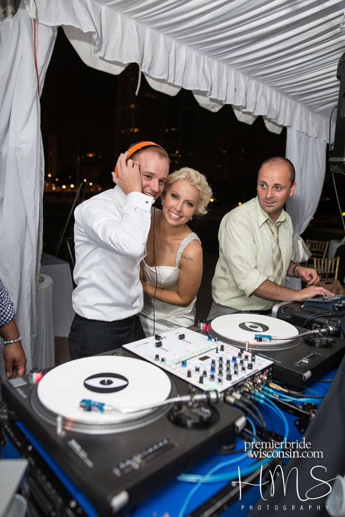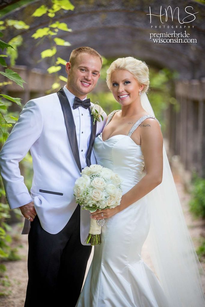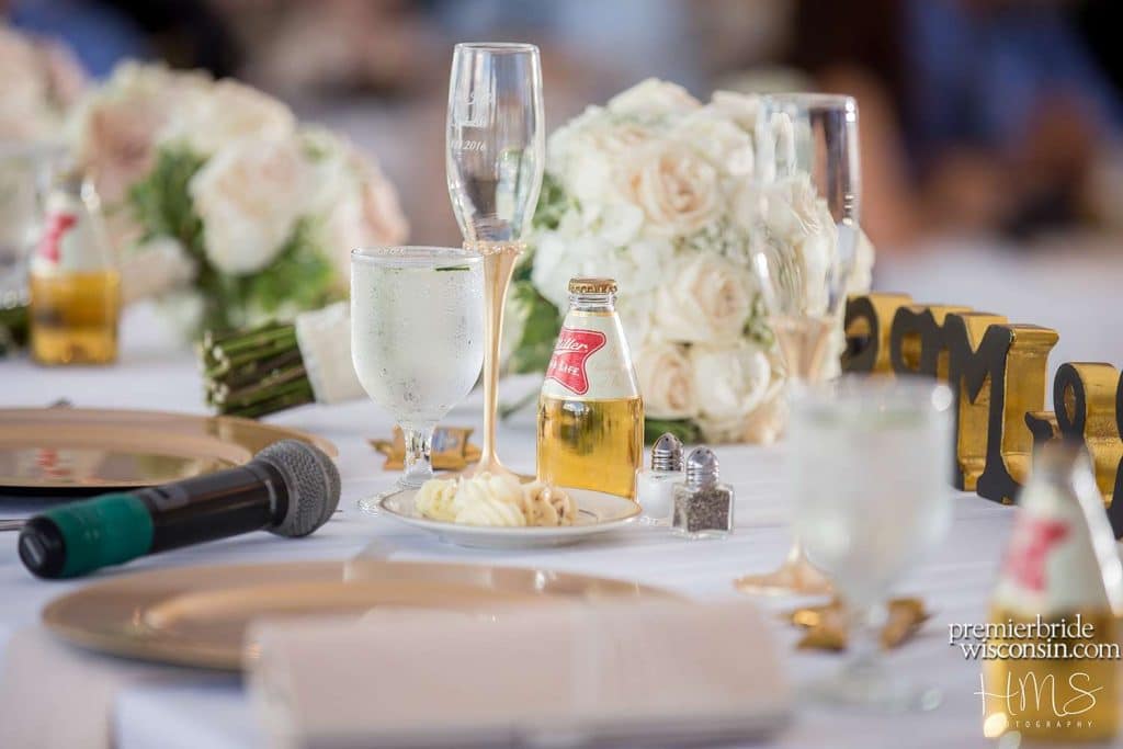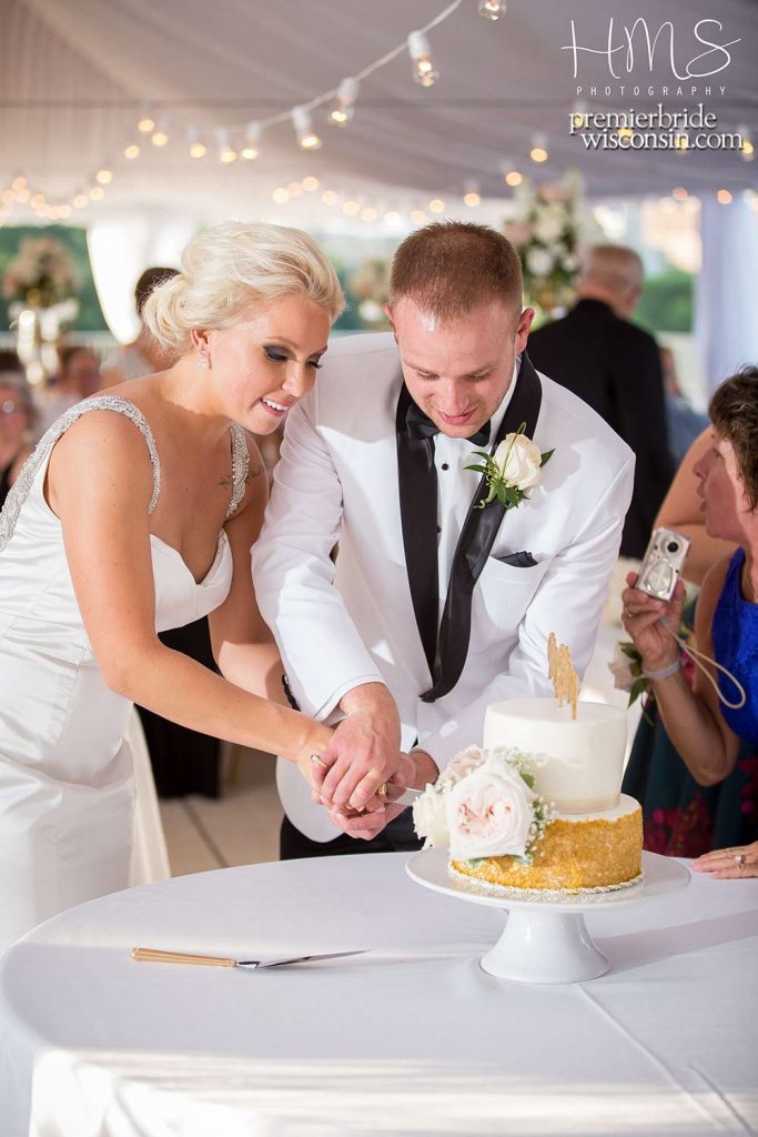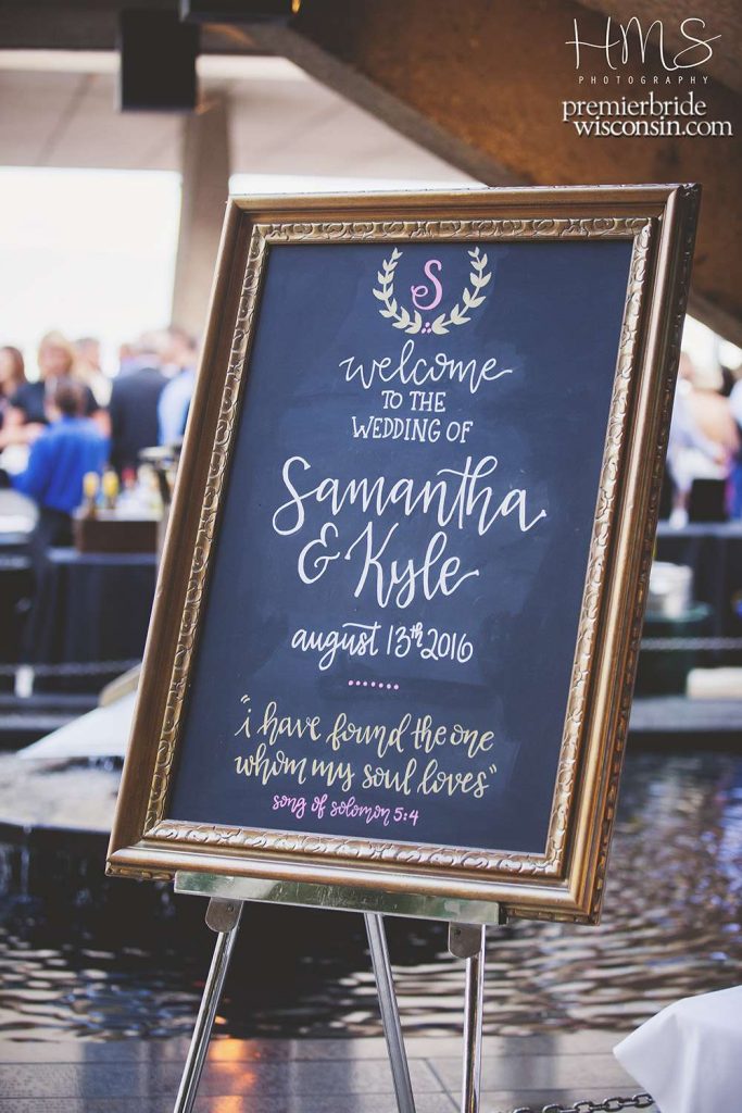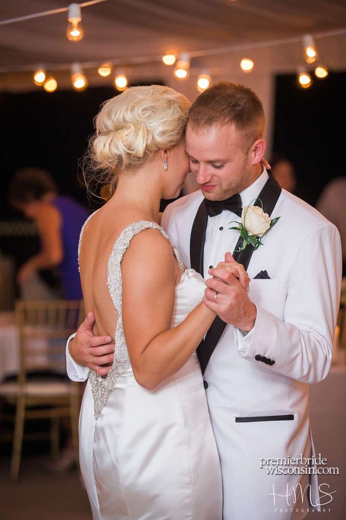 The couple planned a romantic, glamorous wedding, with a church ceremony and a tented lakefront reception at the Milwaukee County War Memorial. Samantha found her dress at Gigi of Mequon. Her favorite part of the ceremony was walking down the aisle toward Kyle, and one of her favorite moments of the entire day was walking into the reception. “Kyle and I walked in together and it was just breathtaking. It was so fun to see how beautiful everything turned out. We chose not to have any side walls on the tent, so we could see the lake. The day couldn’t have been more beautiful — 75 degrees and sunny, with an orange and pink sunset. It was perfect.”