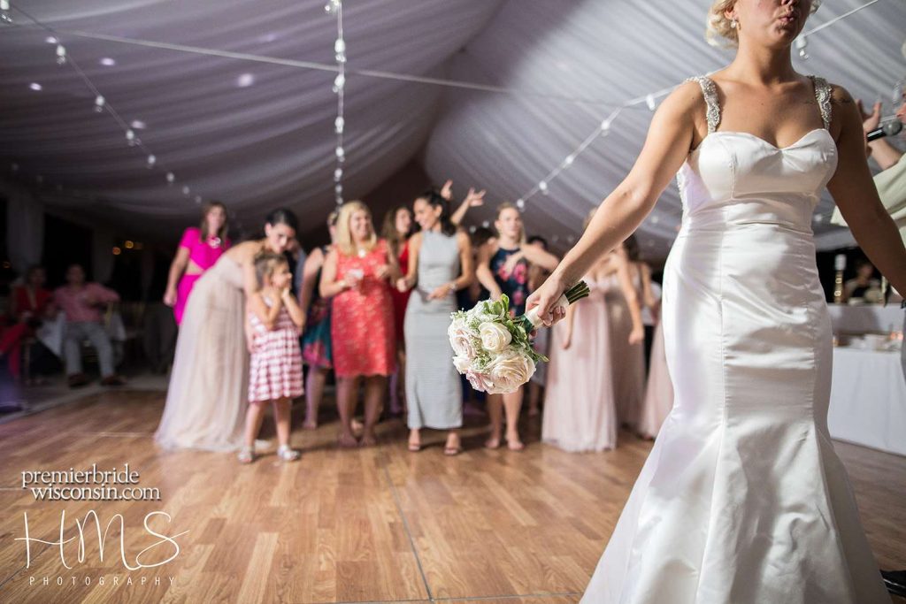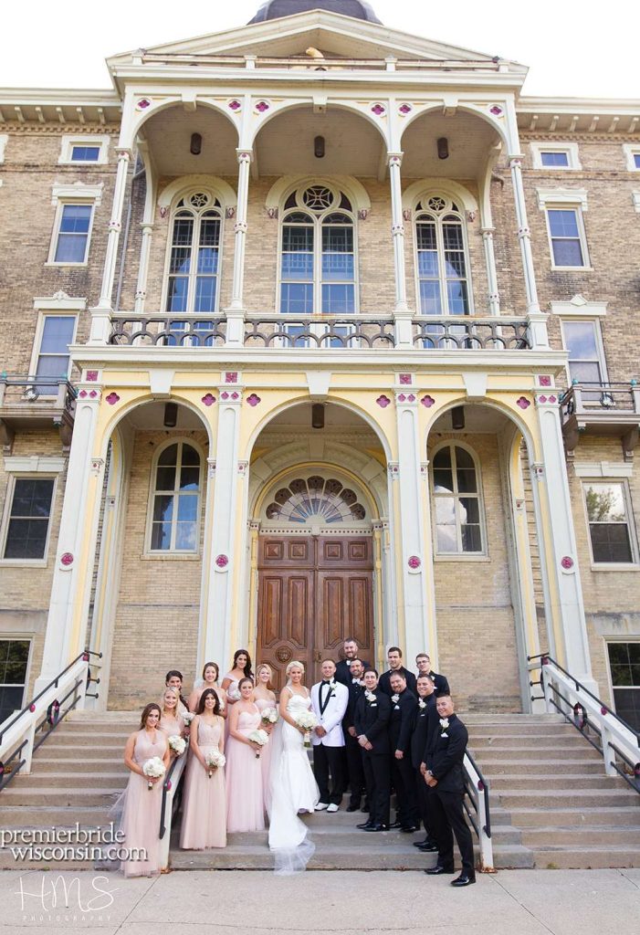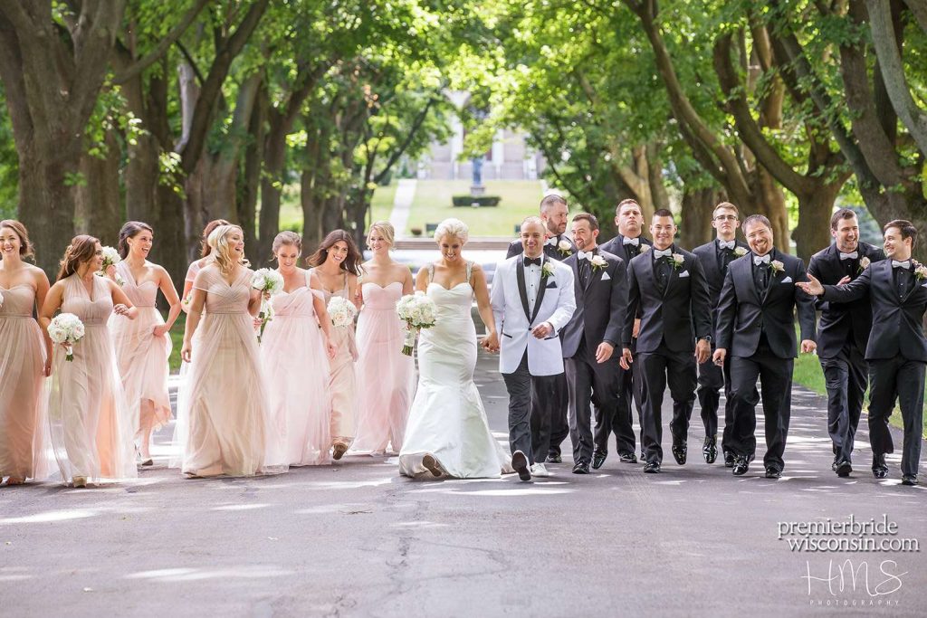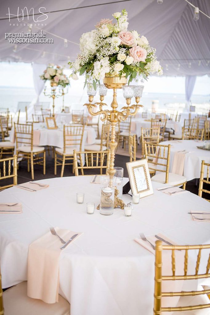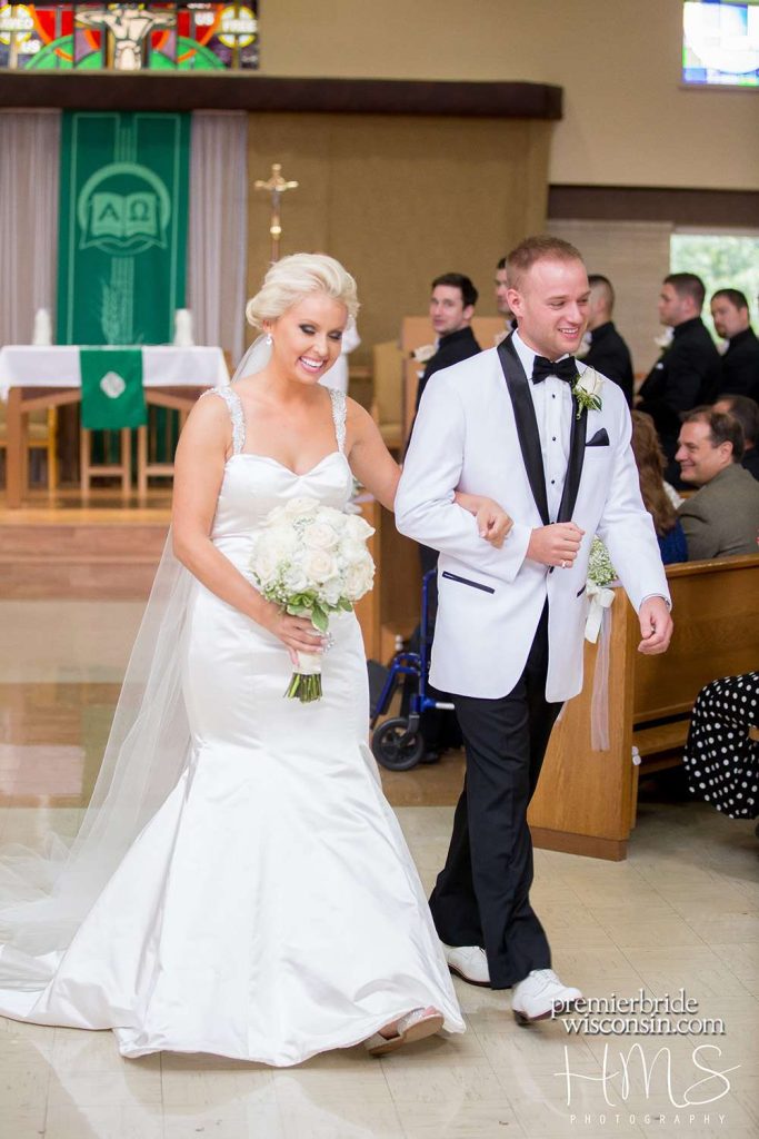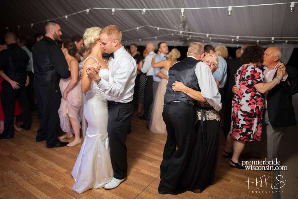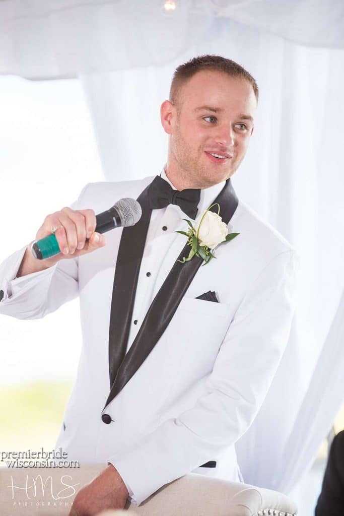 The couple planned a romantic, glamorous wedding, with a church ceremony and a tented lakefront reception at the Milwaukee County War Memorial. Samantha found her dress at Gigi of Mequon. Her favorite part of the ceremony was walking down the aisle toward Kyle, and one of her favorite moments of the entire day was walking into the reception. “Kyle and I walked in together and it was just breathtaking. It was so fun to see how beautiful everything turned out. We chose not to have any side walls on the tent, so we could see the lake. The day couldn’t have been more beautiful — 75 degrees and sunny, with an orange and pink sunset. It was perfect.”
