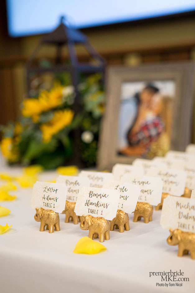For Mike, one thing he wishes he knew while planning the wedding was how much the guests would love their wedding favors. “Just a week before the wedding, we decided to place candy bags on the tables, and we were surprised what a big hit they were. We also didn’t realize how much our guests would like the elephant place-card holders. Many people approached us throughout the night, complimenting us on this special touch. We wish we would have made it clear that these were gifts, as we heard many times after the fact that guests wished they knew they could have kept their elephant.” When all is said and done, Sarah and Mike agree: “We wouldn’t change a thing about our day.”