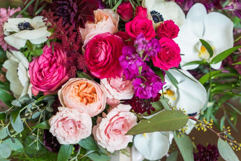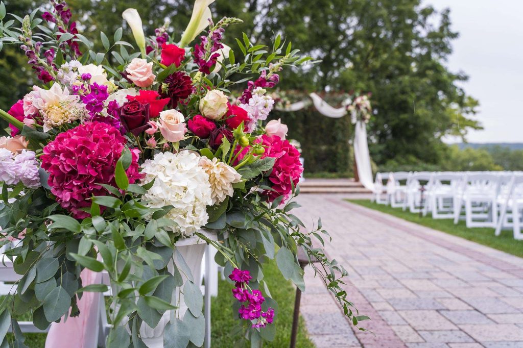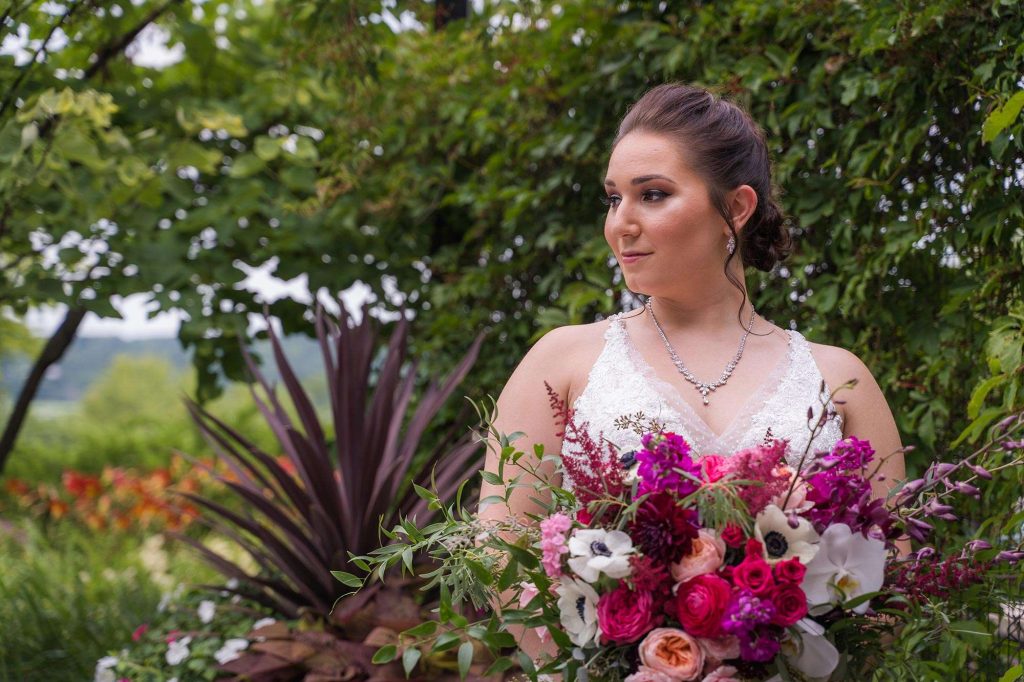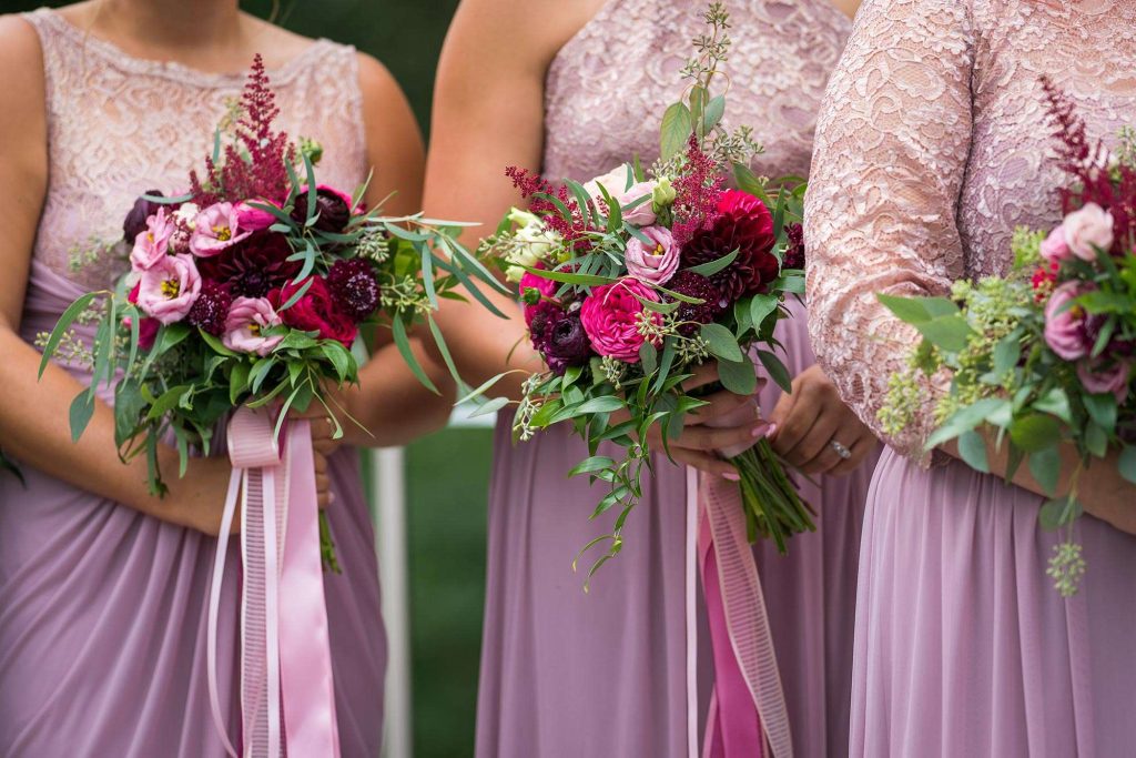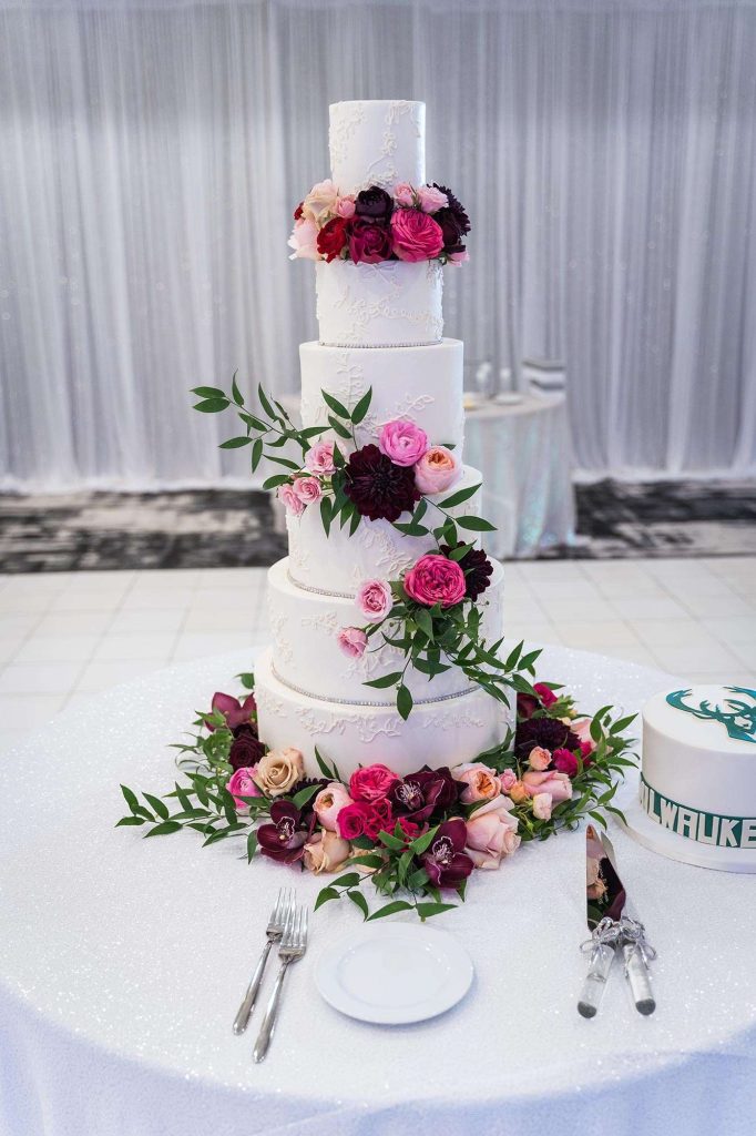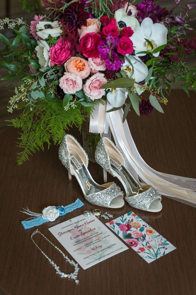 Shannon says they went for a “classy, modern style” with flowers that celebrated the transition of summer into fall. The flowers were one of her favorite parts of the day. “Our colors were more of a color palette: reds, burgundy, hot pink, light pink, purples, peach, and ivory.” The ceremony, reception, and rehearsal dinner all took place at The Ridge in Lake Geneva.