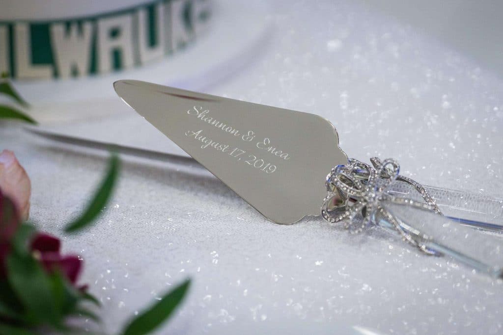 To look their best on the big day, Enea and Shannon both turned to All About the Gown in Lake Geneva to find their finery. Shannon’s advice for dress shopping: “If you have to, try on dresses by yourself and get what you truly want. I wasn’t happy with my first dress because I chose it based off the opinions of the people who were with me. I went alone the second time to a different boutique and fell in love with a dress that was exactly what I wanted.”