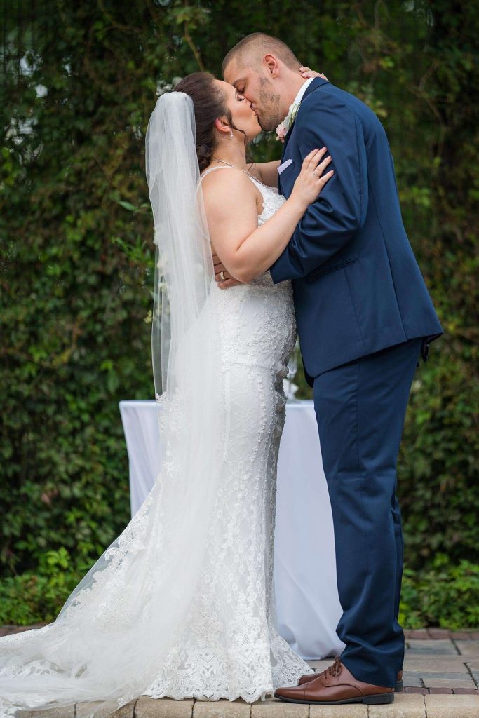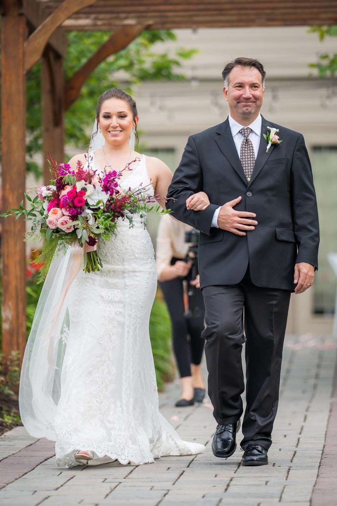 Shannon and Enea’s ceremony was held outside at The Ridge under the pavilion. “It was over-cast, no rain—warm, but not too warm! There was lots of greenery and flowers, and a view of the lake in the background.” Shannon says she’ll never forget walking down the aisle and seeing Enea’s face light up. She also loved glimpsing her tearful little brother, who was a groomsman.