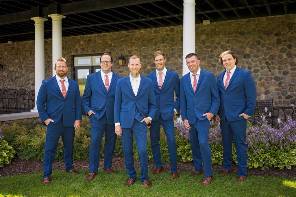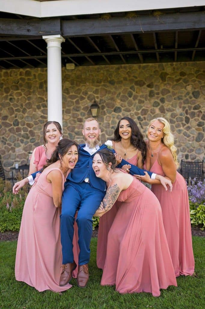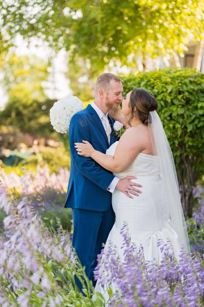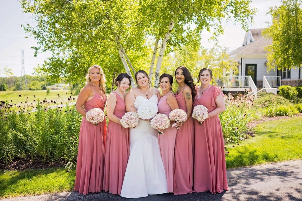 Julia found her dream wedding dress at Brides by Young in Schaumburg, Illinois. “I went into dress shopping with a small idea of what I thought I wanted, but once I tried it on I knew it was the one!” she shared. “I felt so beautiful and very comfortable, and it encompassed the style I was looking for.” The bride’s and bridesmaids’ hair and makeup were done by Beauty Unveiled by Tia. The bride wore jewelry from Sienna Moon and spritzed on custom-made perfume by Pure Love Essences. Ben’s tux was from DuBois Formalwear.