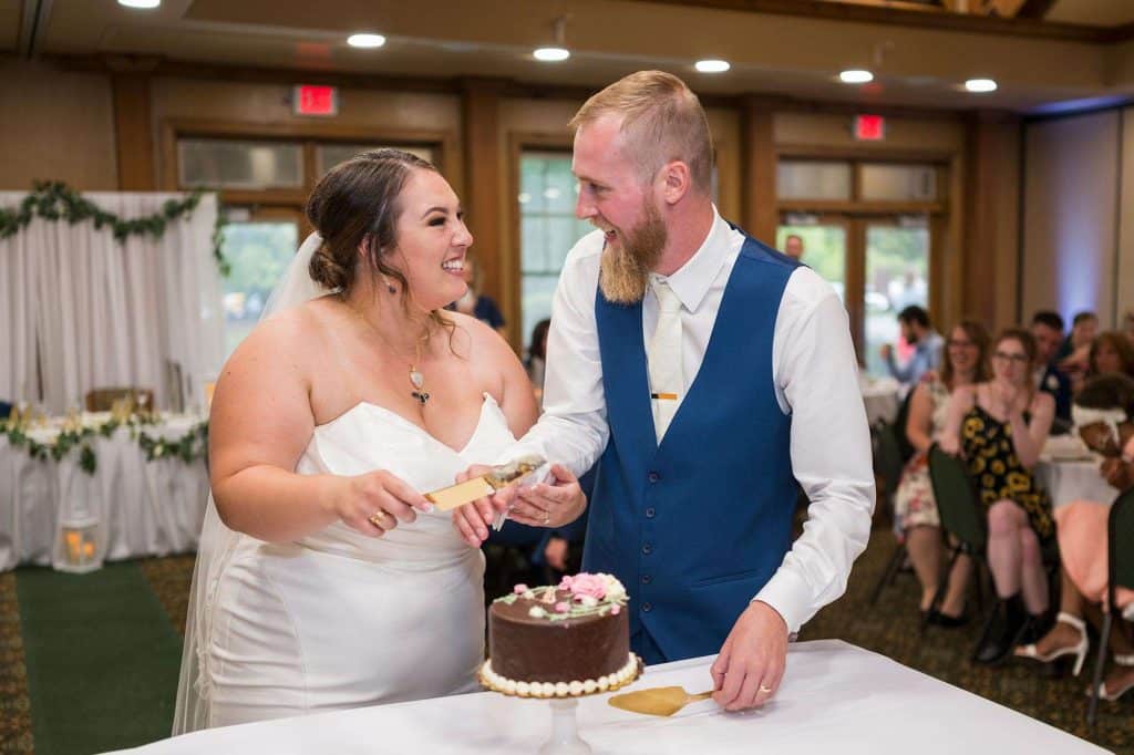 For the main course, guests were served plated dinners with an option of beef tenderloin, salmon, and stuffed chicken, plus a side salad and fresh rolls. Cocktail hour bites included a crudité platter and a charcuterie board. Julia and Ben’s signature cocktails were a special tap beer (his) and a Moscow mule (hers). The wedding cakes, both designed by Simma’s Bakery, were a cheesecake for the cake cutting ritual and a chocolate cake with raspberry, ganache, and buttercream frosting.