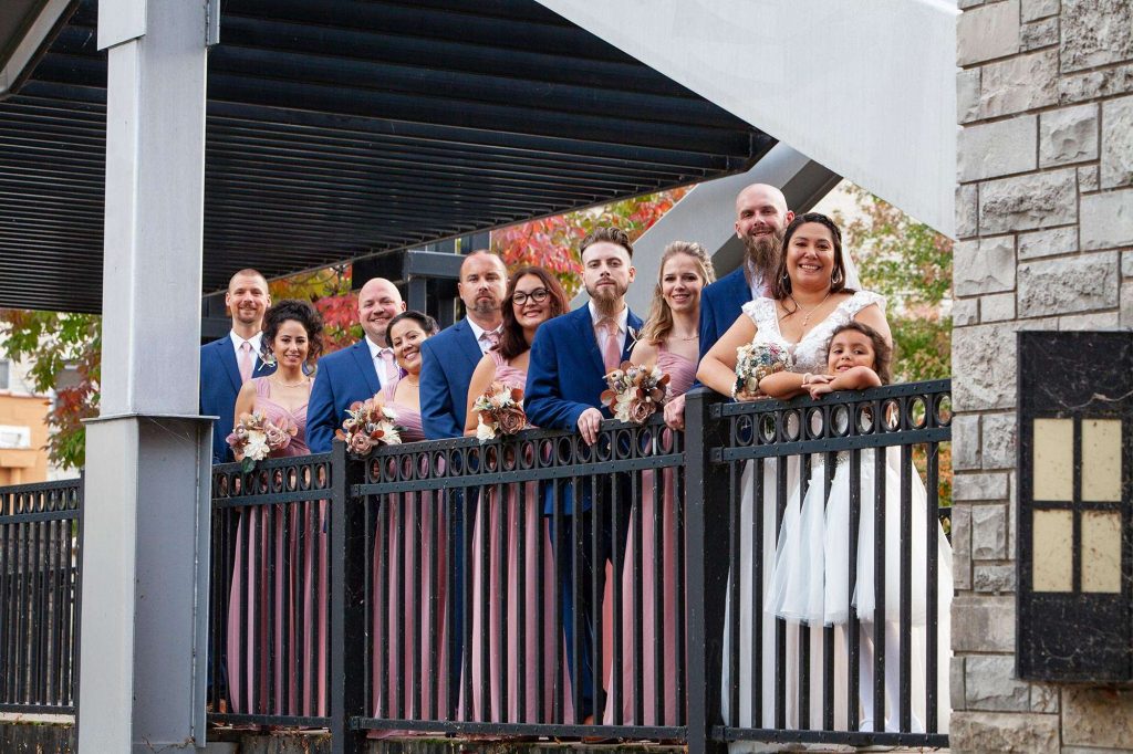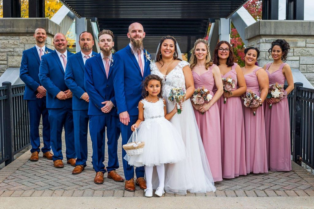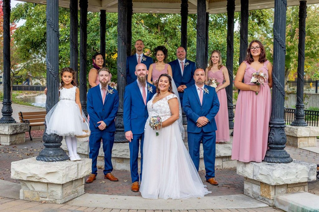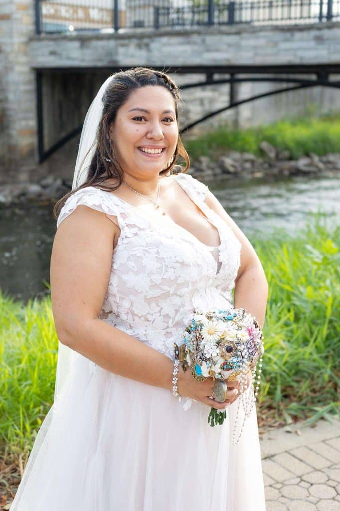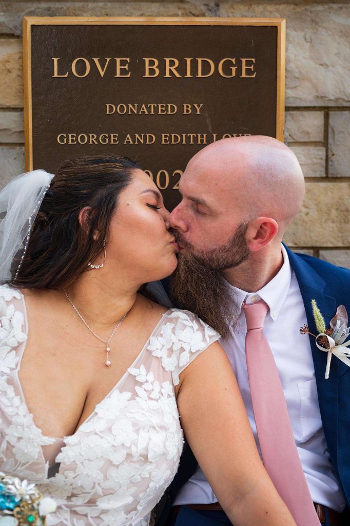 On the day of the wedding, Matt and Sheila leaned into the Waukesha location, taking pictures around downtown. “It was a beautiful day. We took pictures on the love bridge over the Fox River, along the Fox River, the Gazebo by Waukesha State Bank, and the mural on the wall of Antiques & Uniques On Main.”