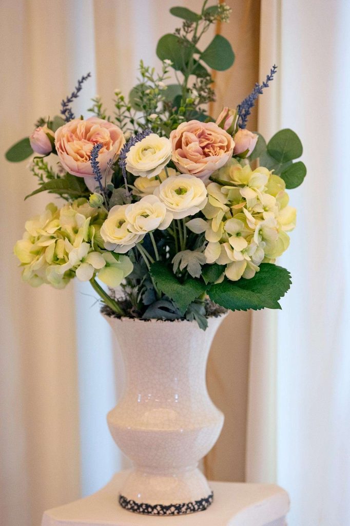“Once we decided on a wedding date, I really started to attack this project.” Sheila used an artificial hydrangea to keep the round shape and there was wire, floral tape, duct tape, and ribbon holding everything together. The bouquet was finished with a white and blue handkerchief that had belonged to Sheila’s grandmother.