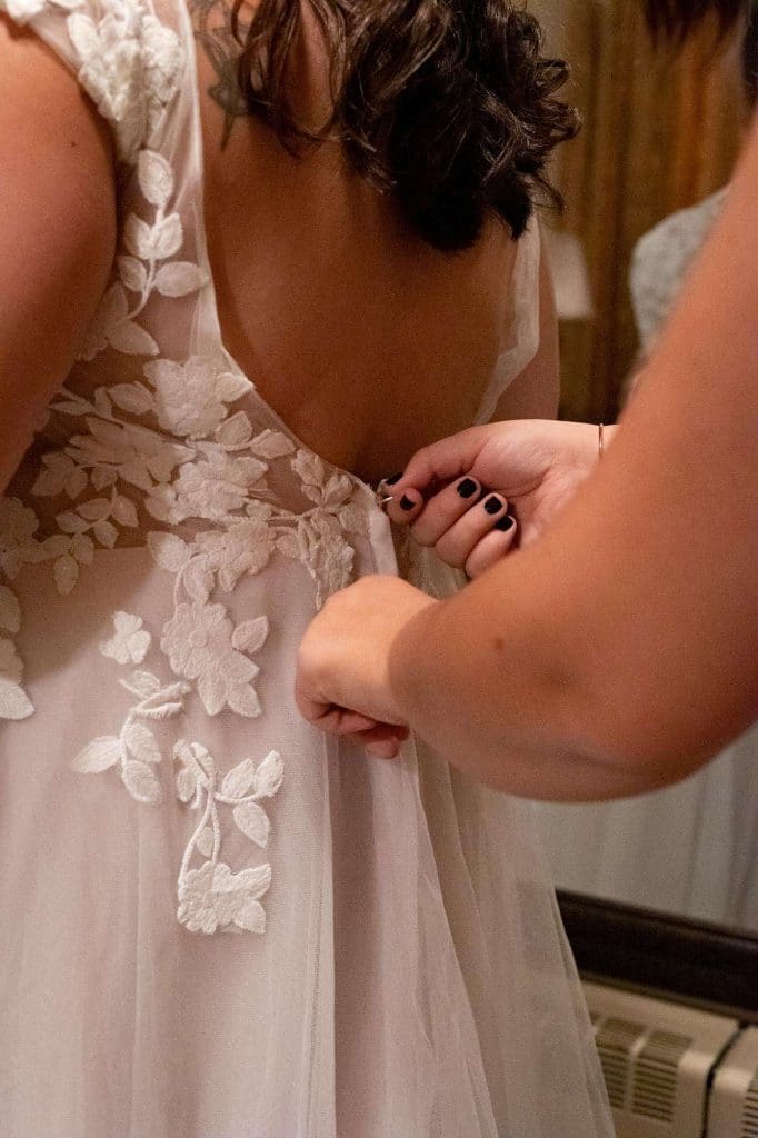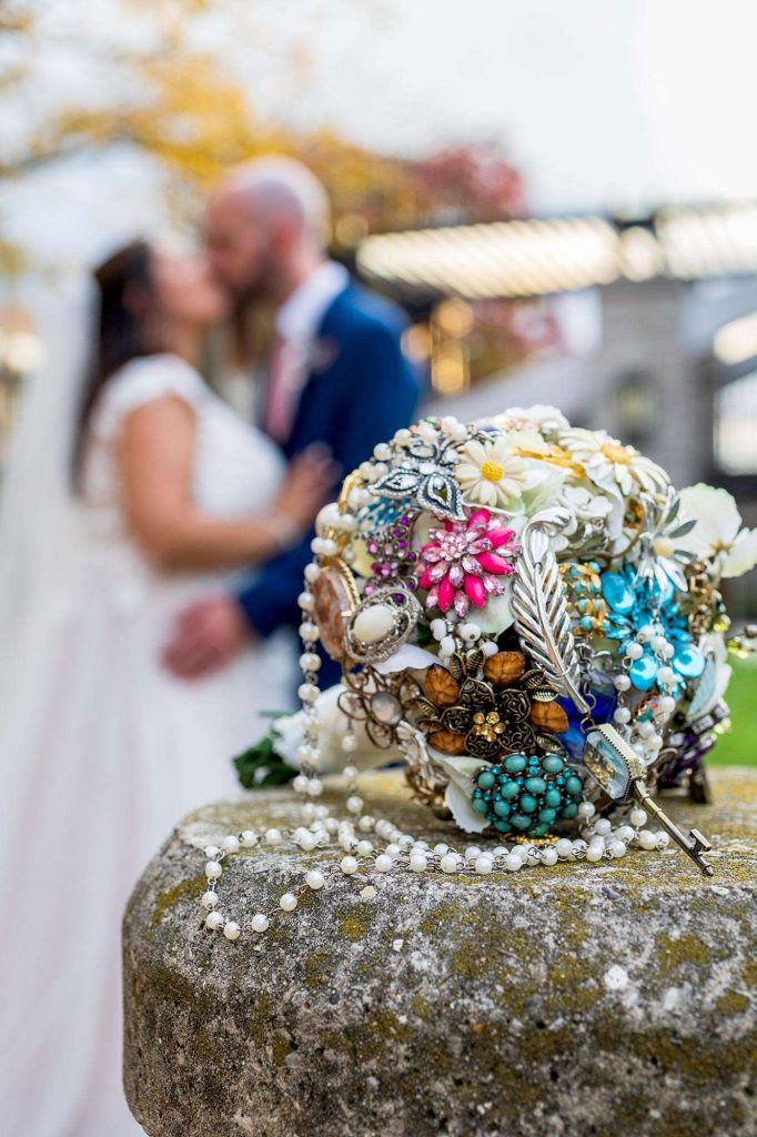 One of the biggest DIY projects Sheila took on was her bouquet. She knew she didn’t want real flowers: ”My allergies would have had me sneezing all night!” Sheila had her heart set on a brooch bouquet for quite some time. “My sister and oldest daughter had started gifting me brooches, so over the years, my collection grew. My mother-in-law also gifted me a box of old brooches and clip-on earrings that I could someday use.”