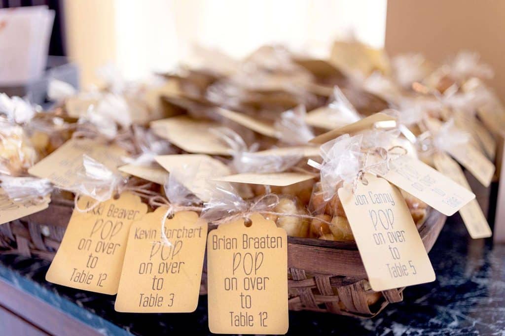 The reception started with six appetizers: mini grilled cheese and tomato soup shooters, rumaki with water chestnuts and hickory smoked bacon, tenderloin crostini with caramelized onions and cheese sauce, Brie and fresh raspberry phyllos, shredded pork quesadillas, and caprese garden skewers. Even though the bride and groom missed the appetizers in the moment, Lisa at Chef Jack’s saved them some to enjoy after they got back from taking pictures.