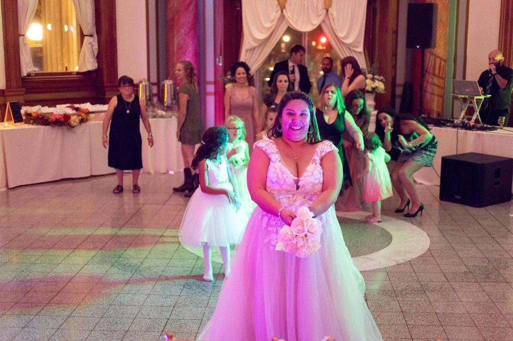 For the bouquet toss, Sheila had a plan to make it fun for the many kids present. “I didn’t want anyone to feel left out, so I got a bouquet of faux roses. I undid the wrap, and when it was time to toss the bouquet, it came undone, and the flowers went everywhere. Most of the kids, and some adults, were able to get a rose or two.”