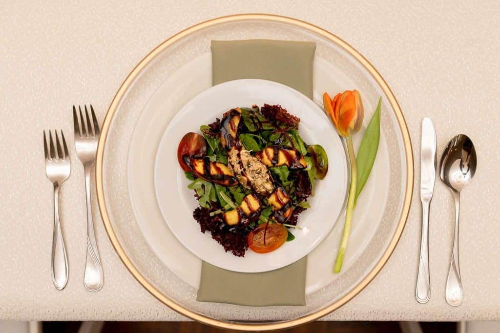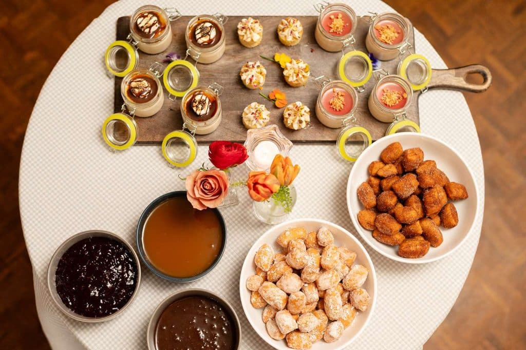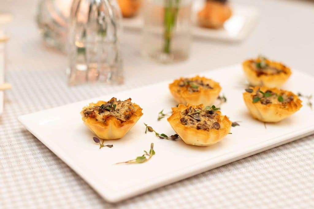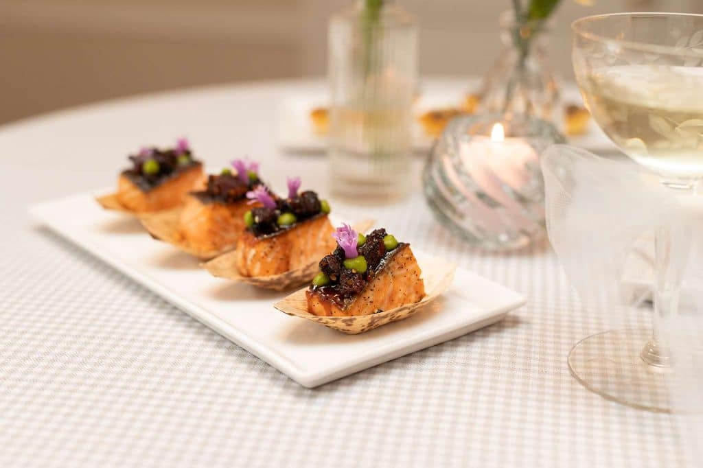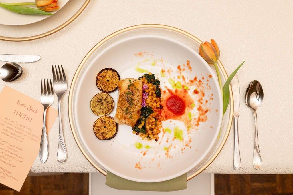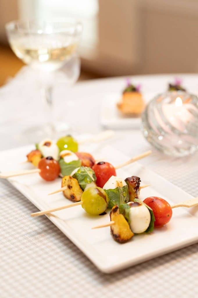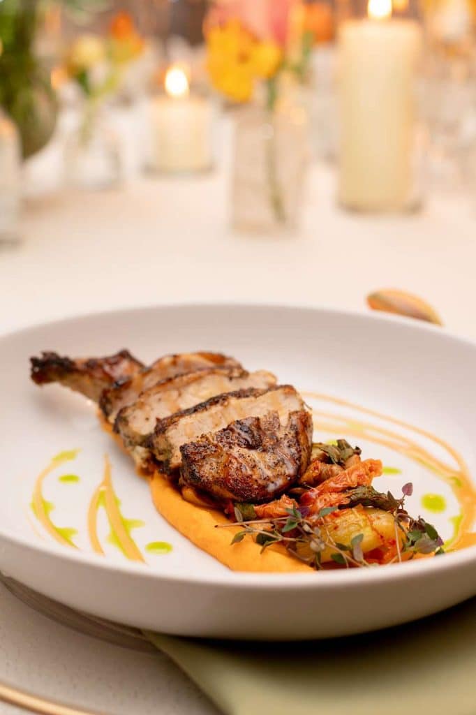 Food was nothing short of delicious, all compliments of Noble Catering & Events. Appetizers included grilled peach caprese skewers, salmon burnt ends as well as goat cheese and mushroom tarts. The peach and burrata salad played off the colorful theme. Entrees were a Sea Bass with fregola pasta, lacinato kale, calabrian chilis and charrled lemon heirloom sauce and a Maple Sage Chicken with spiced sweet potatoes, kimchi bok choy and carmel. To finish off the course were mini Bombolinis and Crème Brûlée cups.