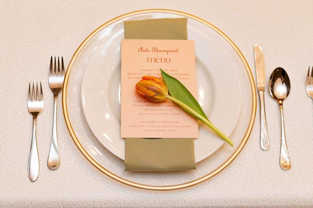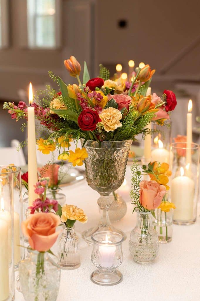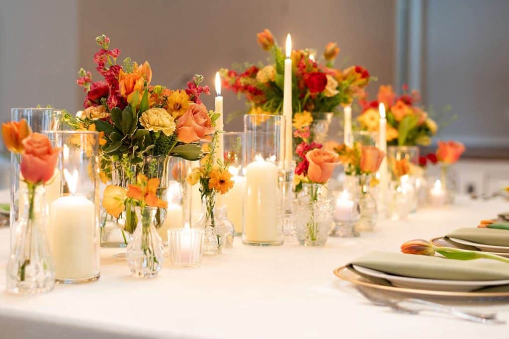 Reflections of You created arrangements with reds, oranges and yellows in a variety of difference sizes and shapes. Linens, provided by Windy City Linen, were brought in to accent, with a textured white tablecloth and sage green napkins. To finish off the tables menu cards, created by Paper Envy, were placed on top of each place setting adorned with a single tulip. Paper Envy also created a welcome sign and invitation suite with accenting colors to pull everything together.