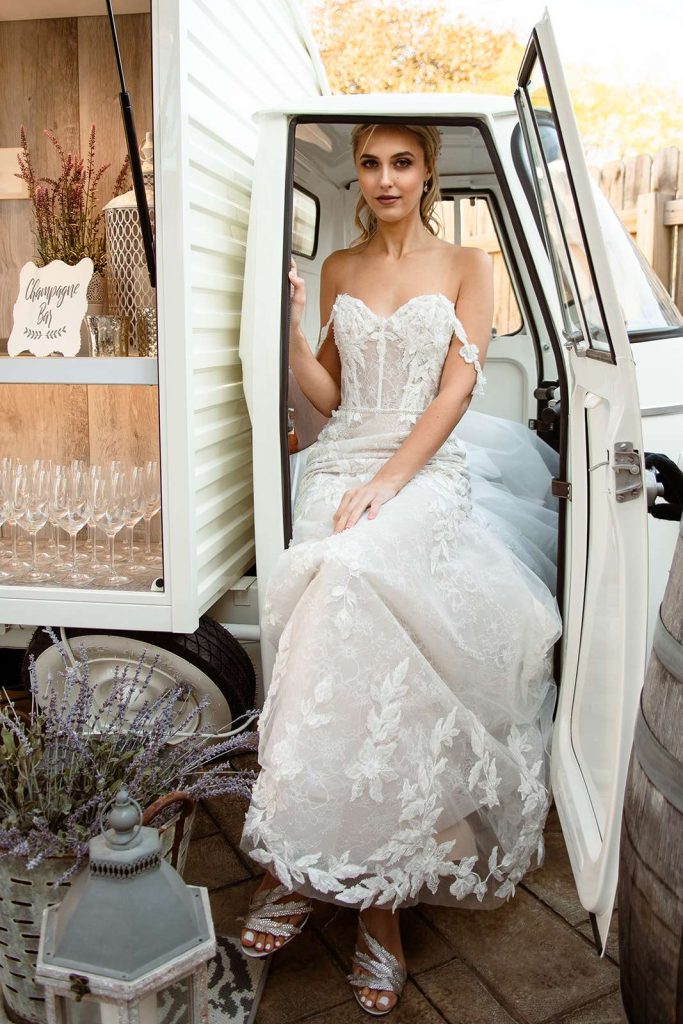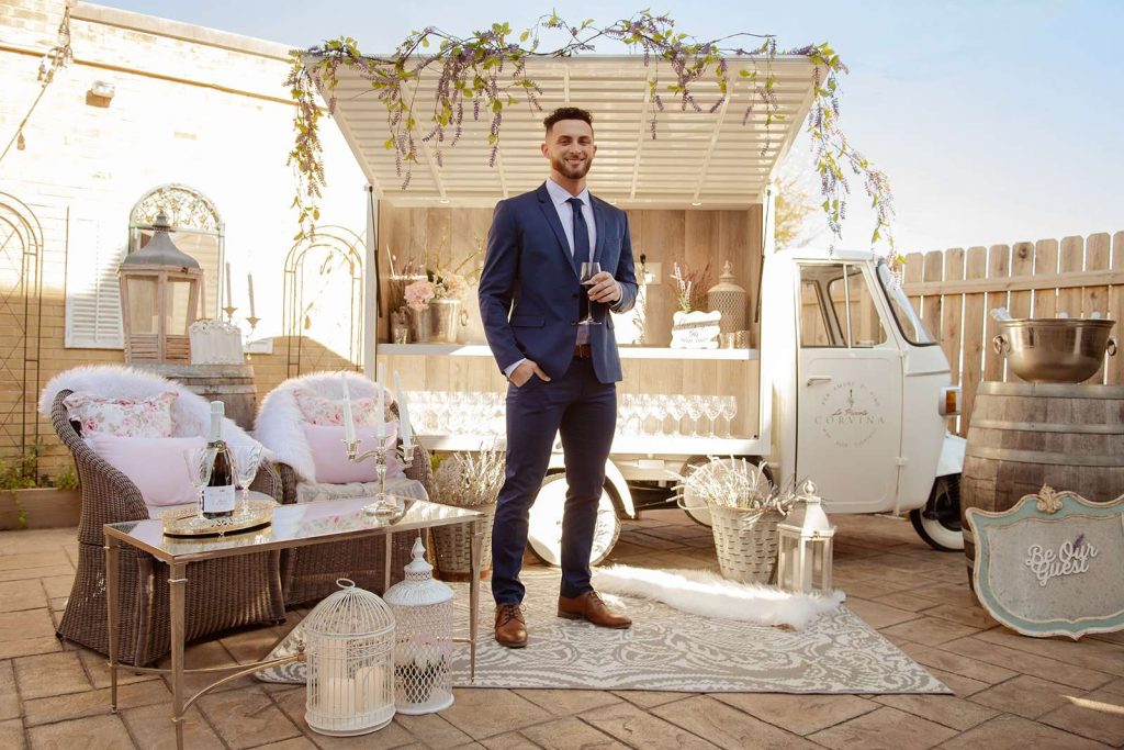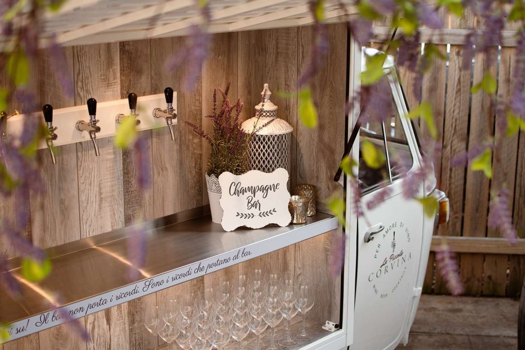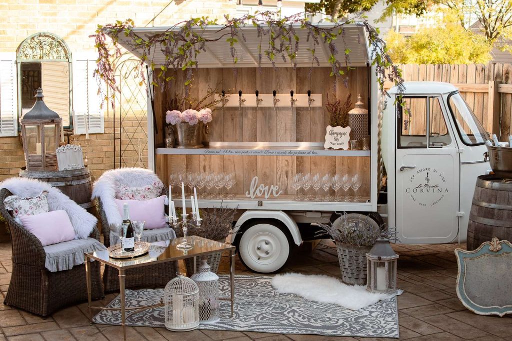 La Piccola Corvina served as the enchanting backdrop for a recent styled shoot at Corvina Wine Company, photographed by Reneé Rose. Gowns from Amelishan Bridal were beautifully accented with hair by Kristen Therrian and makeup by Esa and Melissa Yang. To lend some lovely dimension, soft hues of whites, creams, and rosy-pink blooms perfectly framed La Piccola Corvina, enhancing the light, airy vibe of the snow-white wine bar. The particular beauty of this mobile bar? White truly goes with anything—and any style of wedding.
