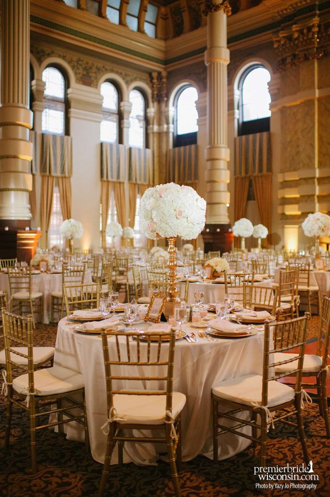 Nick and Taylor knew they wanted an elegant wedding. “We didn’t have a set theme, but we used specific colors to tie everything together. Gold, rose gold, and blush pink made the whole day romantic, feminine, and soft.” Custom invitations went out from QBCheck Designs (“Laura was the best to work with!”) for a ceremony at the Villa Terrace Decorative Arts Museum and a reception at the Grain Exchange.