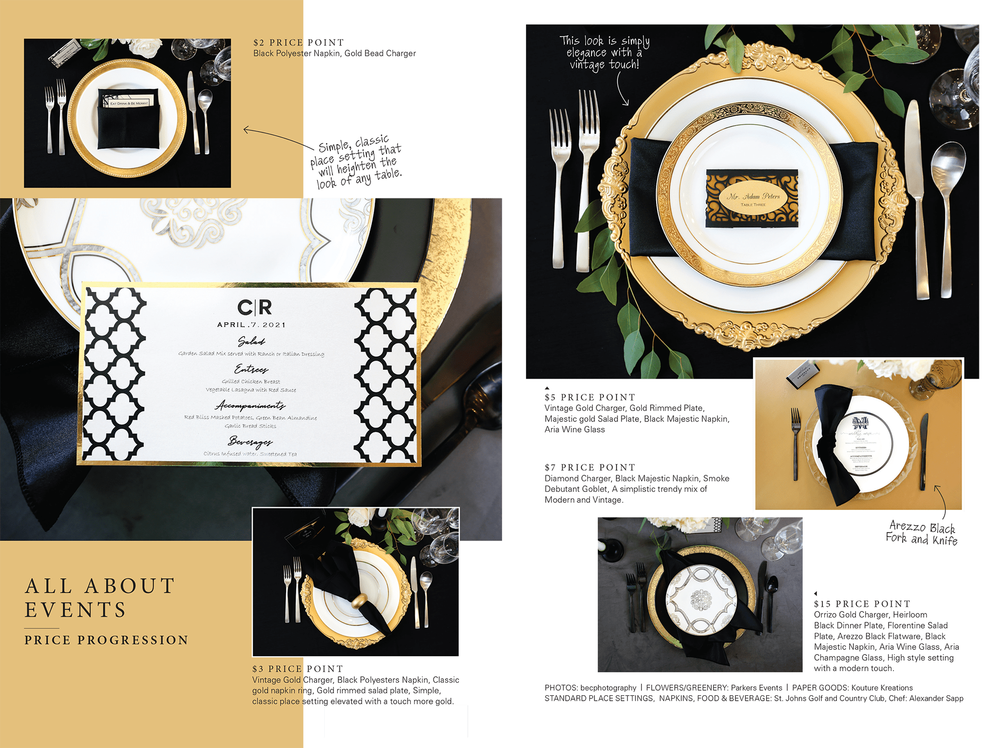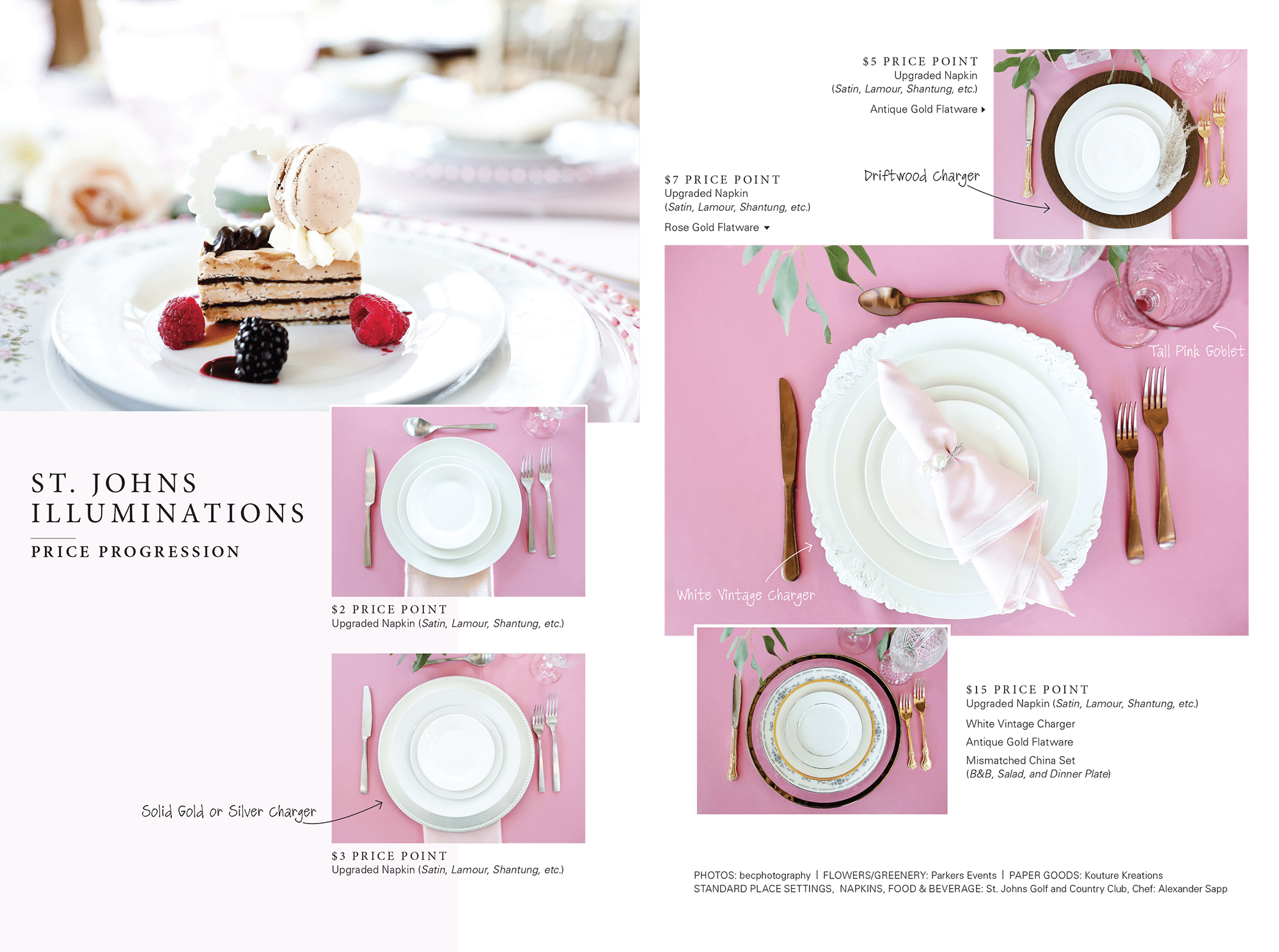All About Events created the black and gold place settings, St. Johns Illuminations created the pink place settings and Event Works created the blue place settings. Each rental company was tasked with creating looks with a $2, $3, $5, $7 and unlimited price point per table setting. The intention is to illustrate how you can change the look of our table by integrating special napkins, fancy dinner plates, unique flat wear, colored water glasses, napkin rings and/or stylized chargers. If you become inspired, make sure you budget for place setting décor.