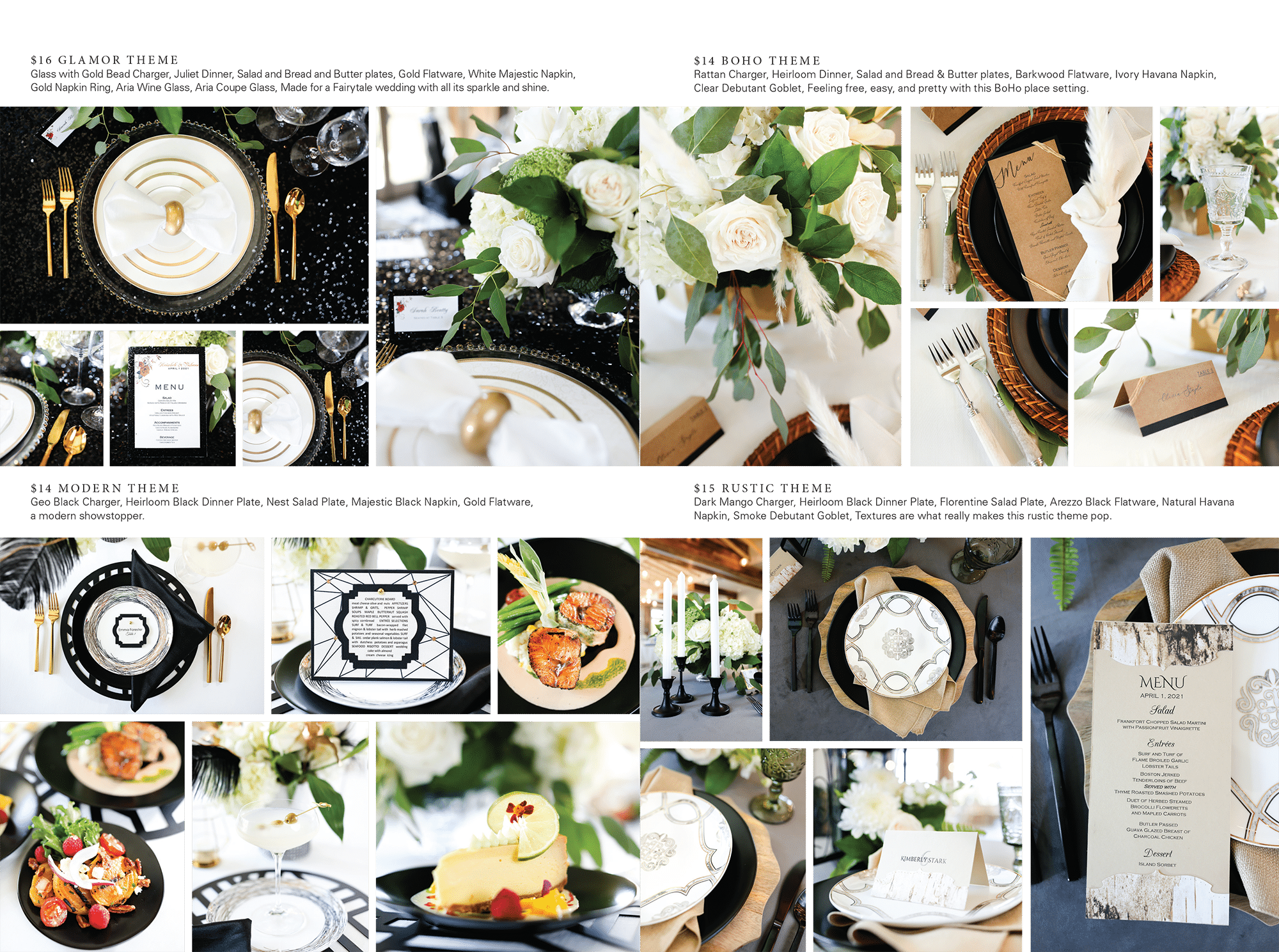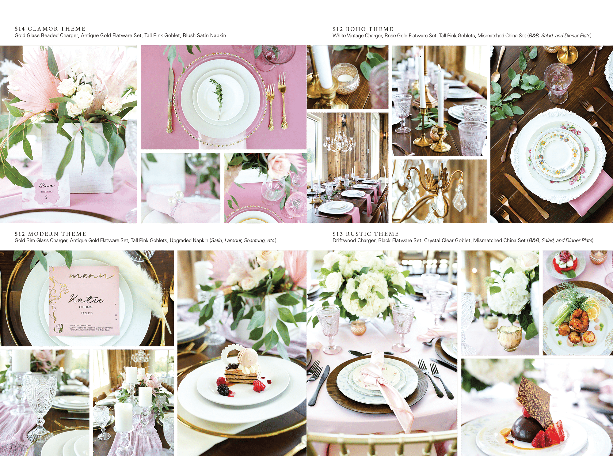 This pictorial is going to lead you through a succession of price points per place setting and themes. When you work with a rental company, wedding planner, florist and/or catering company they will help you to design your customized place settings and establish a budget for your vision.