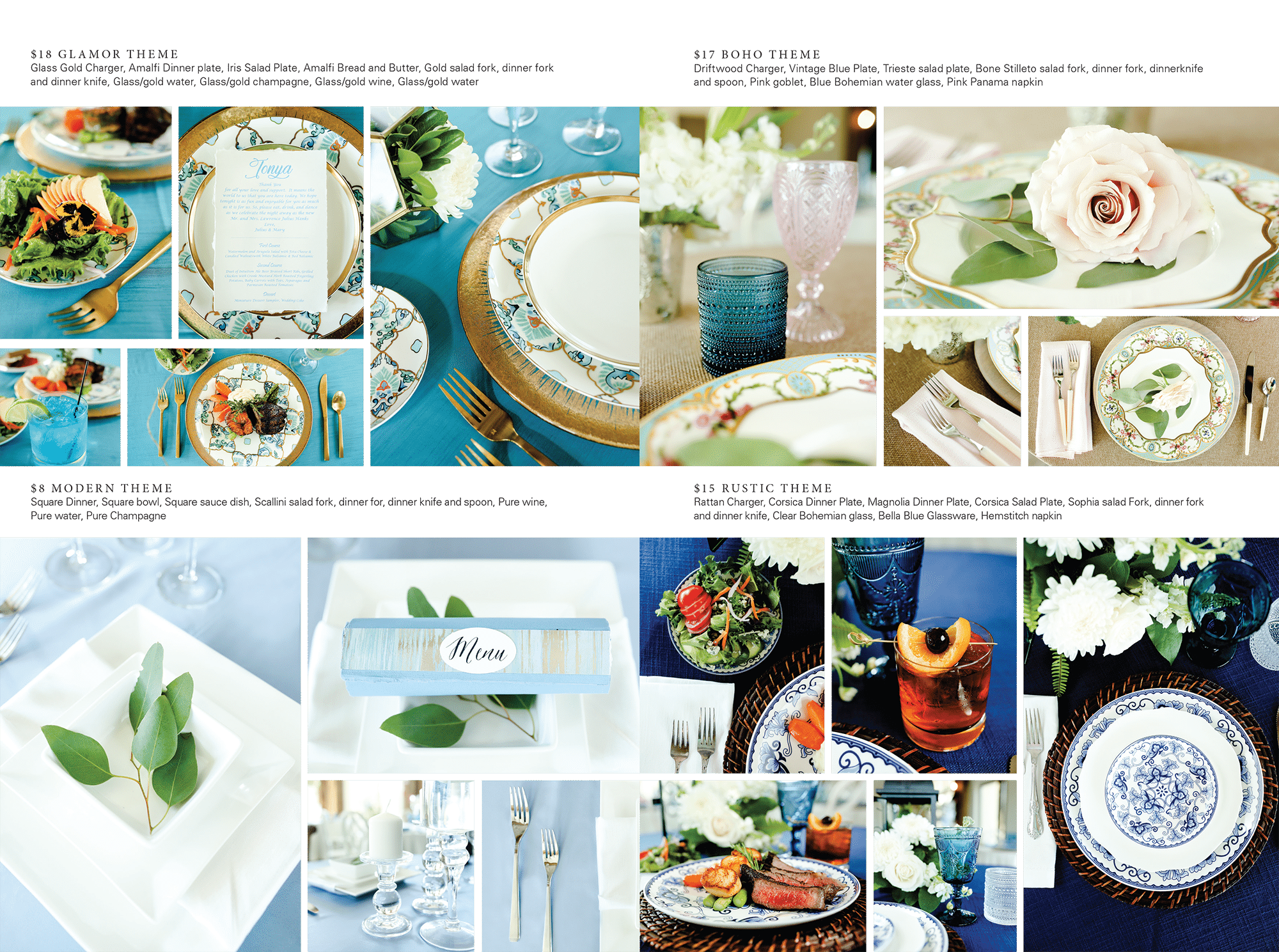 Not included in the price points are the flowers, greenery, paper goods or table cloths. Each company was given the standard china, glasses, white napkin and flatware that is included at St. Johns Golf and Country Club. Also included in the place setting designs were four looks with the themes; Boho, Glamor, Modern and Rustic. They were allowed to create these looks with an unlimited budget per table setting. When planning your place setting look, make sure you find out what is included by your catering company and/or venue with your rental. Tips on creating budget friendly place settings: