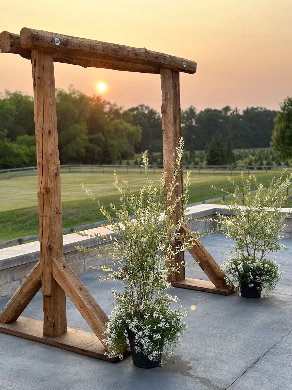 Rustic tables + chairs, whiskey barrels, wedding arch & more
