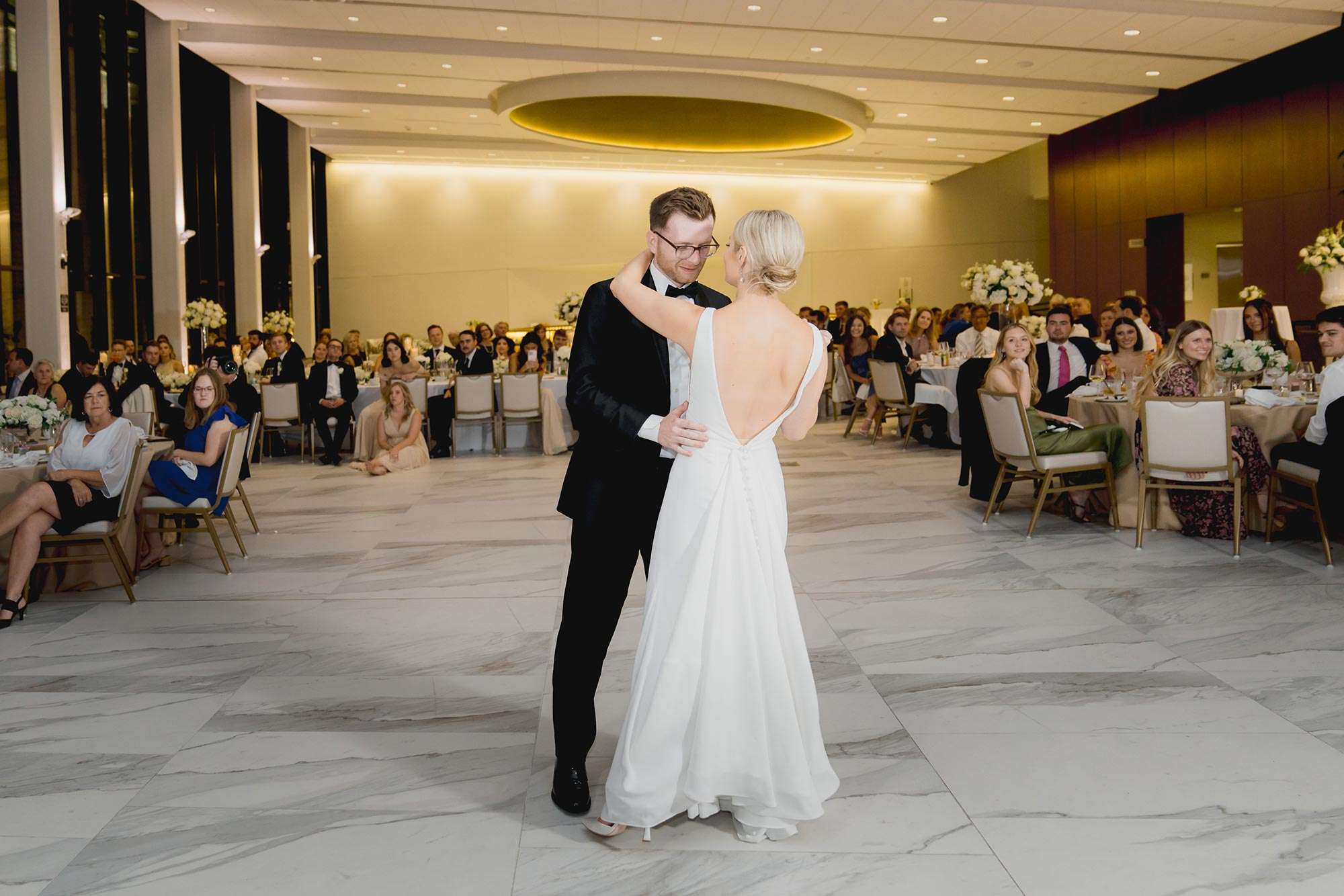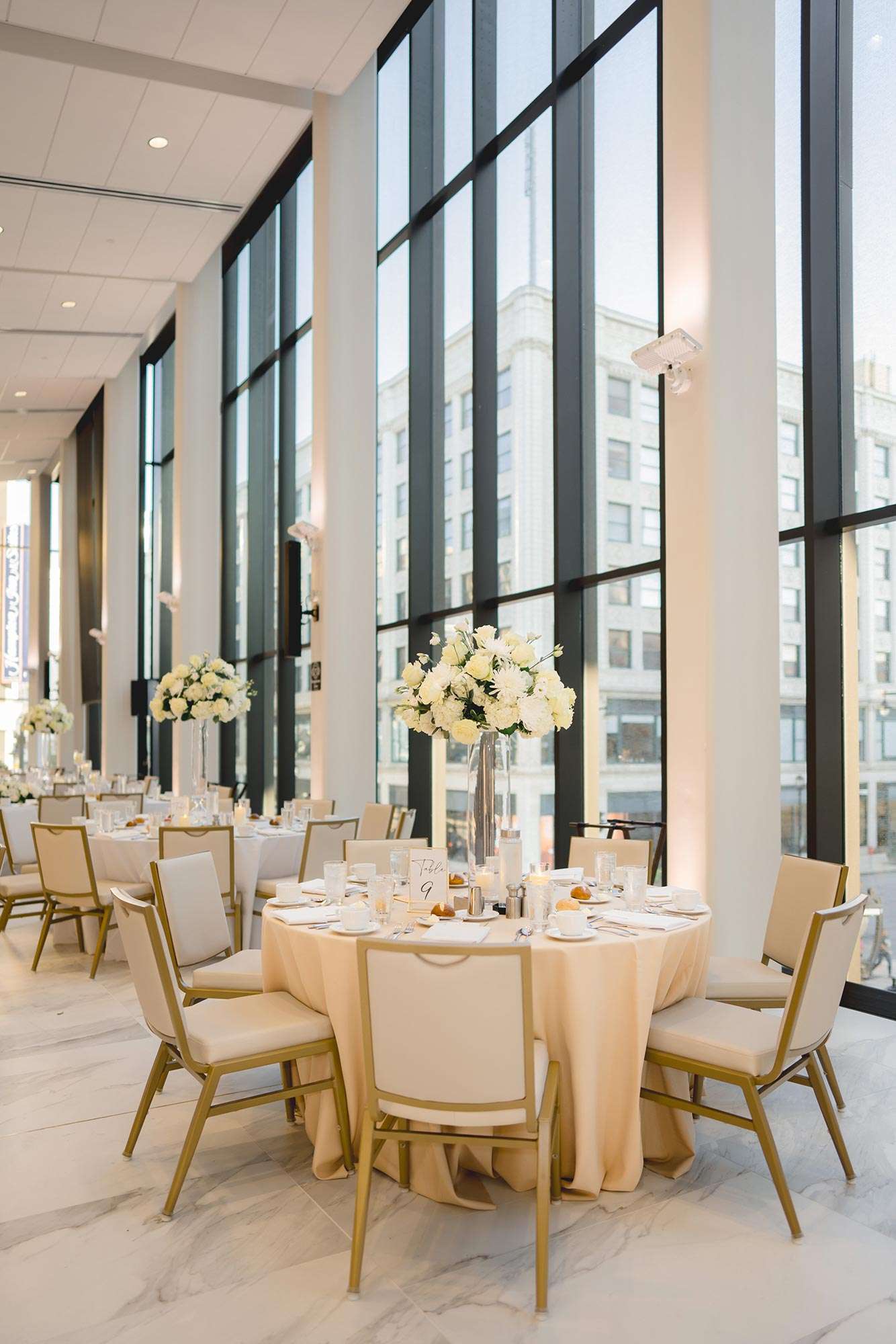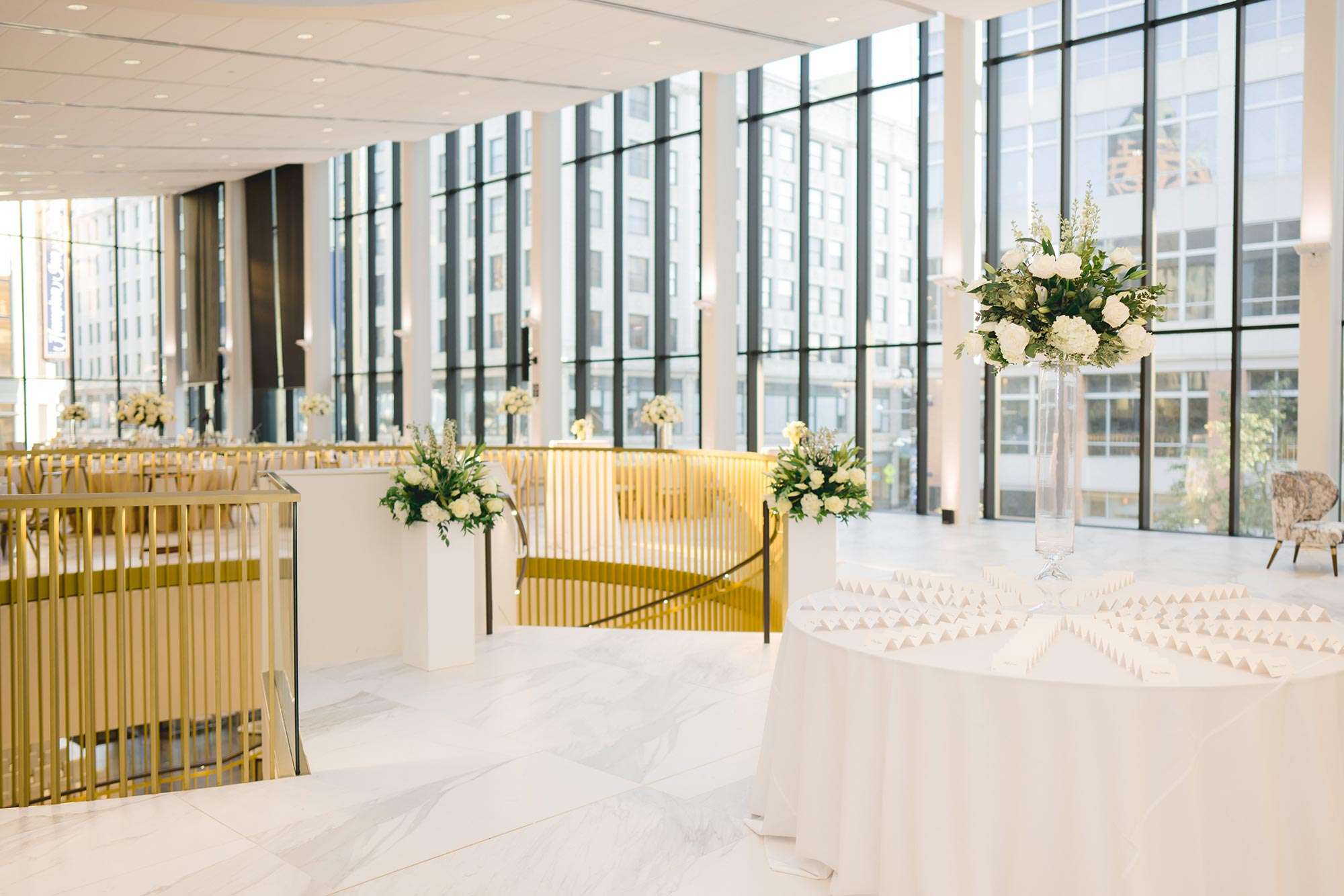 The Bradley Symphony Center – formerly the Warner Theater, a lavish 1931 movie palace – was restored and made home to the Milwaukee Symphony Orchestra in 2021. The Art Deco design of the original theater pairs well with the modern and classic design of the new event space located in the Ellen & Joe Checota Pavilion of the Bradley Symphony Center. The Gallery, located on the first floor, features a wall of windows facing Wisconsin Avenue, which brings the energy of downtown Milwaukee into the space. We think this makes for a perfect location for a cocktail hour or ceremony space. From there, have your guests go to the second floor Atrium to enjoy floor to ceiling windows and dramatic views of downtown Milwaukee from above.