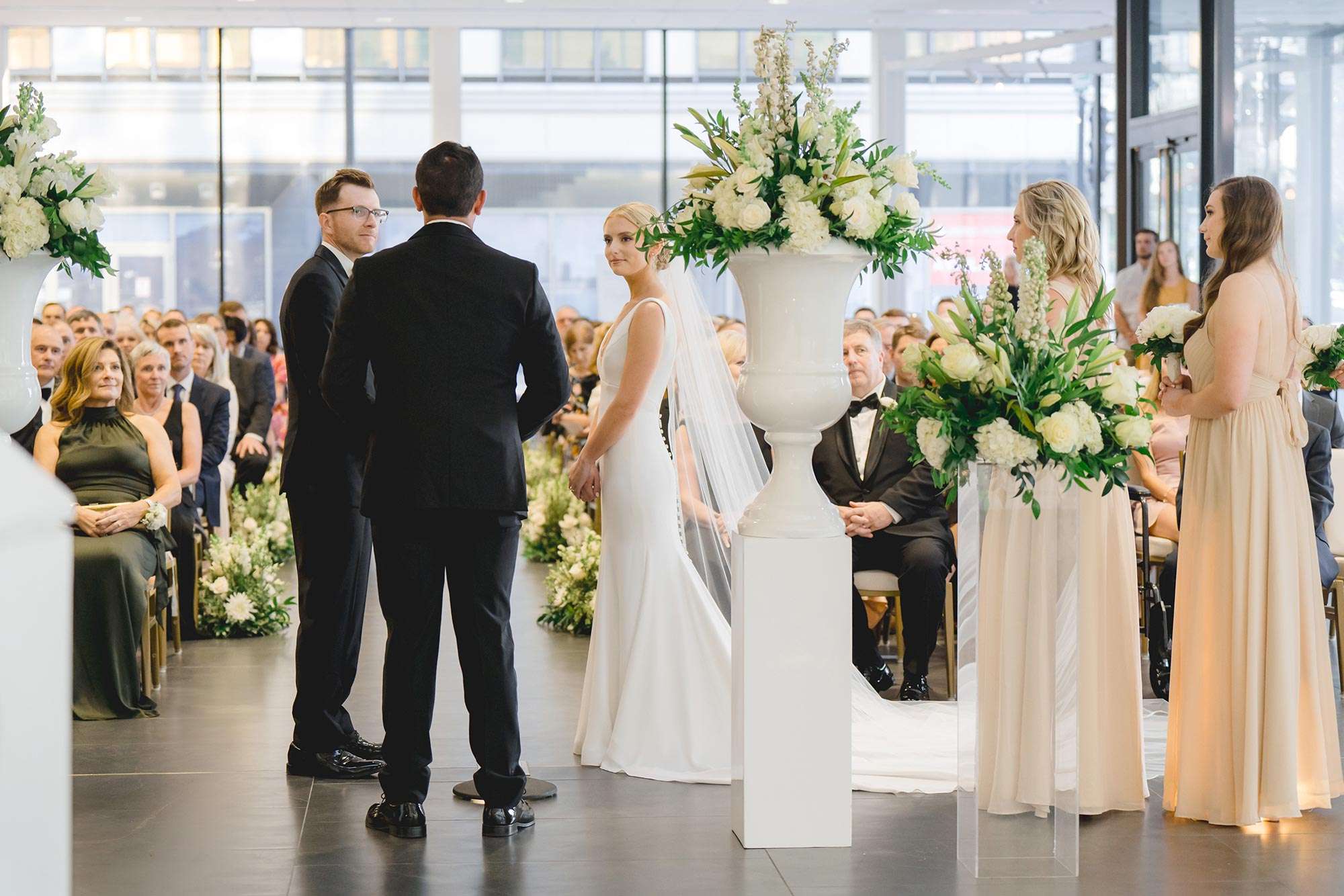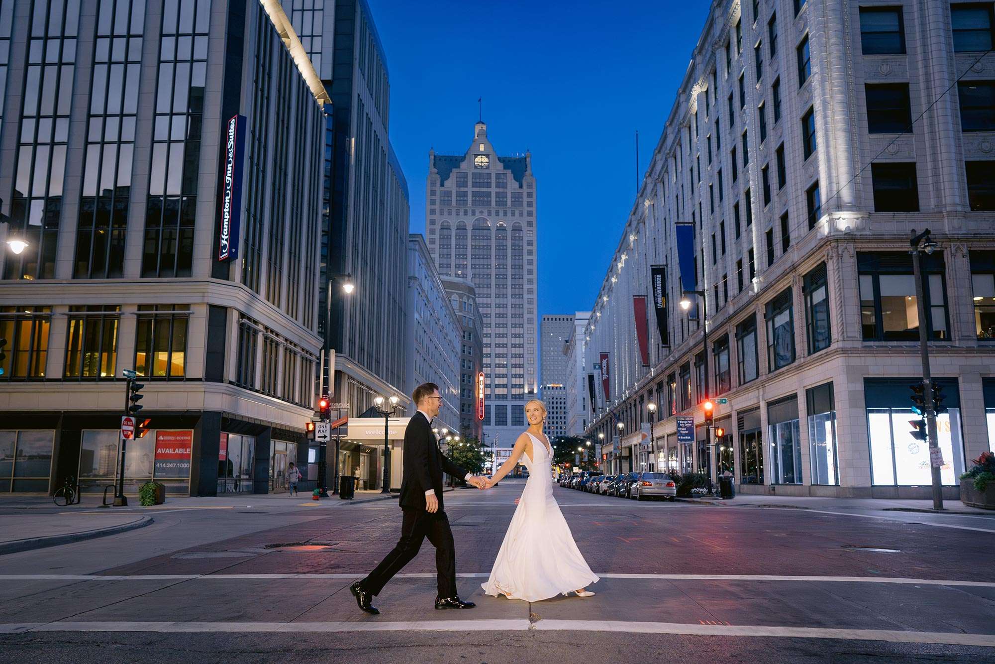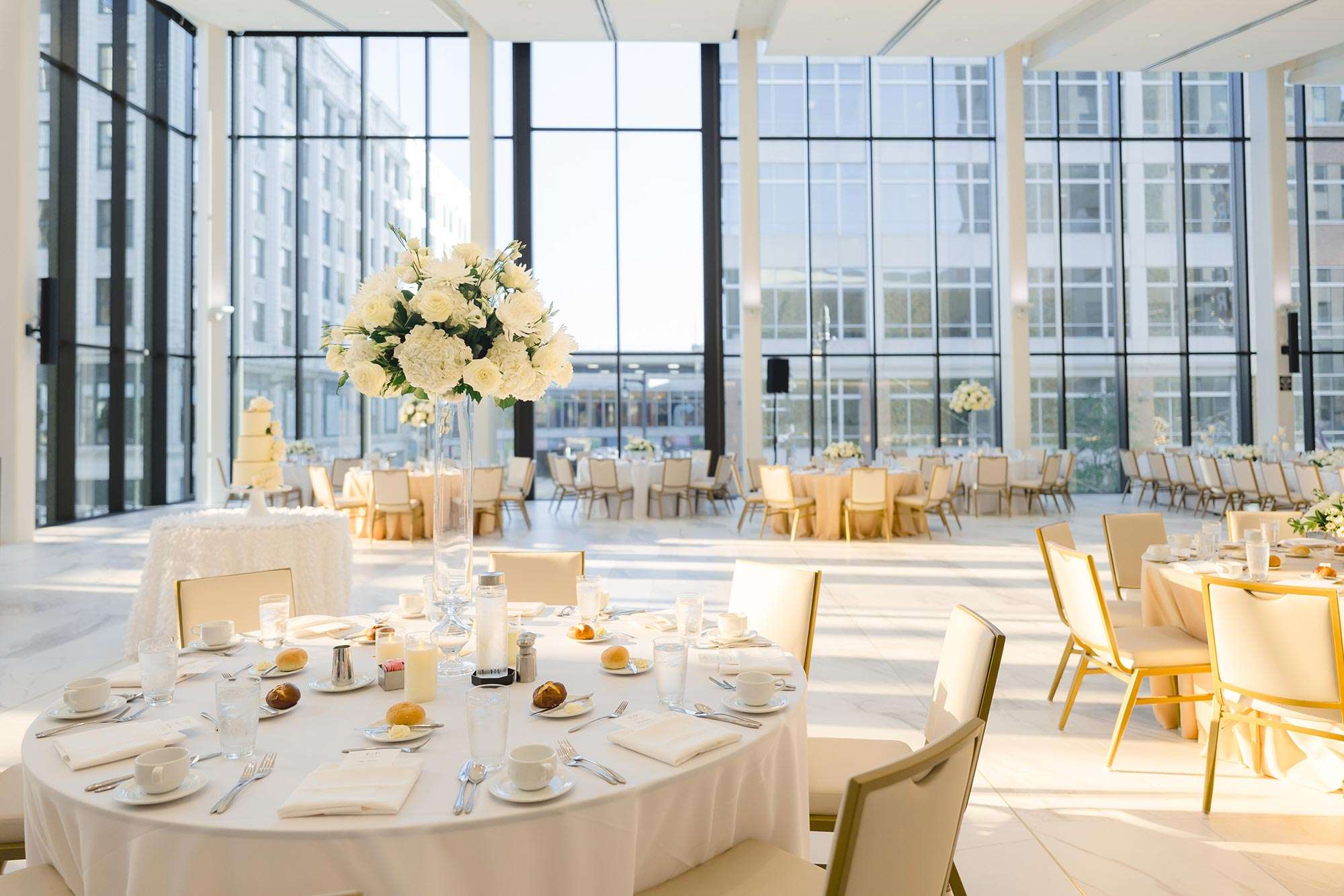 The Bradley Symphony Center – formerly the Warner Theater, a lavish 1931 movie palace – was restored and made home to the Milwaukee Symphony Orchestra in 2021. The Art Deco design of the original theater pairs well with the modern and classic design of the new event space located in the Ellen & Joe Checota Pavilion of the Bradley Symphony Center. The Gallery, located on the first floor, features a wall of windows facing Wisconsin Avenue, which brings the energy of downtown Milwaukee into the space. We think this makes for a perfect location for a cocktail hour or ceremony space. From there, have your guests go to the second floor Atrium to enjoy floor to ceiling windows and dramatic views of downtown Milwaukee from above.