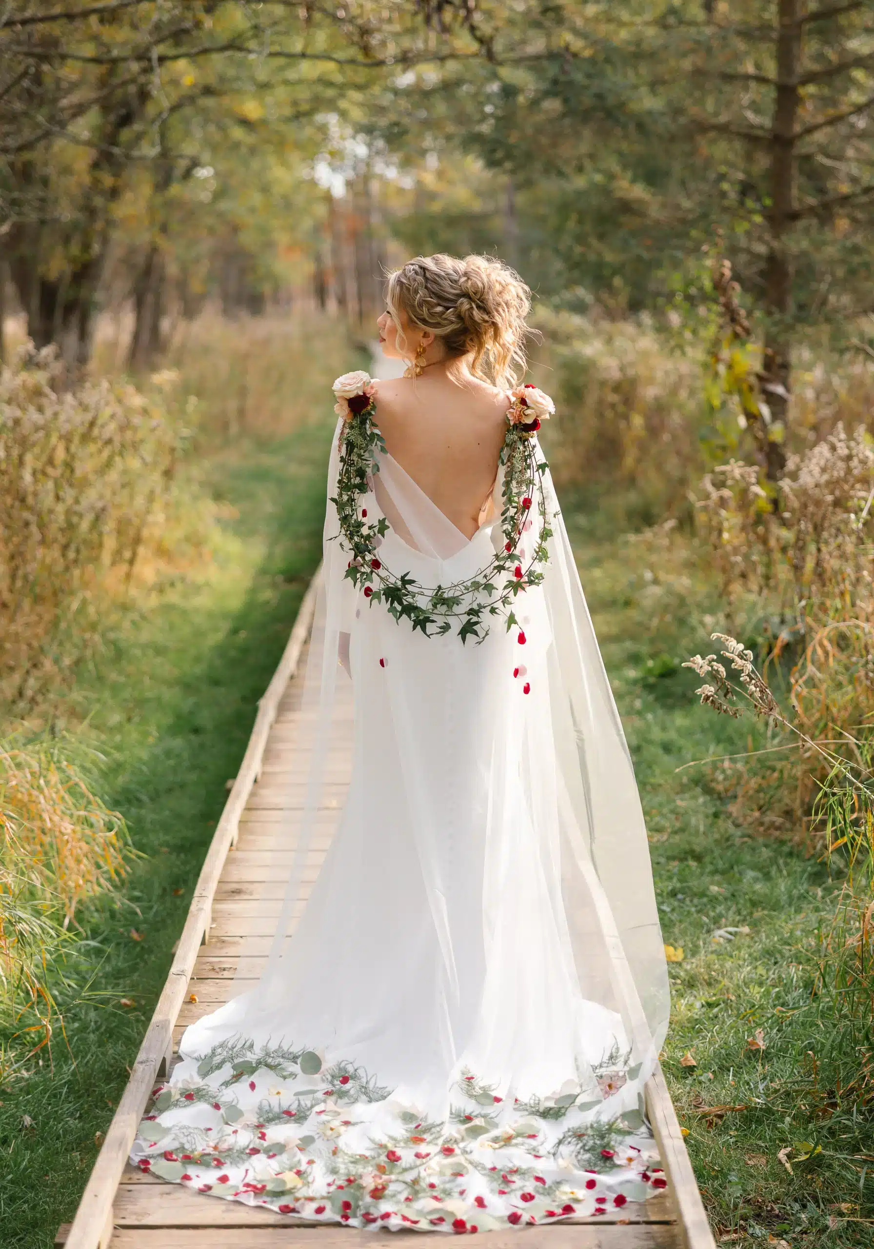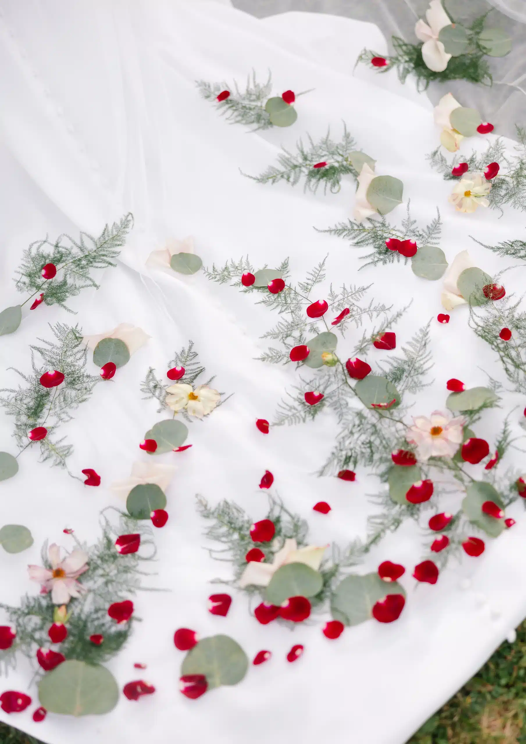 One of the most memorable details was the custom floral cape. Draped across the bride’s shoulders, it added a unique, fashion-forward element to the day while still tying into the overall floral story. The trailing greenery and touches of red gave it movement and just enough contrast to stand out, showing how florals can go beyond bouquets and décor.