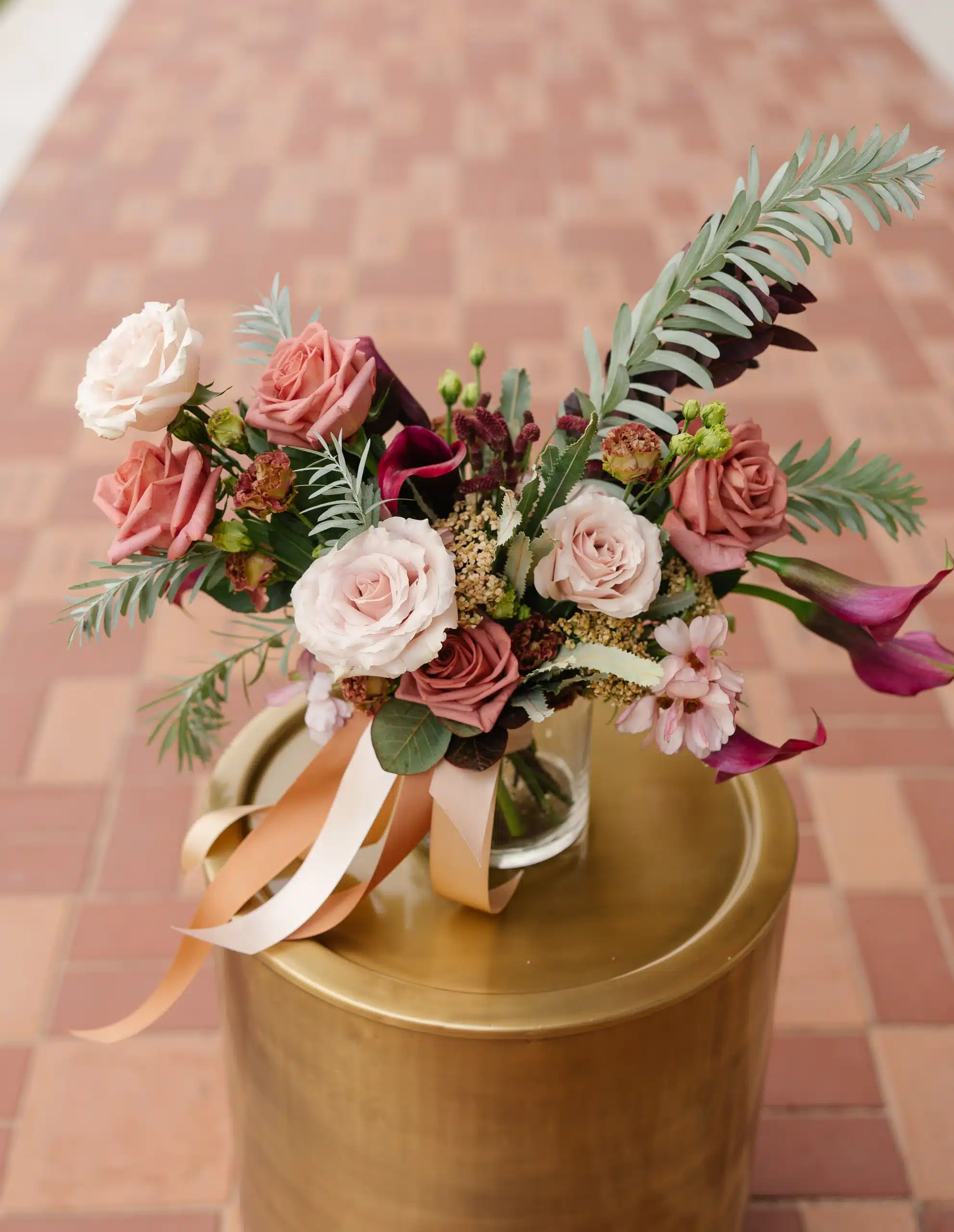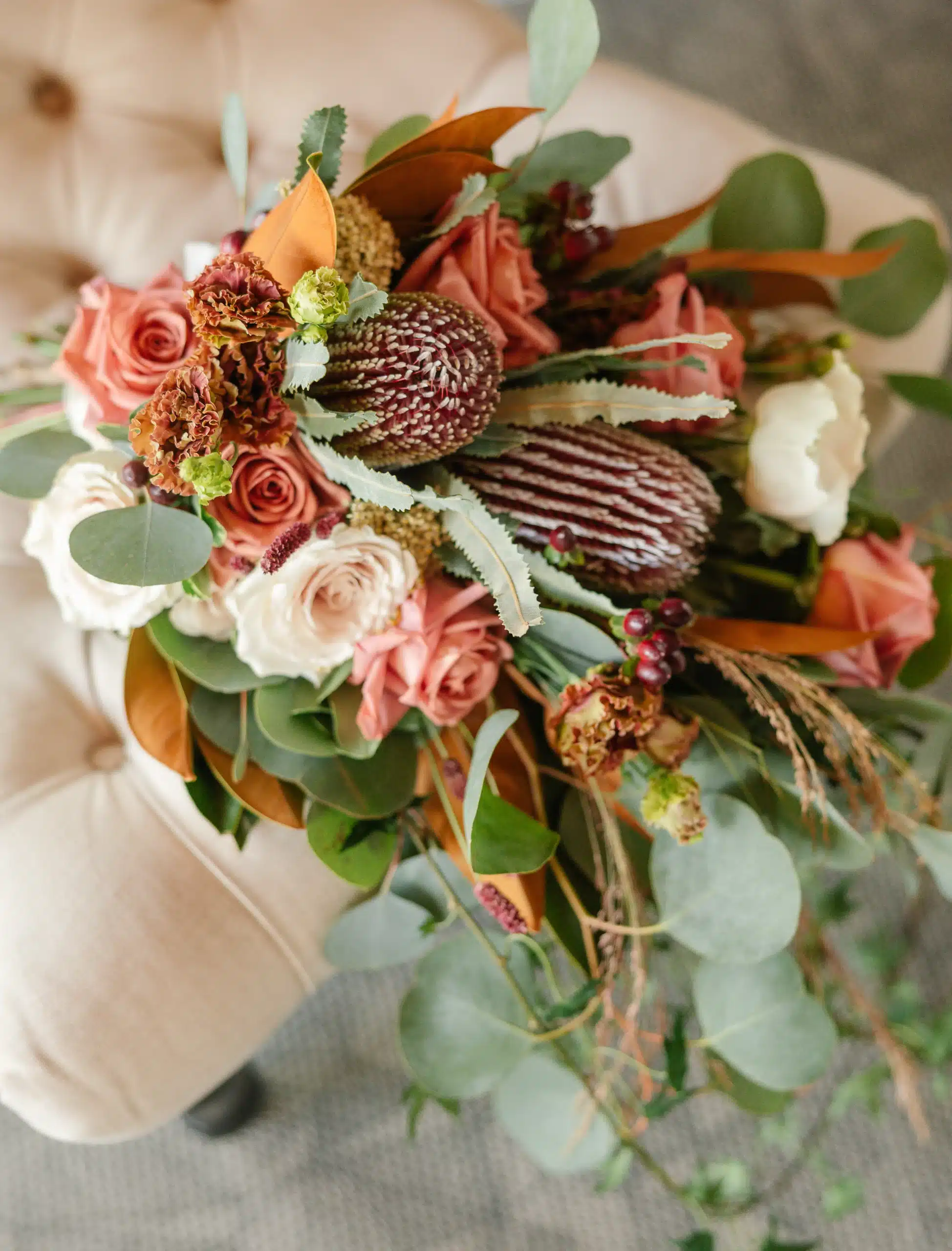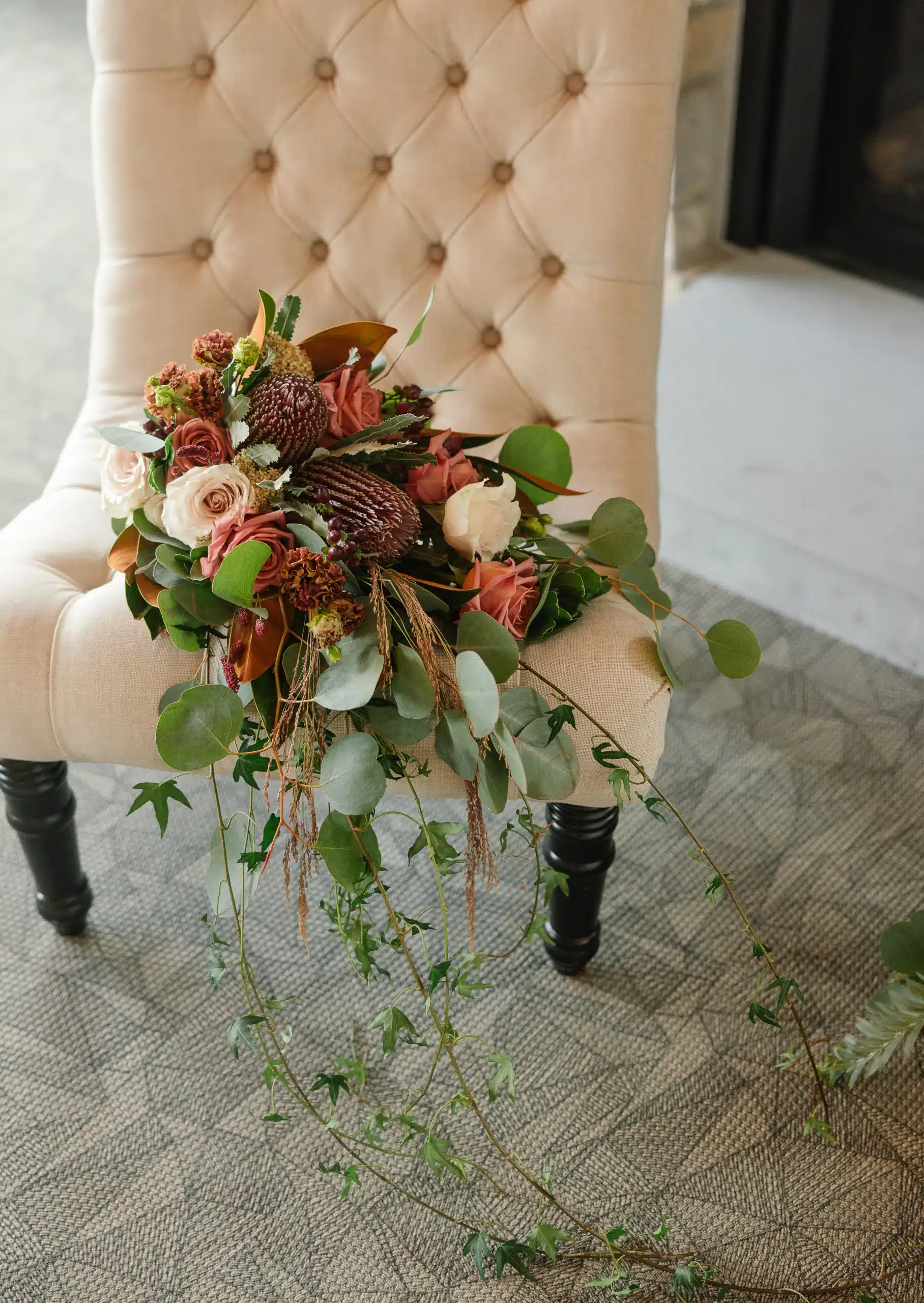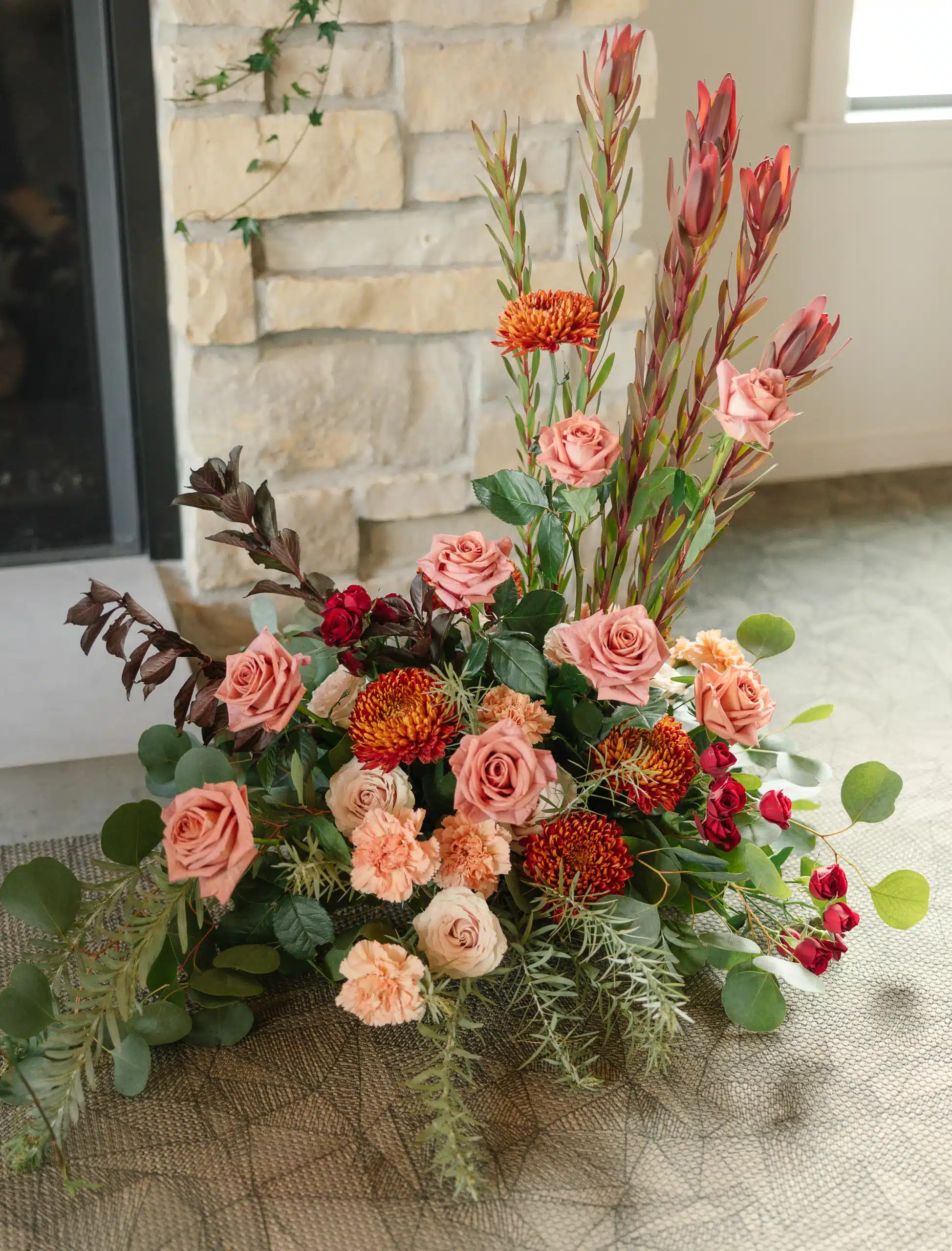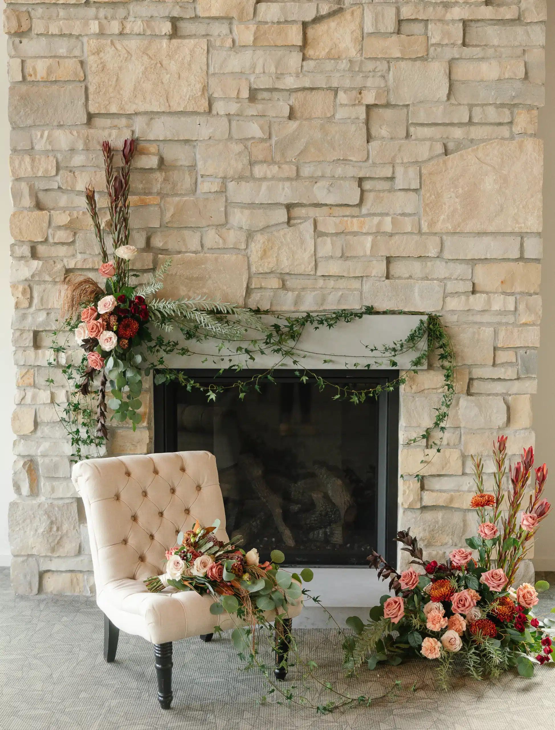Inside the lodge, the fireplace became a focal point for the design. Belle Fiori created a grounded, organic installation with arrangements along the hearth, bringing warmth and color into the space without overpowering it. The mix of soft sepia tones and bold burgundy accents paired beautifully with the stone, creating a cozy and inviting setting that could easily translate into a ceremony or reception backdrop.